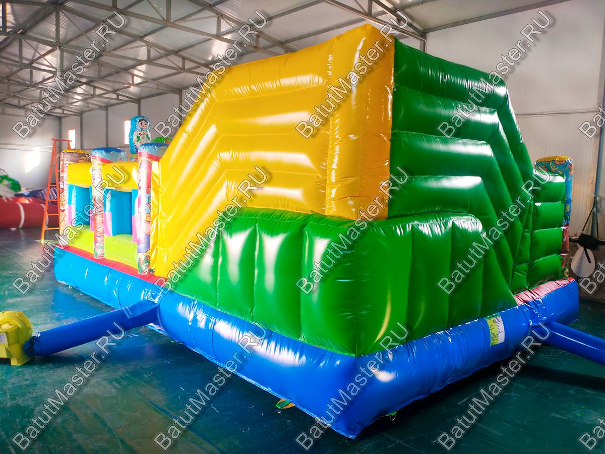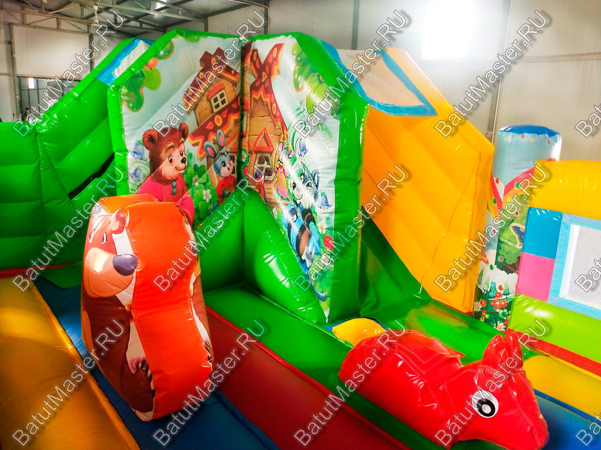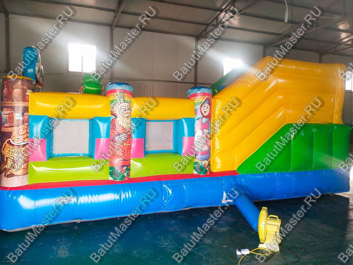 Открытый батут «Русские сказки» входит в категорию – детское надувное оборудование для ведения развлекательного бизнеса. Популярность аттракциона позволяет использовать его в парках, развлекательных центрах, игровых площадках и других местах массового скопления детей. Для того чтобы посетителям было весело и интересно в надувную конструкцию включены следующие элементы:
