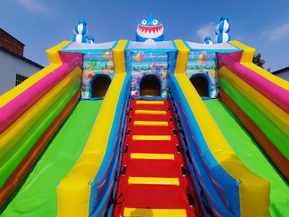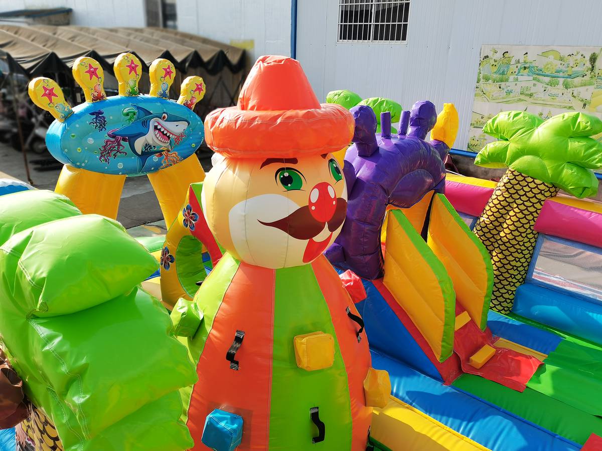 Огромную роль играют и декорации. Конструкция украшена разнообразными фигурами, будь то пальмы или огромная зубастая акула на вершине горки. Всё это ещё больше влияет на воображение детей. Внутри батута детей ждут надувные игровые фигуры, красочная арка, скалодромы, ну и конечно, большие горки с лесенкой по центру.