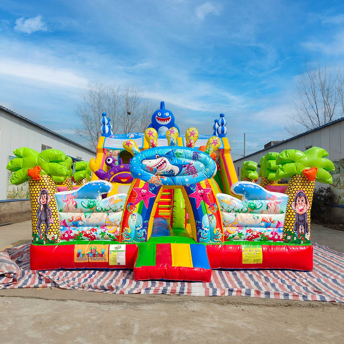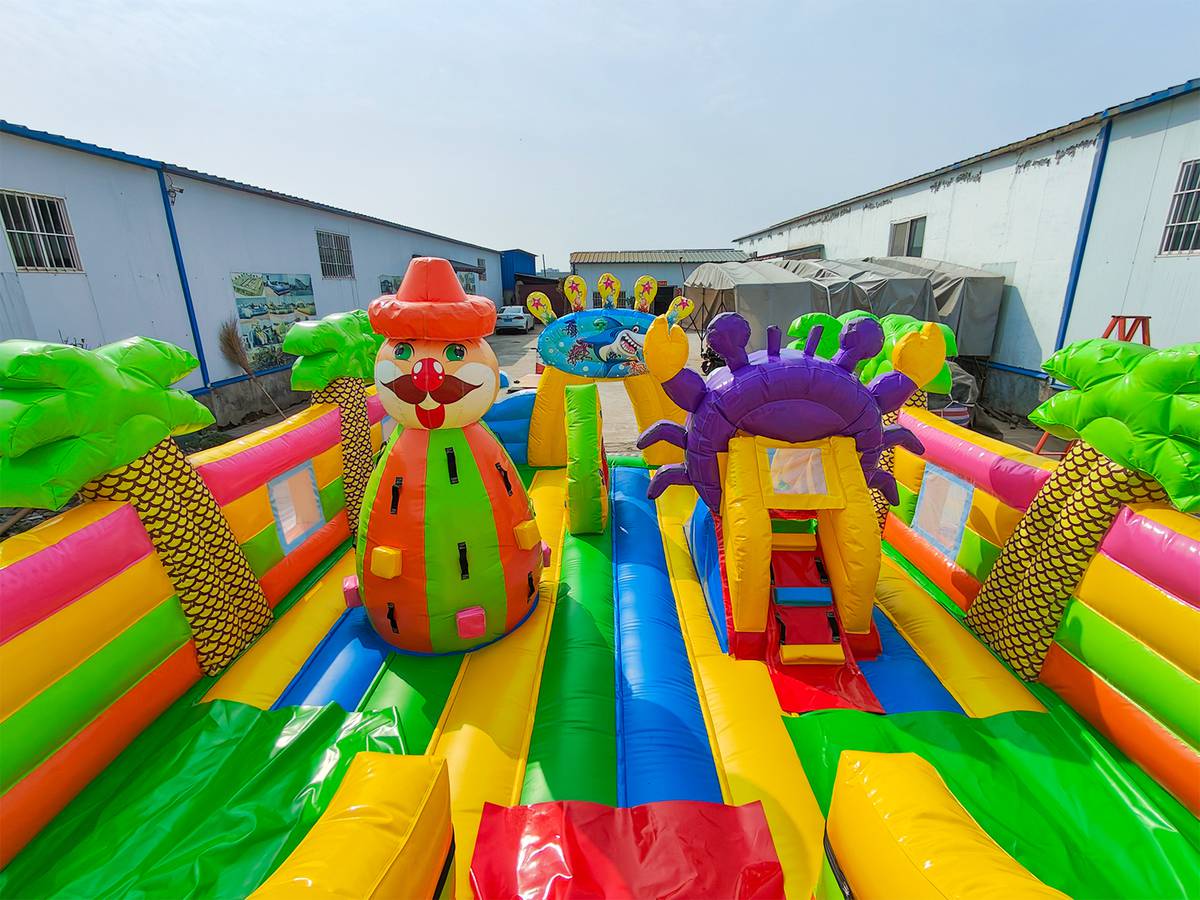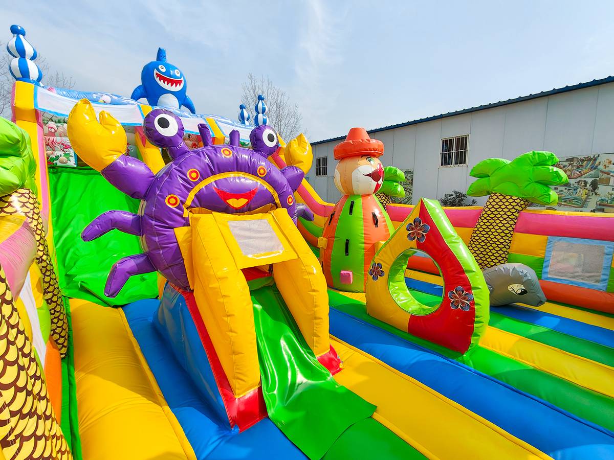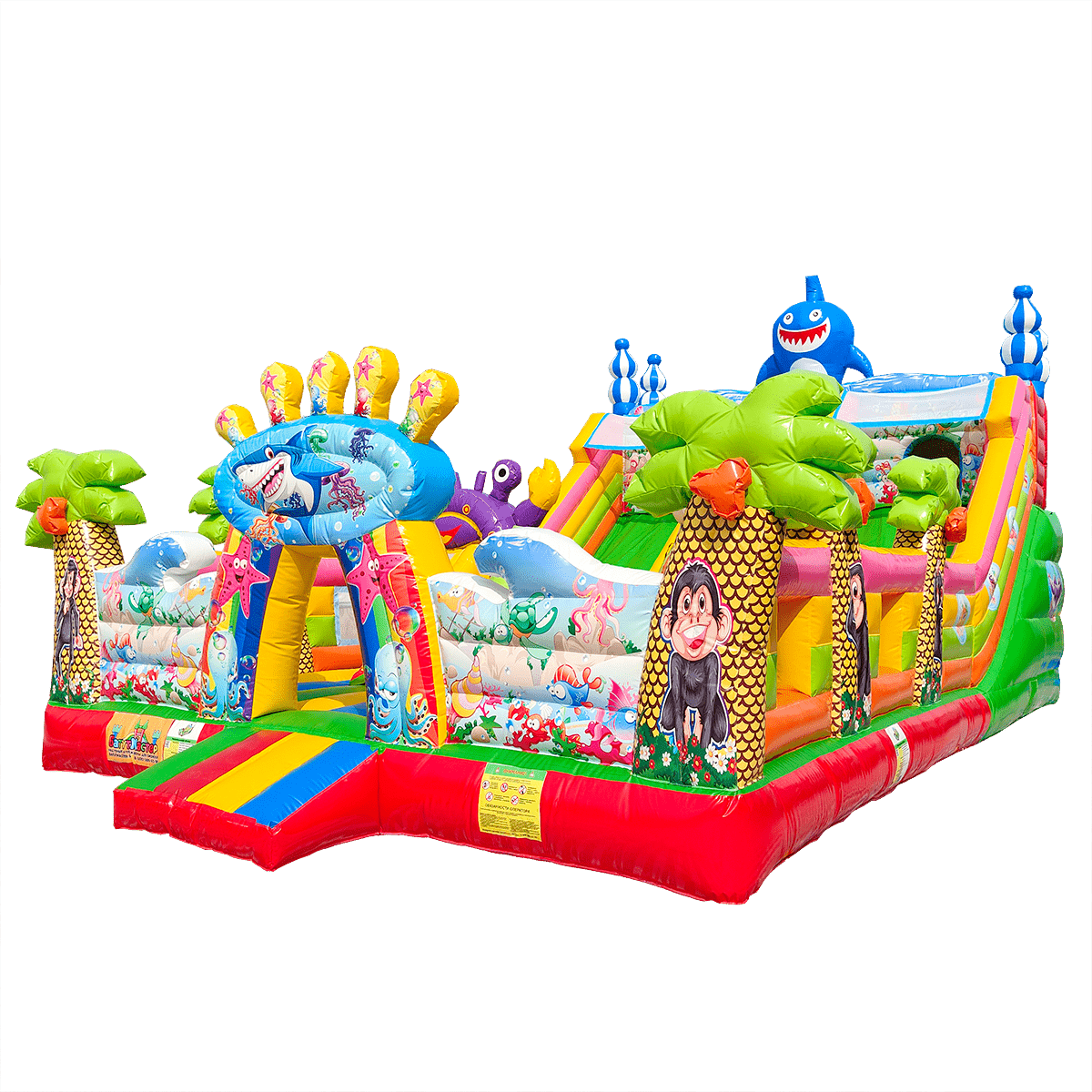 Надувной батут «В гостях у моря» представляет собой большой игровой комплекс с многочисленными надувными модулями в виде морских жителей. Здесь есть круглый модуль, наверху которого размещен осьминог. На данный модуль можно забираться, хватаясь за прочные ремни. Играть можно веселой командой и даже забираться наперегонки. Несколько горок с домиками, в которых можно играть в прятки. Надувное кольцо, тоннель и другие интересные надувные фигуры в виде морских рыб, крабов, акул и других. Снаружи комплекс украшен надувными пальмами и рисунками.
