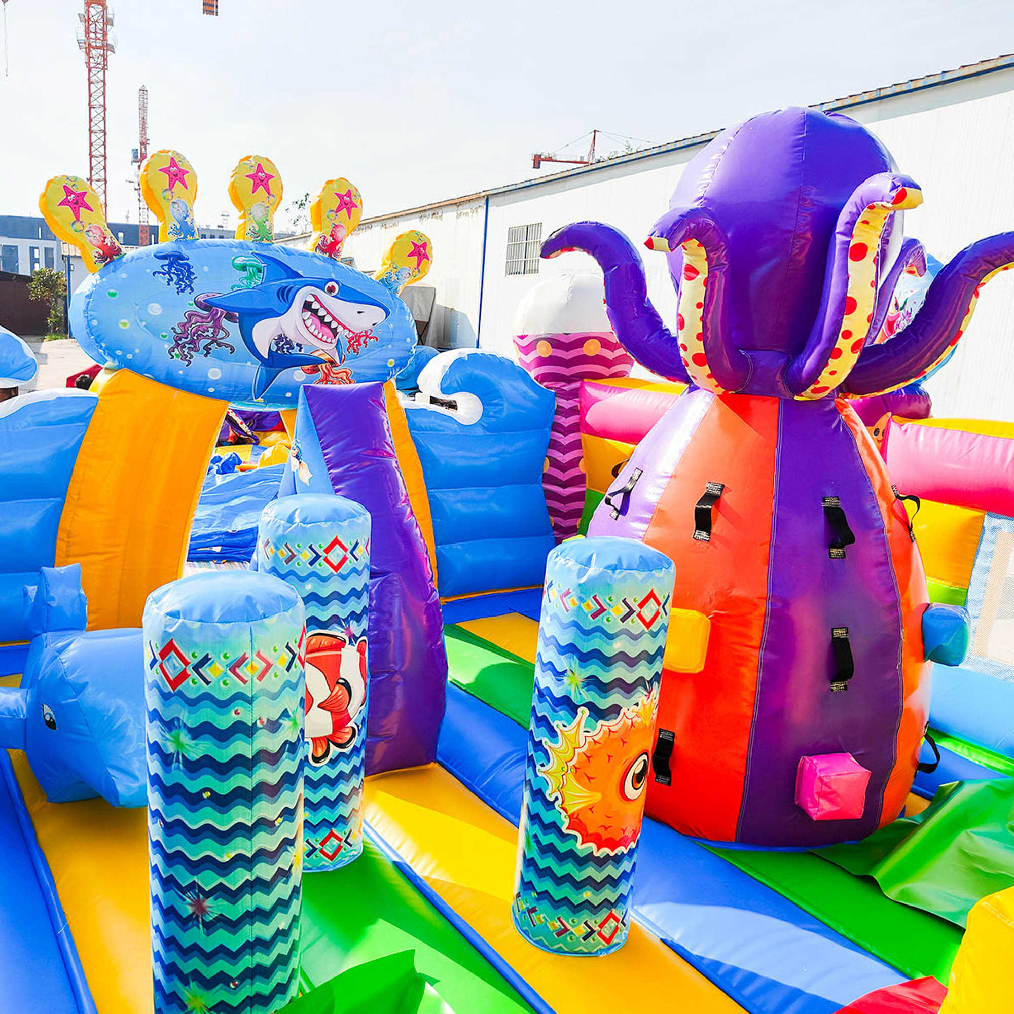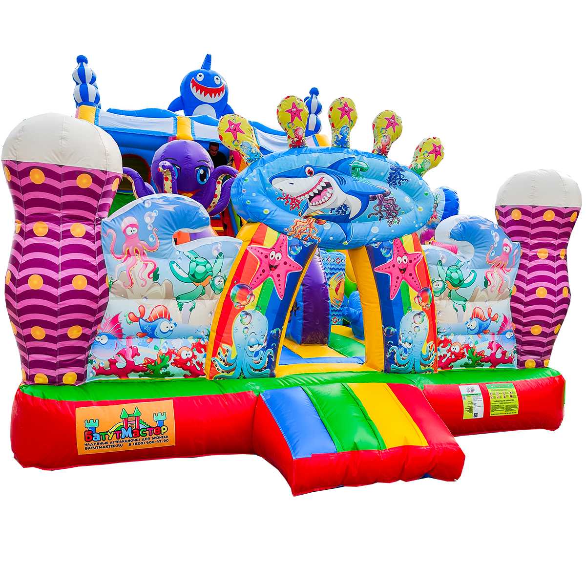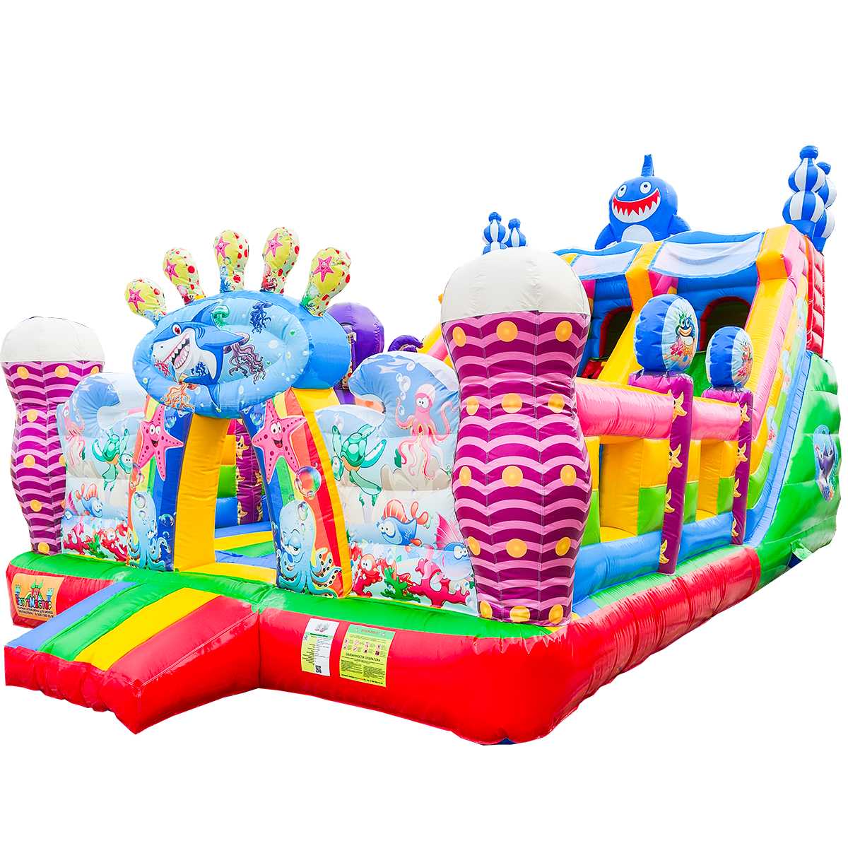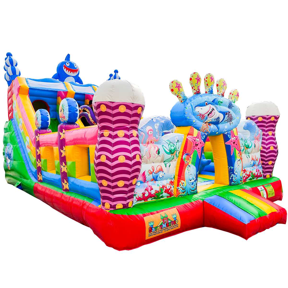 В самом центре коммерческого батута установлен скалодром в виде конуса оранжево-зеленого цвета и розовый смешарик, стоящий на небольшой горке для самых маленьких. Нижней площадки хватит вполне для целой команды юных путешественников, а надувная горка отлично подойдет для тех, кто посмелее и старше. Вход в аттракцион украшен высокой аркой в виде короны с изображением акулы. Морские жители в аттракционе встречаются повсюду, поэтому площадка сшита из отличного поливинилхлорида в морском стиле.