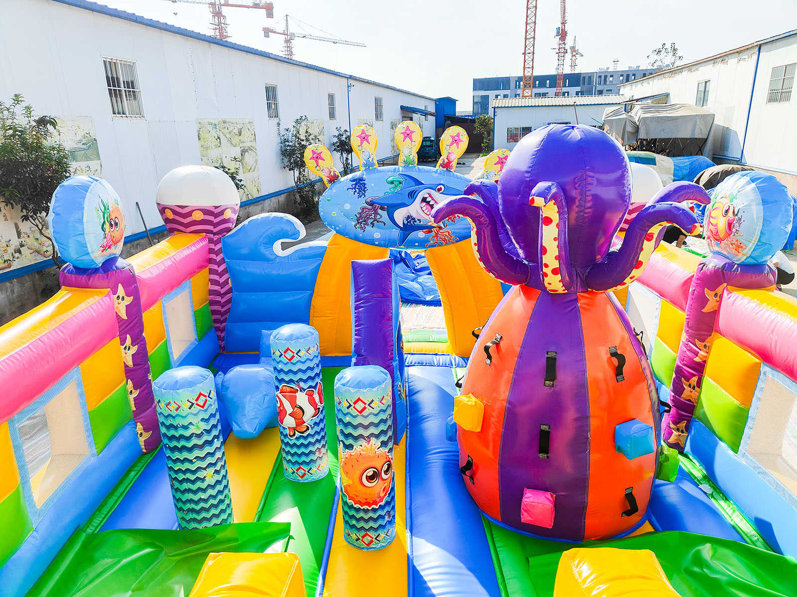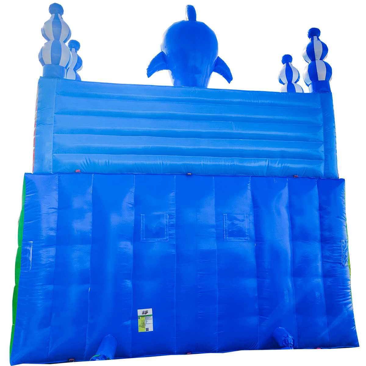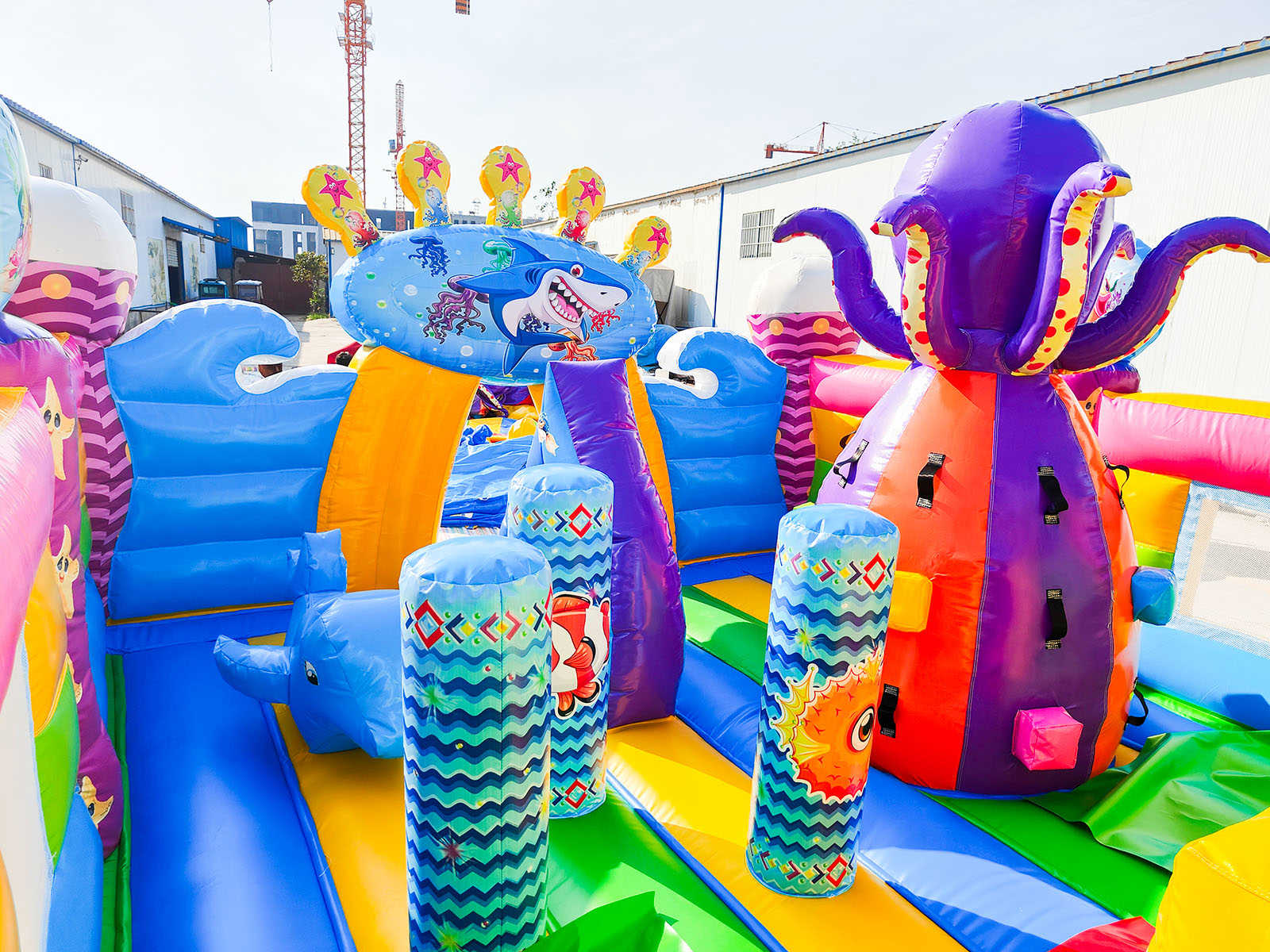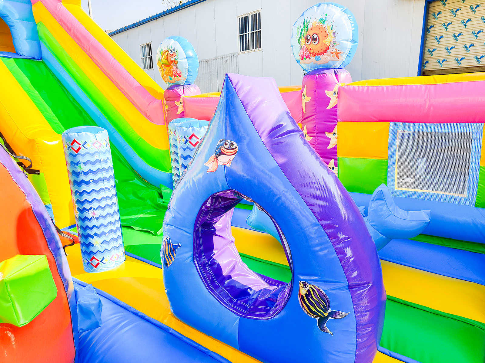 В самом центре коммерческого батута установлен скалодром в виде конуса оранжево-зеленого цвета и розовый смешарик, стоящий на небольшой горке для самых маленьких. Нижней площадки хватит вполне для целой команды юных путешественников, а надувная горка отлично подойдет для тех, кто посмелее и старше. Вход в аттракцион украшен высокой аркой в виде короны с изображением акулы. Морские жители в аттракционе встречаются повсюду, поэтому площадка сшита из отличного поливинилхлорида в морском стиле.