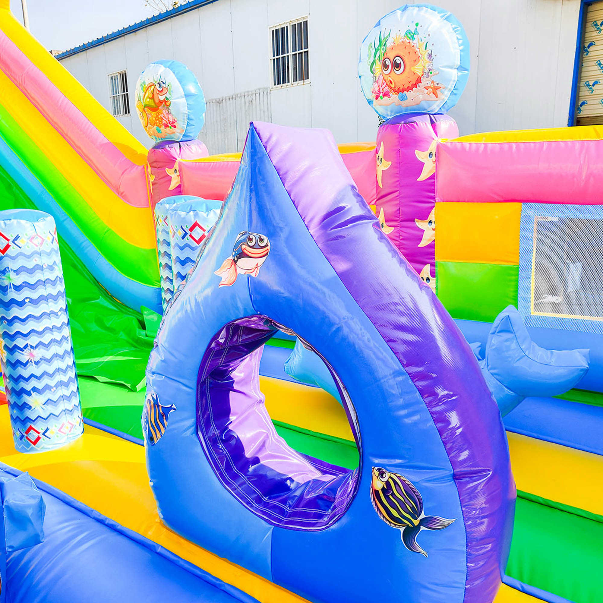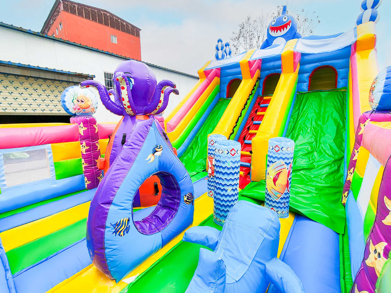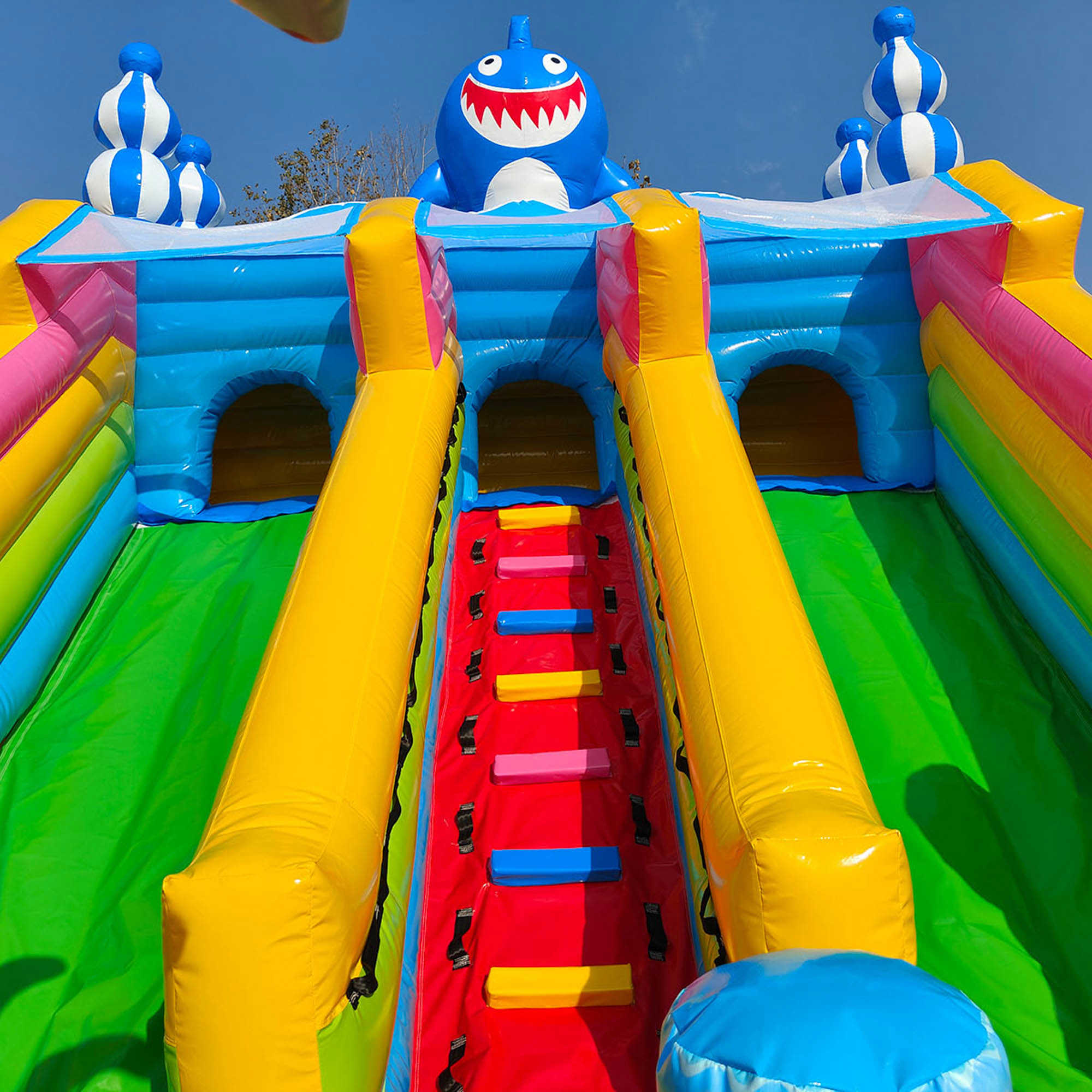 Яркий батут не может быть увлекательным и интересным без надувной горки, поэтому в этом аттракционе присутствует широкий подъем на всю ширину площадки. На самом верху образуется закрытое пространство в виде туннеля, благодаря ему можно выбирать с какого именно спуска посетитель хочет спуститься, а также здесь можно спрятаться от дождя, поиграть или отдохнуть от солнца. Вся площадка украшена надувными фигурами в виде огромных рыб, башень, пальм и просто забавных человечков.