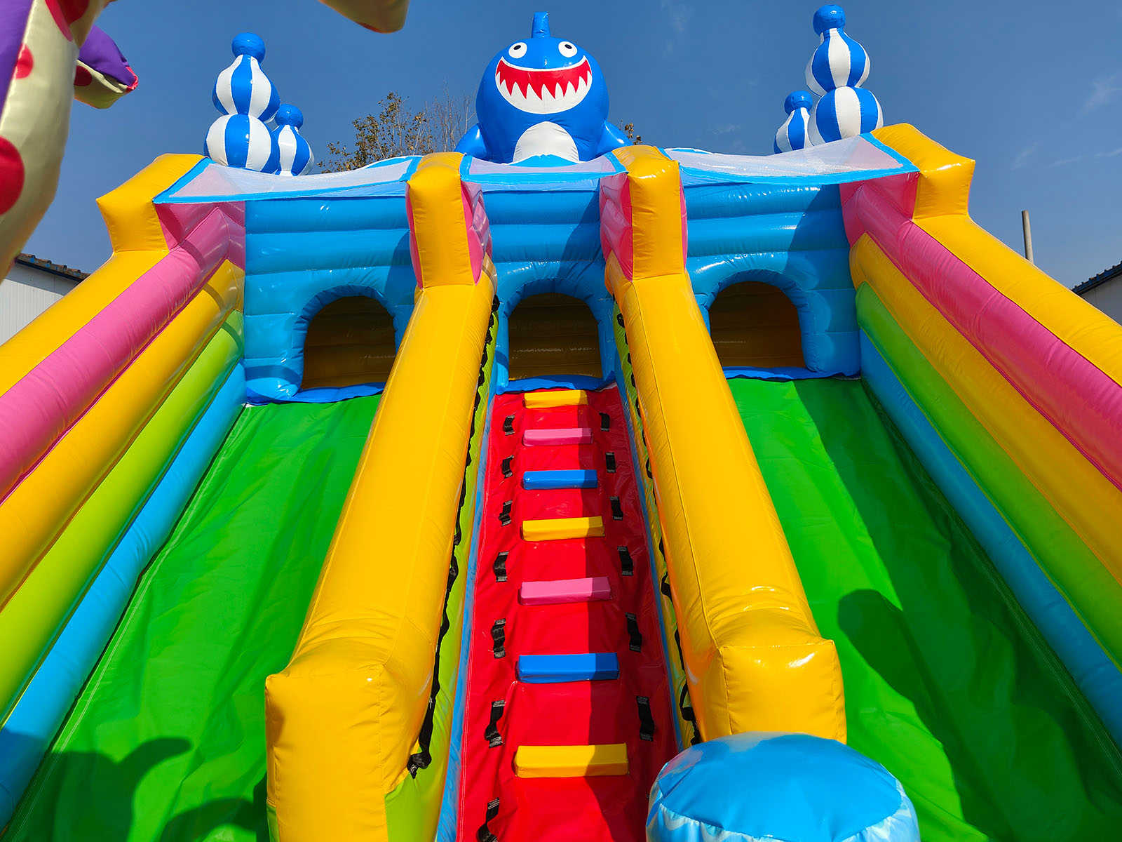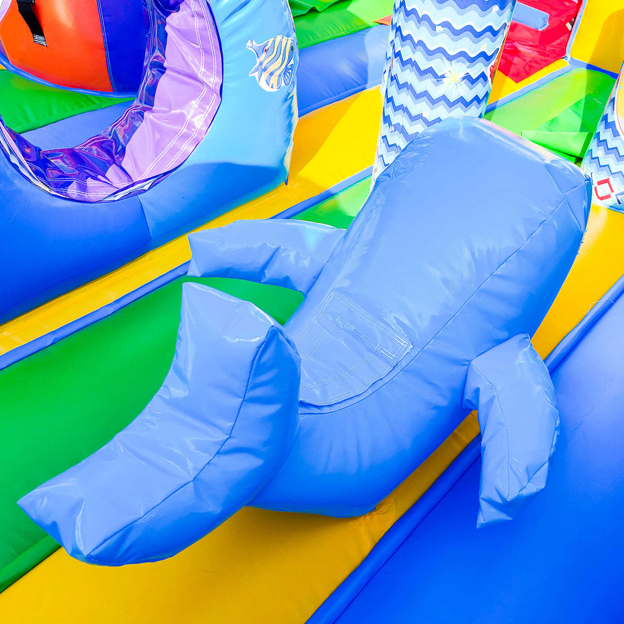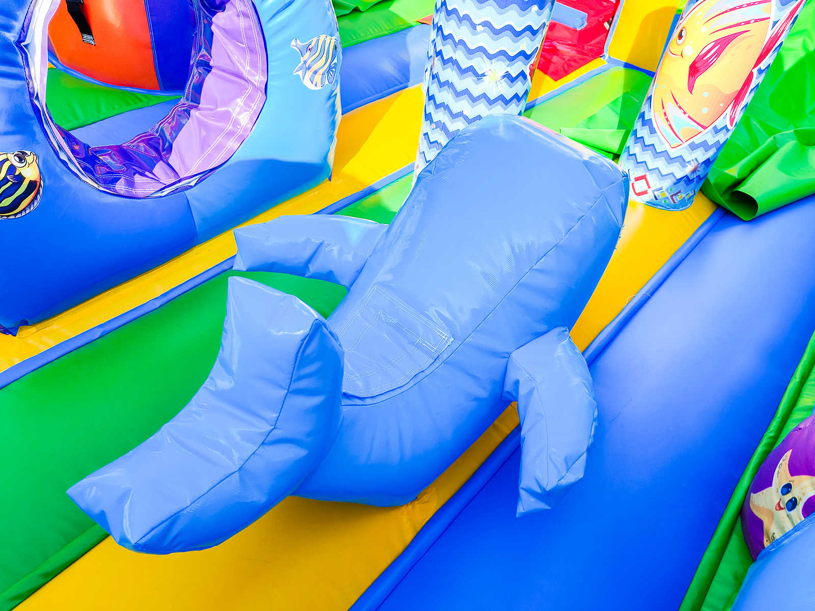 Яркий батут не может быть увлекательным и интересным без надувной горки, поэтому в этом аттракционе присутствует широкий подъем на всю ширину площадки. На самом верху образуется закрытое пространство в виде туннеля, благодаря ему можно выбирать с какого именно спуска посетитель хочет спуститься, а также здесь можно спрятаться от дождя, поиграть или отдохнуть от солнца. Вся площадка украшена надувными фигурами в виде огромных рыб, башень, пальм и просто забавных человечков.