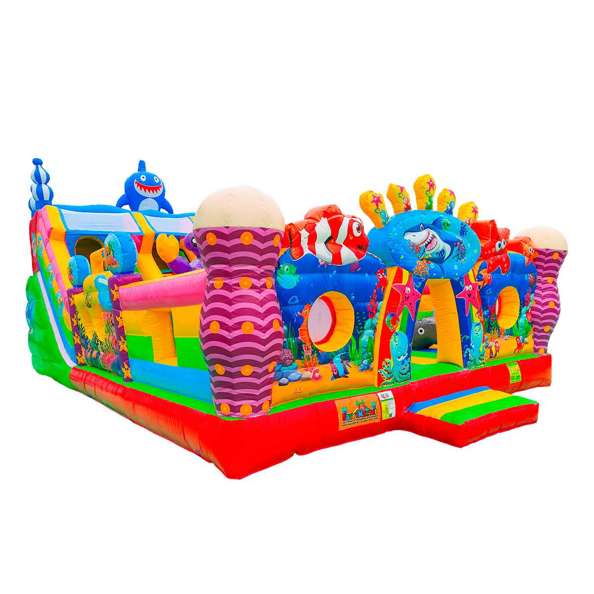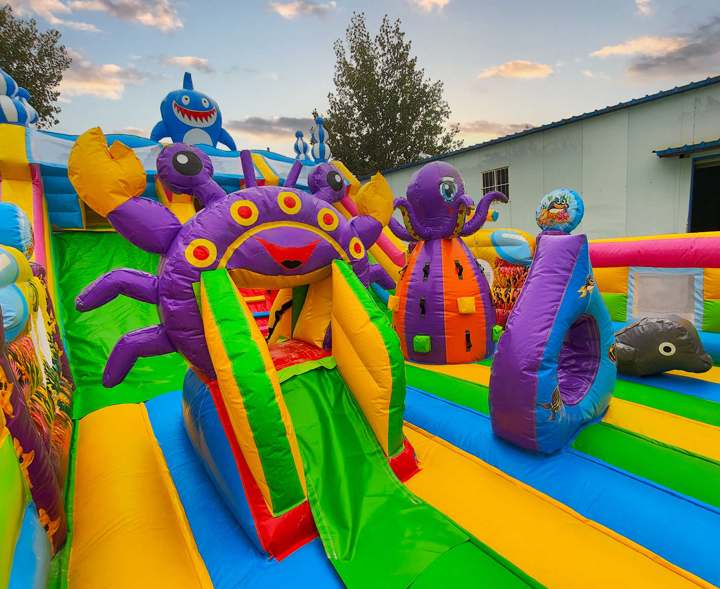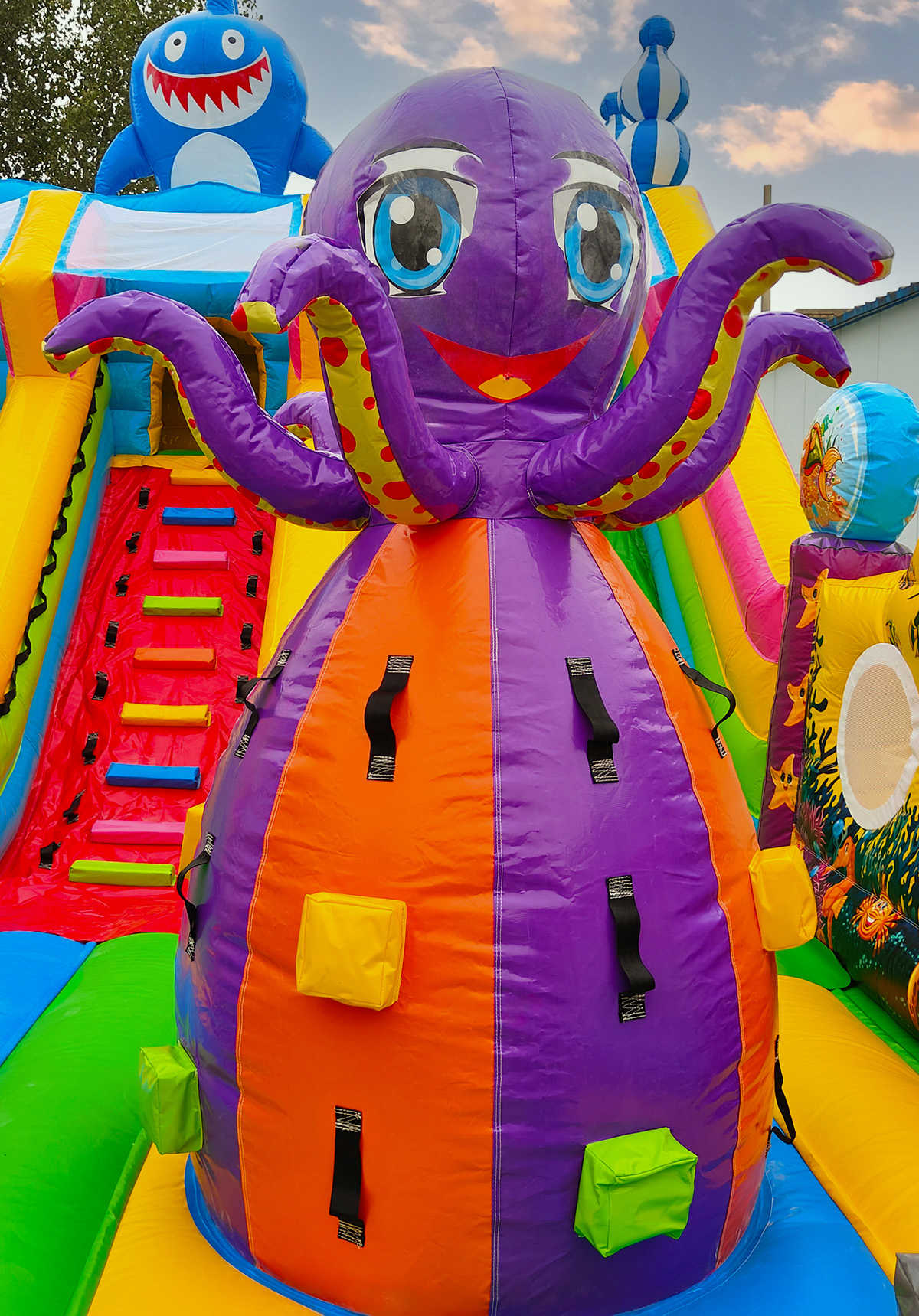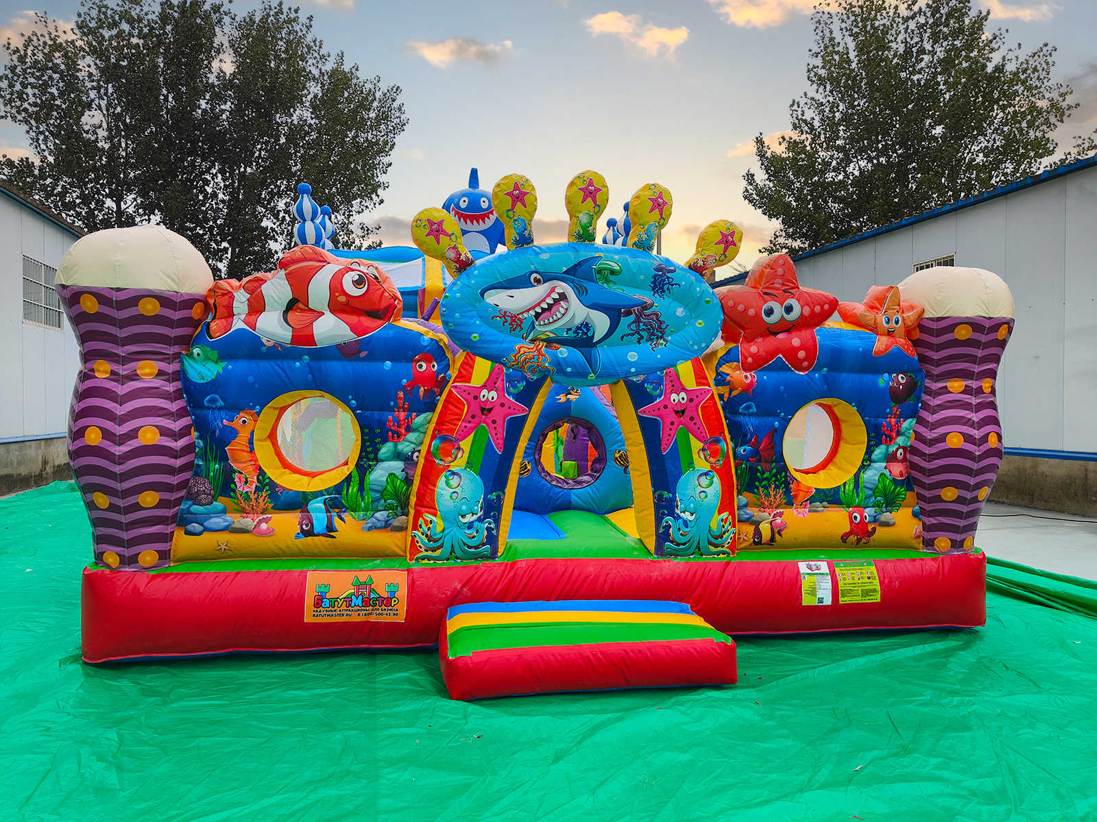 - Множество игровых элементов в одном аттракционе: батут + горка + скалодром + надувные морские обитатели.