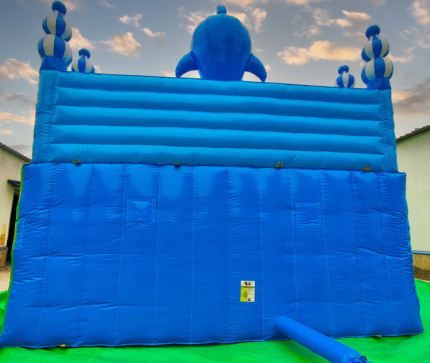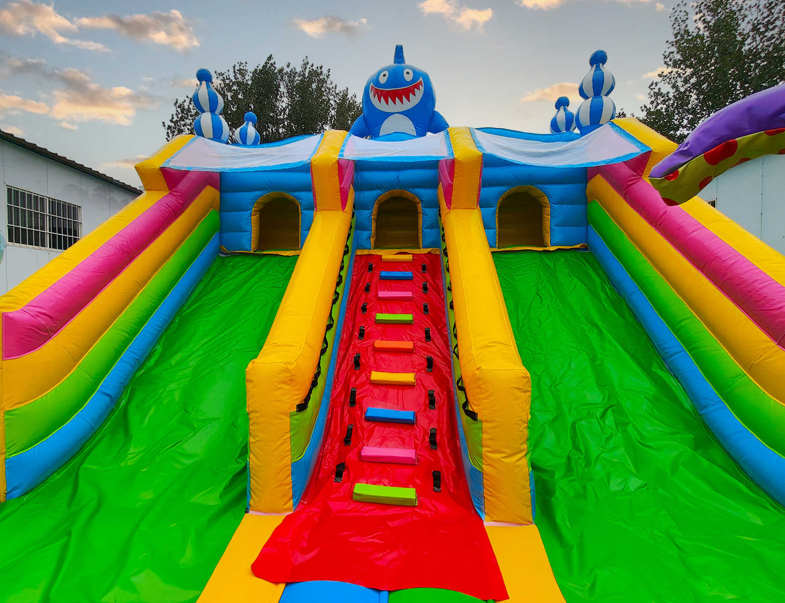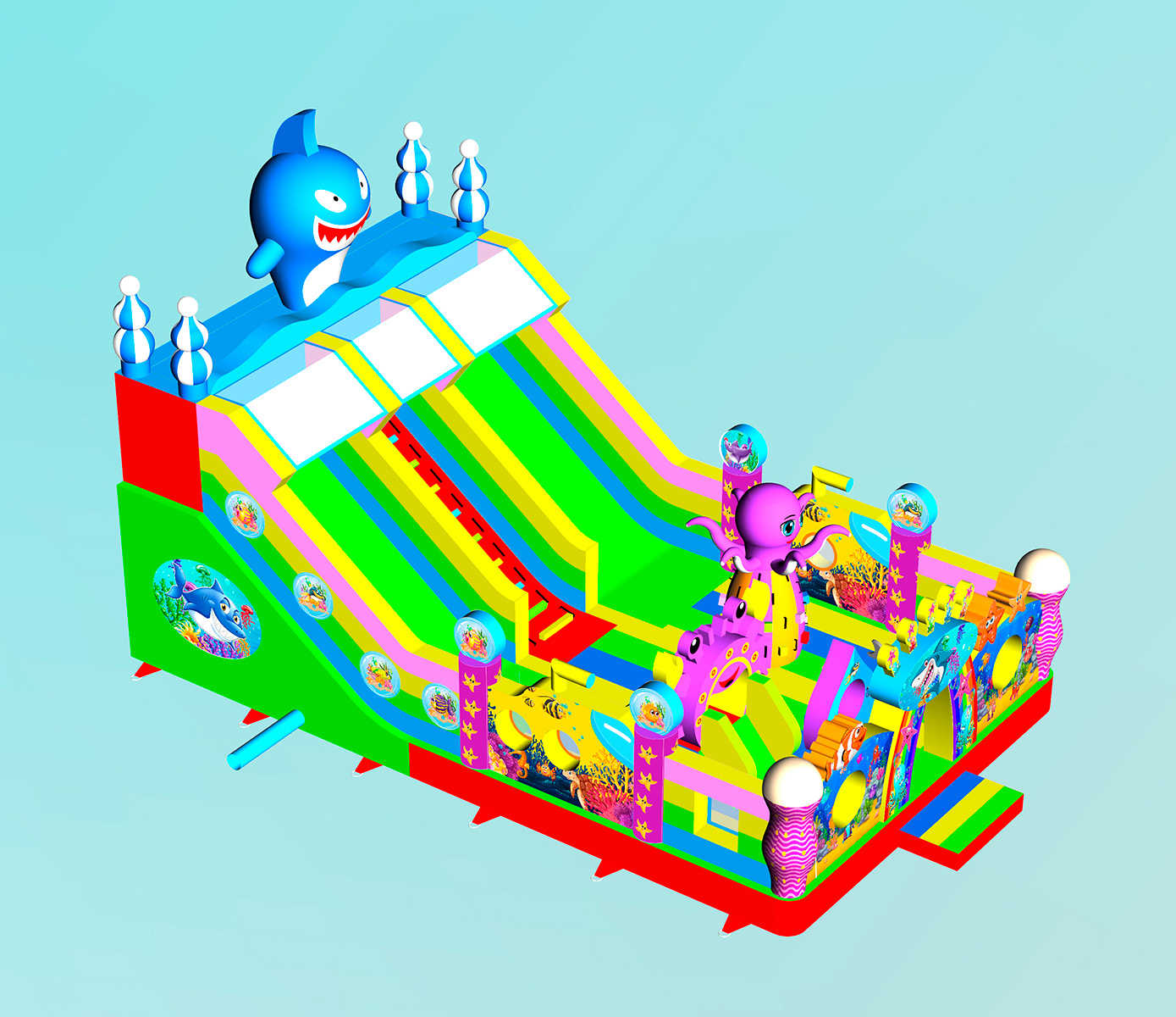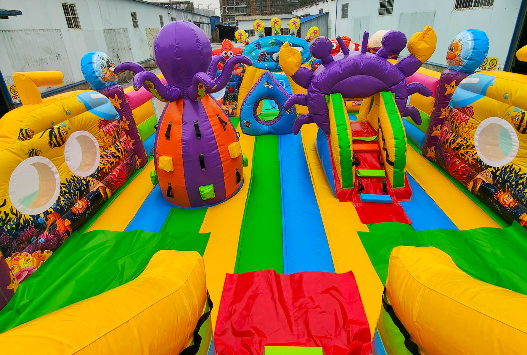 - Множество игровых элементов в одном аттракционе: батут + горка + скалодром + надувные морские обитатели.