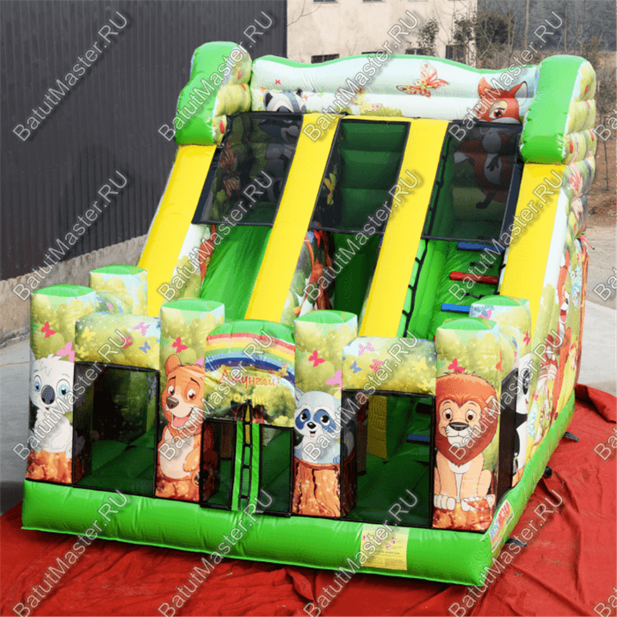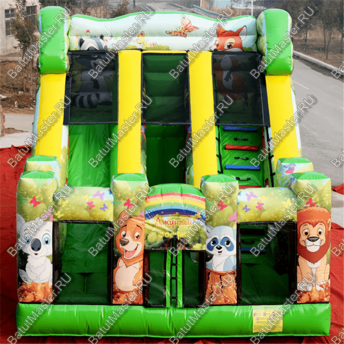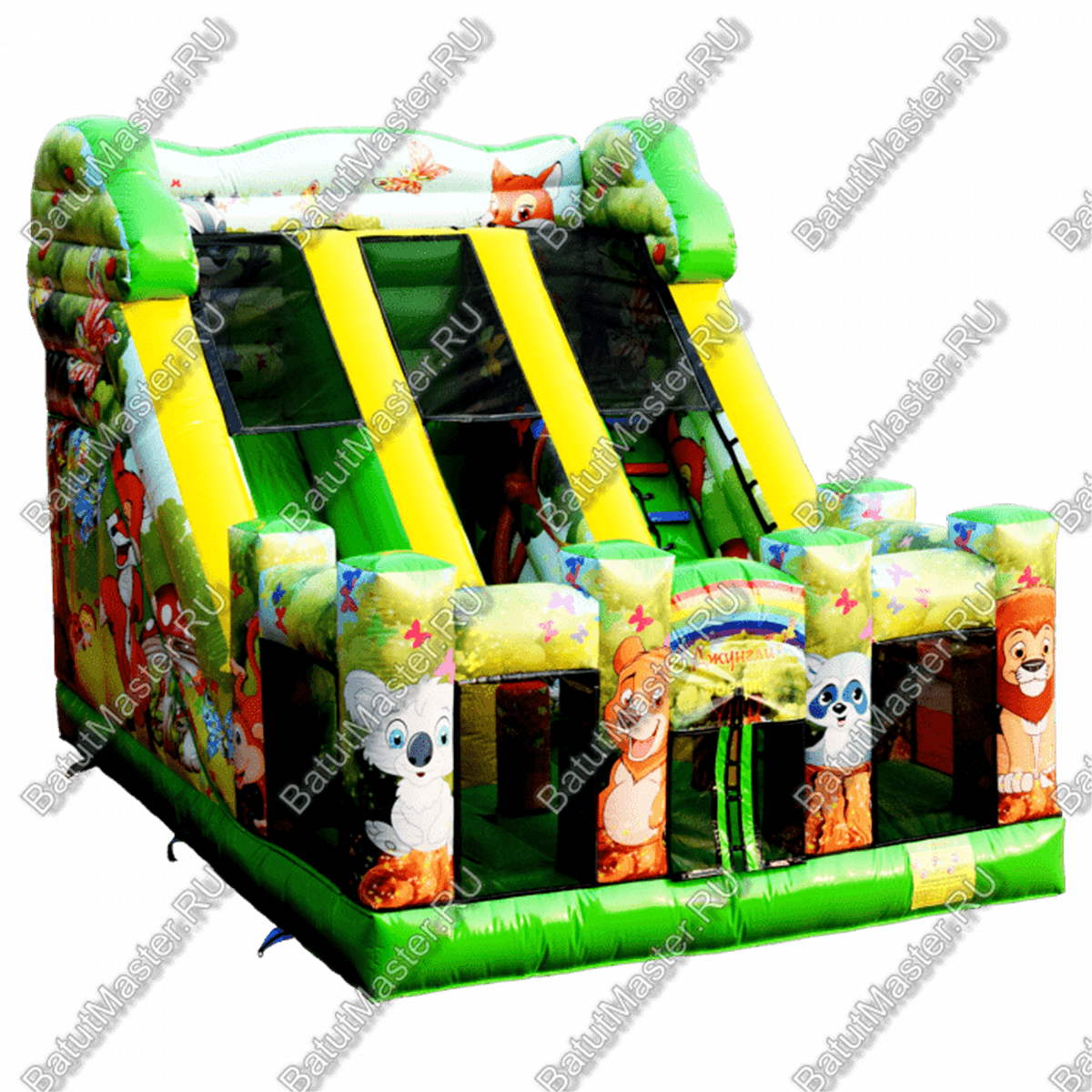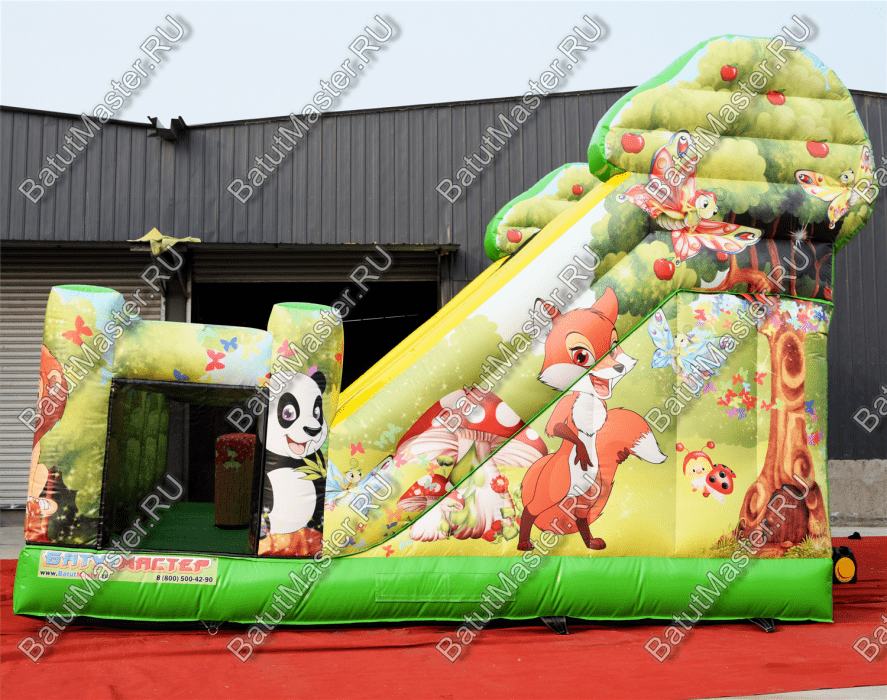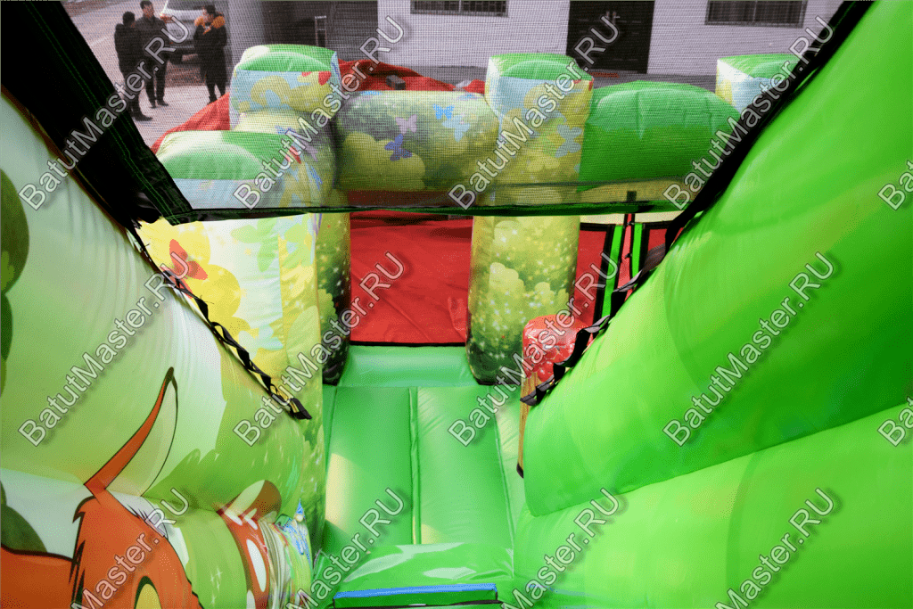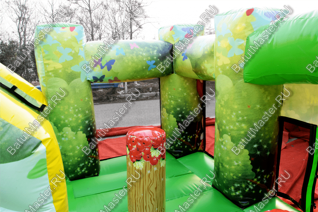 В этом батуте все игровые фигуры и сами стены имеют яркую расцветку и изображения не только животных, но и других удивительных существ, например, бабочек. Передняя часть конструкции – это мягкая прыгательная подушка с прозрачными стенками из сетки, которые поддерживаются благодаря надувным колоннам. Фасадная сторона, оборудованная входом, состоит из 4 колонн, и на каждой из них нанесены изображения животных: коала, лев, медведь и енот. Боковые стенки, наоборот, украшены нашими отечественными пейзажами. Но все нанесенные рисунки выполняются при изготовлении батута принт-печатью, поэтому наши клиенты могут заказать нанесение своих личных пейзажей, изображений и рисунков. Точно так же мы можем разместить ваши фирменные знаки или логотипы на поверхность батута.