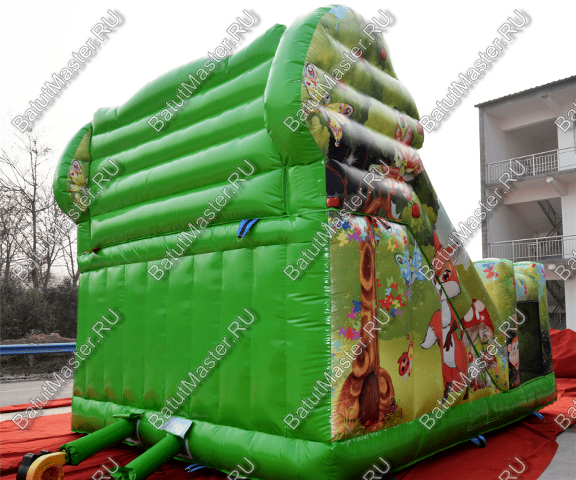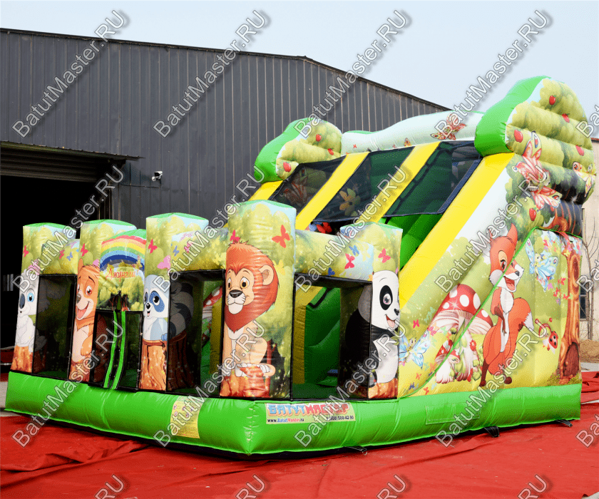 Огромный надувной батут в стиле прерий Африки состоит всего лишь из двух частей, но внешний вид аттракциона говорит о нем, как о развлекательном комплексе. Достойная высота батута 5 м позволяет ему иметь не только высокий спуск, но и достаточно просторную стартовую площадку. И хотя зона подъема и горки занимает всю заднюю часть аттракциона, спуск всего один. А чтобы до него добраться нужно пройти лестницу и еще закрытый коридор. Дальше ребенка будет ждать горка с «чистой» длиной 3 м.