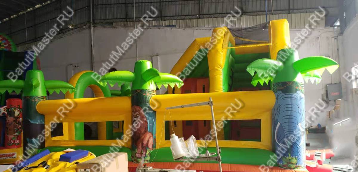 Вход выполнен в виде арки, а по бокам стоят надувные пальмы. Кроме того, рисунки животных джунглей поддерживают тематику батута.