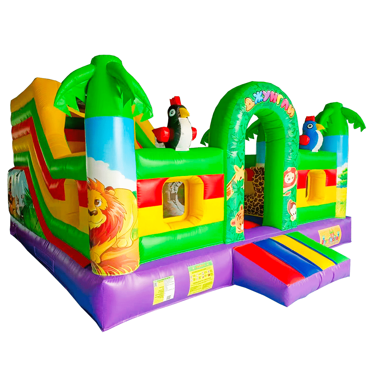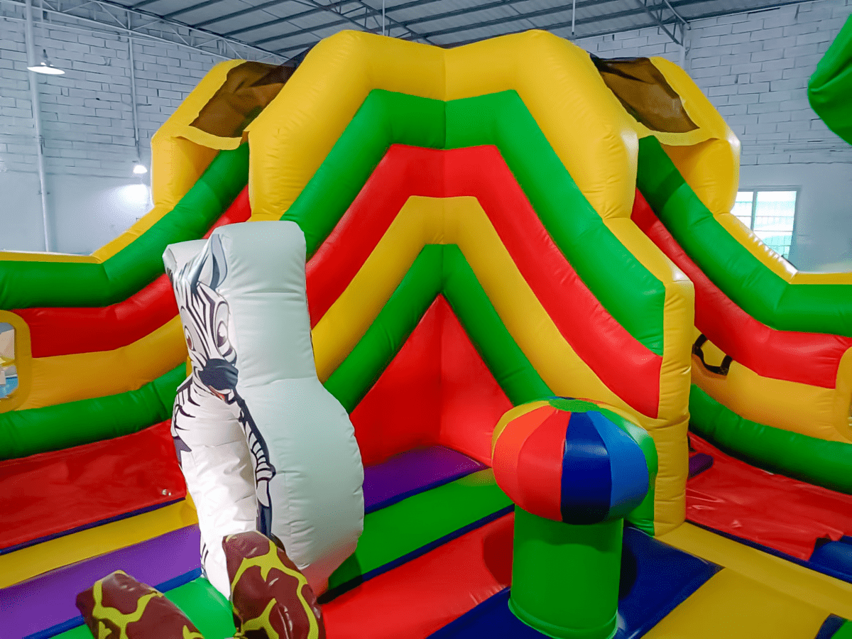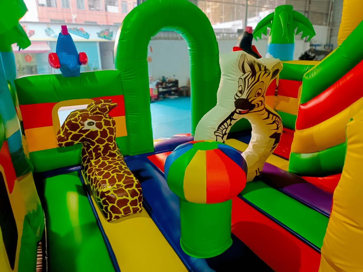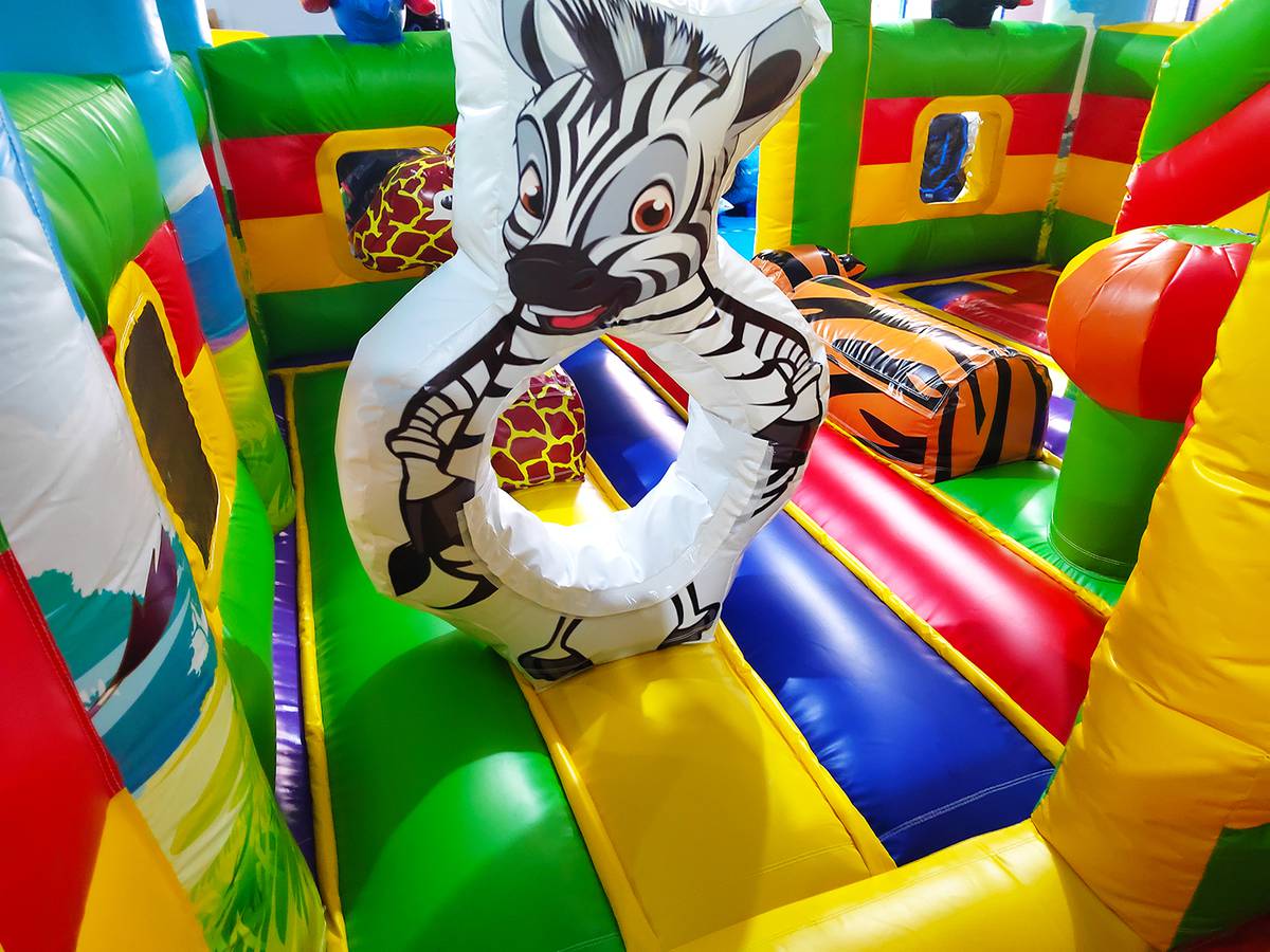 Вход на аттракцион сделан в виде большой жёлтой арки. Детей встречают на входе приветливые зверята – зебра и лев, а войдя внутрь, они снова повстречают милую зебру, но уже не в виде рисунка, а в виде фигурки. Справа есть небольшая зона, где можно посидеть и отдохнуть или же попрыгать. Также ребята могут поиграть с батутными шарами. Рядом с ними стоит жираф, смотрящий прямо на лесенки, ведущей к горке. Но для любителей сложностей есть и другой проход к лестницам: по надувной стене. Цепляясь руками и ногами, дети смогут добраться до цели.