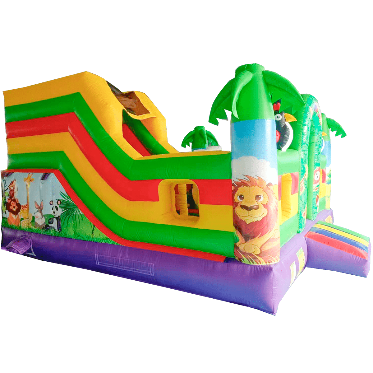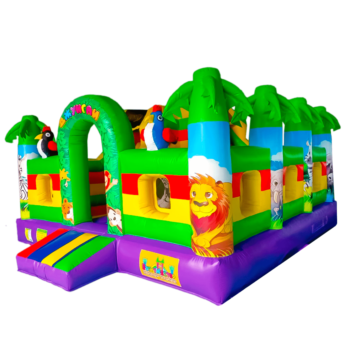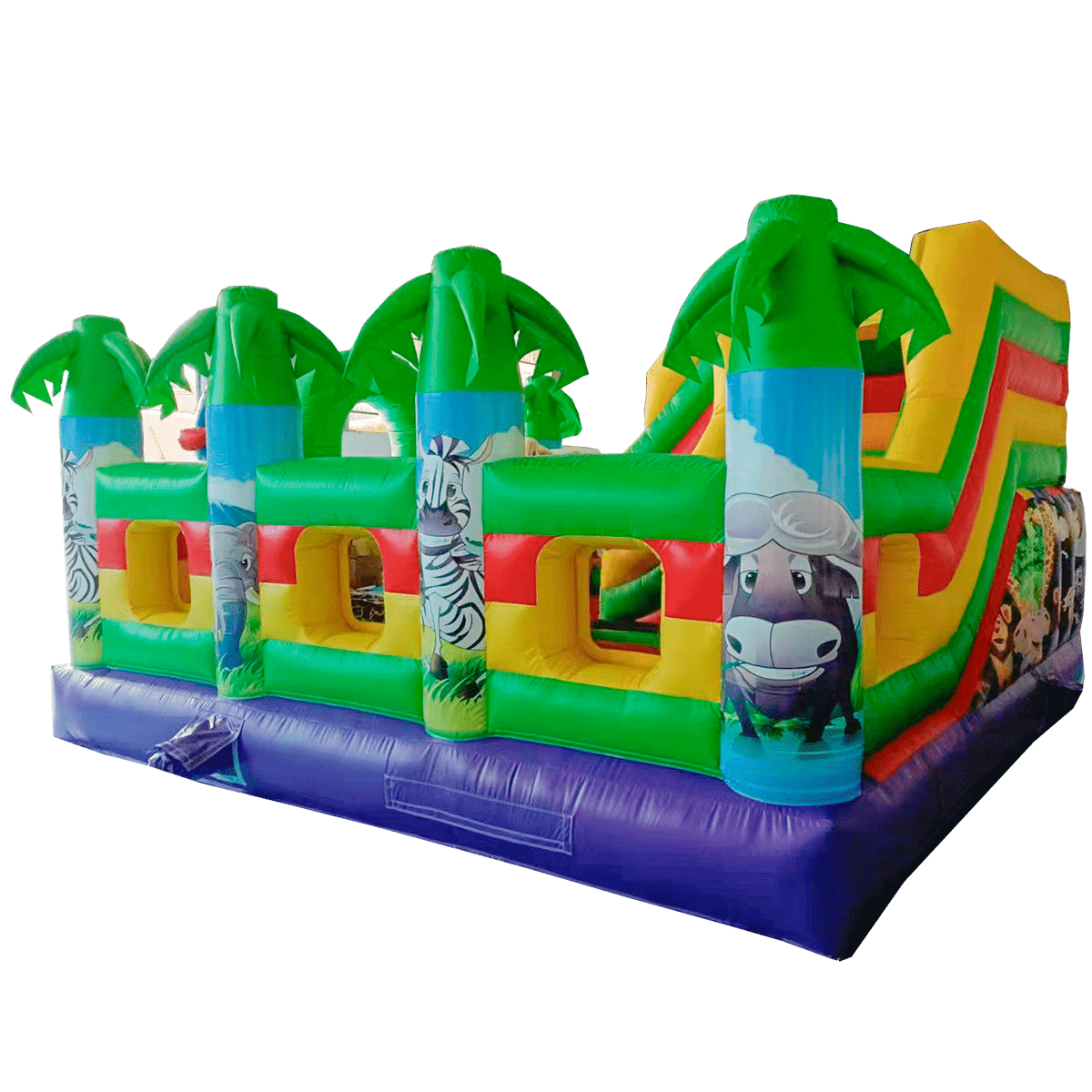 Вход на аттракцион сделан в виде большой жёлтой арки. Детей встречают на входе приветливые зверята – зебра и лев, а войдя внутрь, они снова повстречают милую зебру, но уже не в виде рисунка, а в виде фигурки. Справа есть небольшая зона, где можно посидеть и отдохнуть или же попрыгать. Также ребята могут поиграть с батутными шарами. Рядом с ними стоит жираф, смотрящий прямо на лесенки, ведущей к горке. Но для любителей сложностей есть и другой проход к лестницам: по надувной стене. Цепляясь руками и ногами, дети смогут добраться до цели.