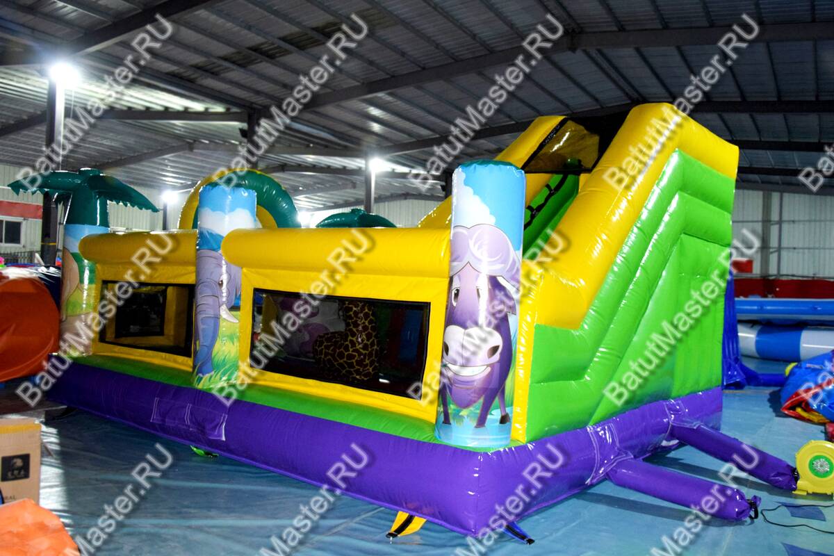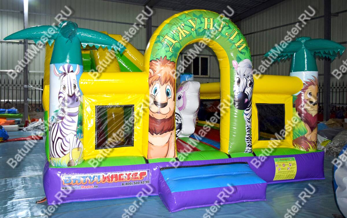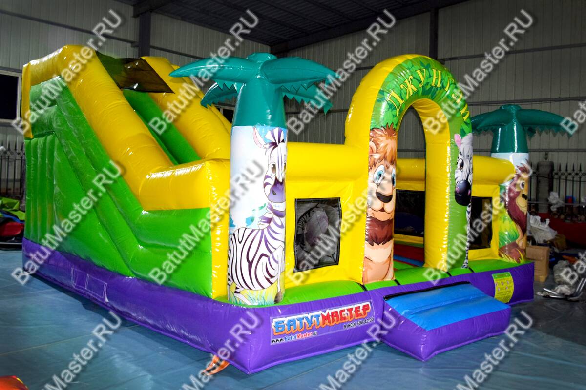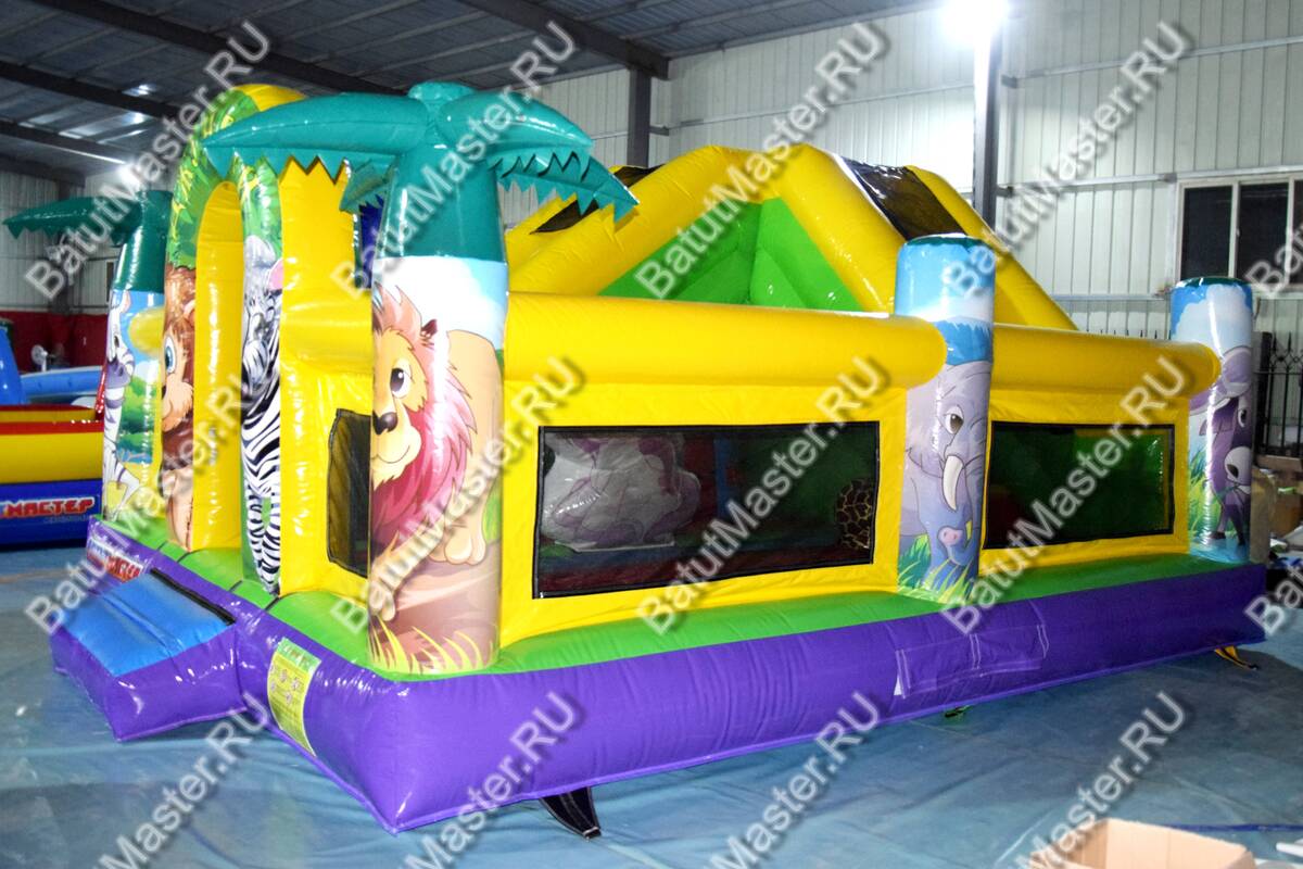 «Сафари-джунгли с розовым единорогом» - коммерческий надувной батут, который точно стоит приобрести для бизнеса. При своей небольшой стоимости этот батут может стать центром внимания большинства маленьких посетителей. В первую очередь, данный батут привлечёт детей своим ярким внешним видом. В конструкции много пёстрых цветов, которые ассоциируется у детей с сафари: жёлтый цвет - яркого солнышка и тёплого песка, а также зелёный цвет различных растений. Уже этот фактор разбудит воображение ребёнка, а ведь тут есть и надувные фигуры, например, высокие пальмы. Не обошлось и без изображений весёлых животных, что также порадует детей.
