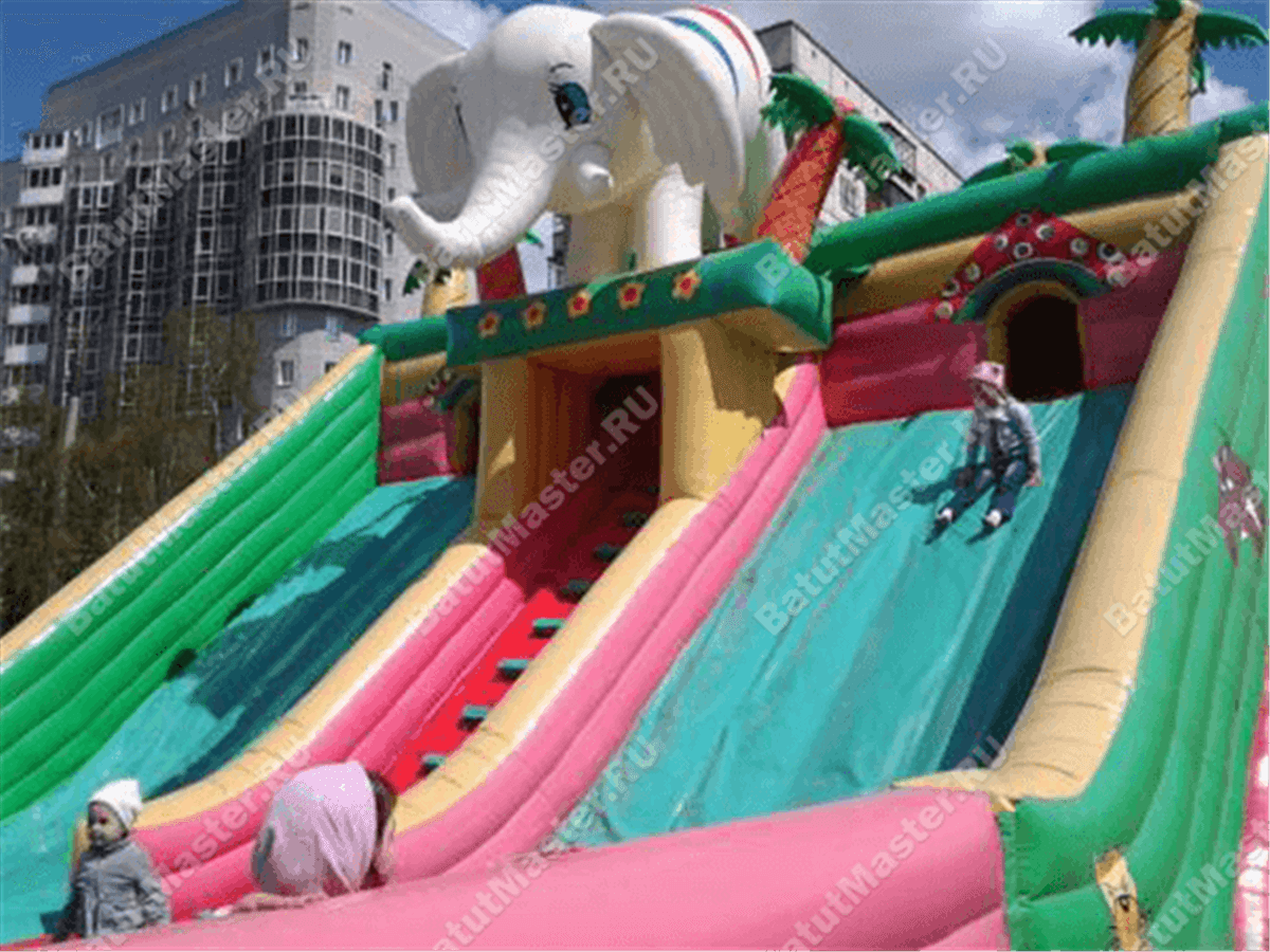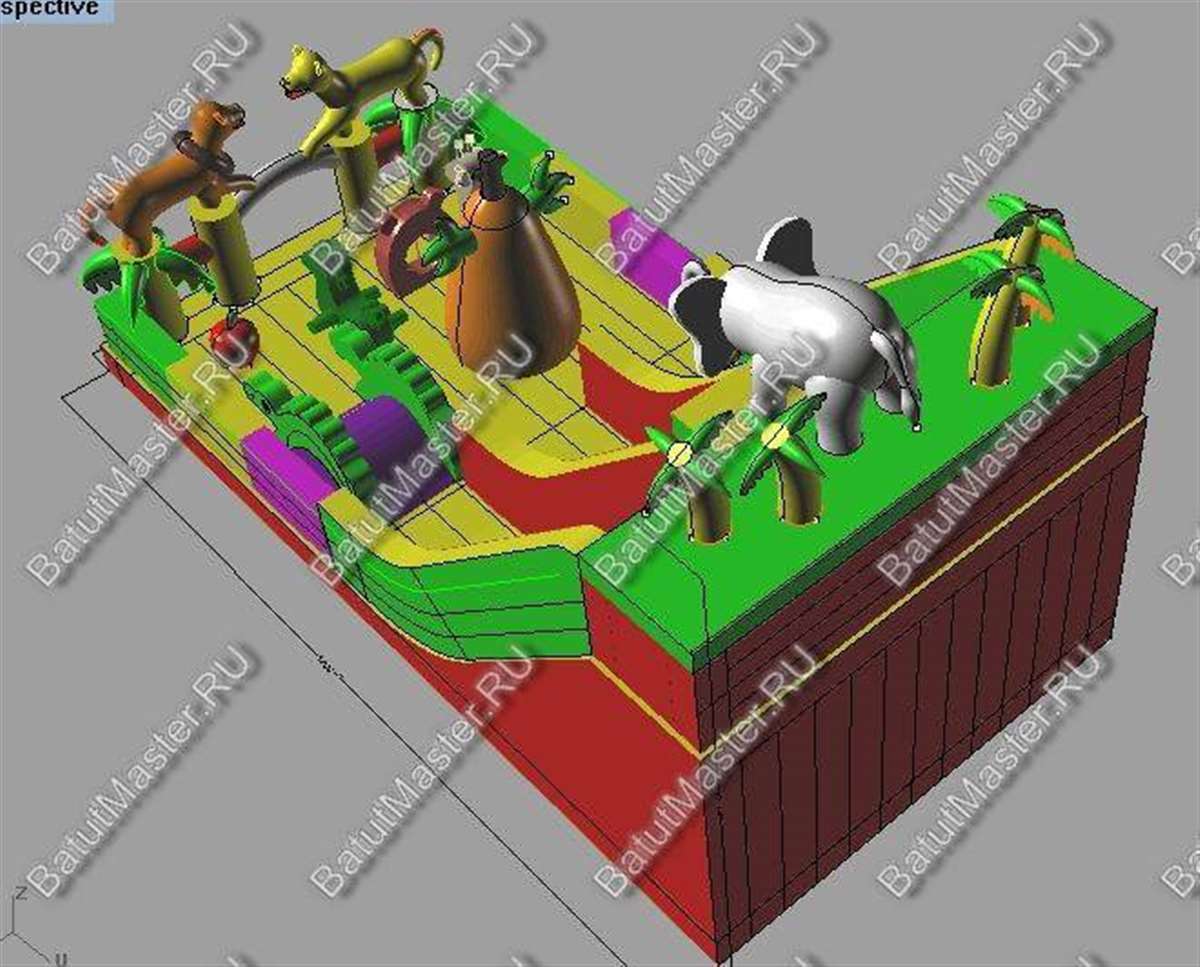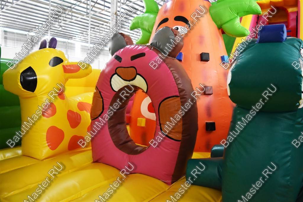 Добро пожаловать в сафари парк! Интересный и современный комплекс привлечет внимание детей разного возраста. Это не просто надувной батут, это целая арена для головокружительных эмоций и невероятных приключений, где каждая деталь принесет детям только радость. Здесь есть несколько горок, скалодром, надувные деревья, кольца, крокодилы, собачка и многое другое. Все это рассчитано на то, чтобы дети забирались на мягкие модули и весело прыгали вниз. Наверху двух горок стоит большой надувной слон и пальмы. Здесь все вокруг задает напоминает сафари парк, где каждая локация призывает к веселью.