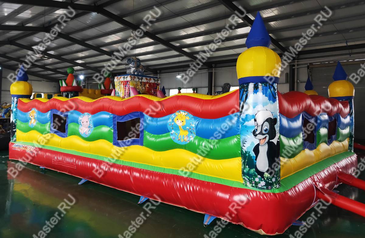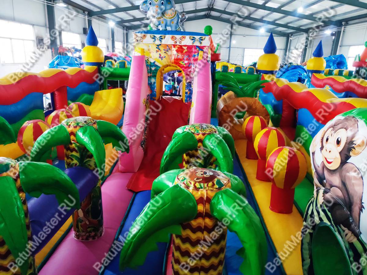 Высокие надувные борта защищают от травм и выпадения, а окошки из прочной сетки дают возможность контролировать нахождение там детей. Весь батут украшен рисунками забавных животных и надувными пальмами.