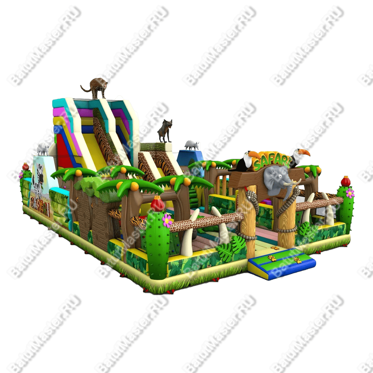 Очутиться в настоящих джунглях среди тропических животных дети смогут, играя на надувном батуте «Сафари-тур». Функциональный, интересный и современный комплекс оснащен самыми увлекательными модулями и локациями. Здесь игровые зоны отличаются не только наполнением, но и цветовым оформлением. Так, здесь демонстрируются камни, водопады, полянки, а также заросли пальм. Скалодром выглядит будто небольшая зеленая гора, прыжковое поле похоже на песочную тропинку. Дети будут в восторге от такого увлекательного мира сафари.
