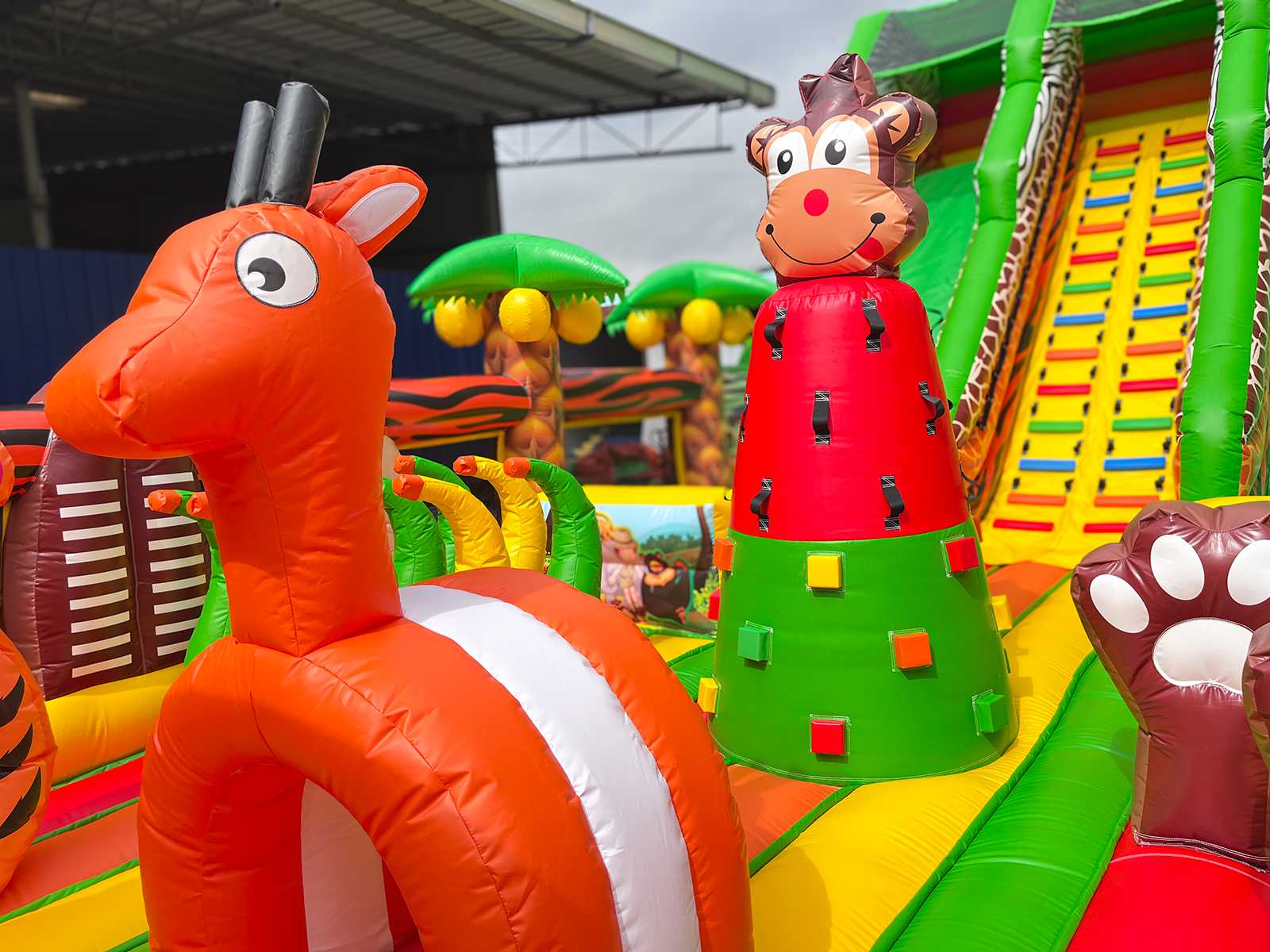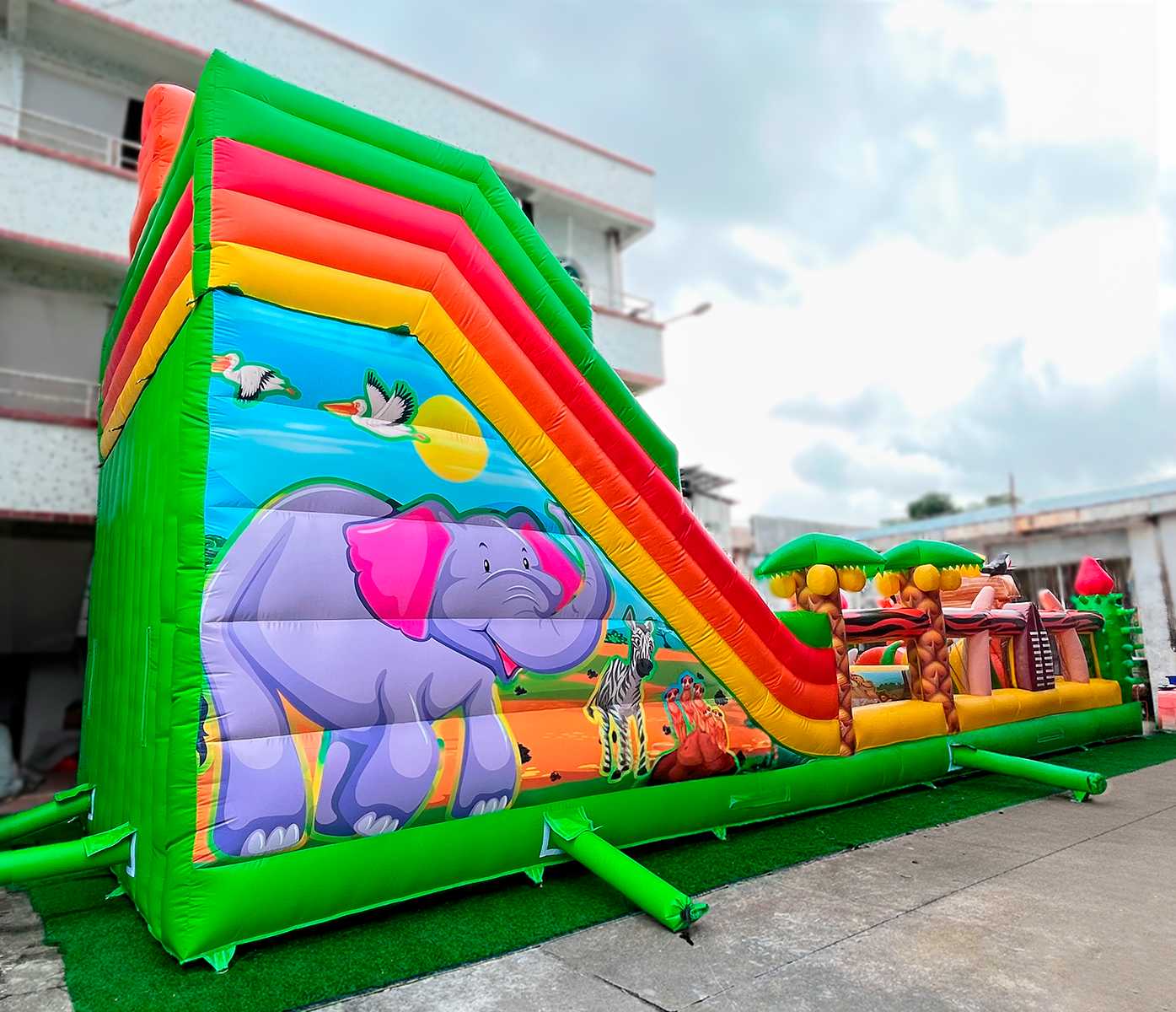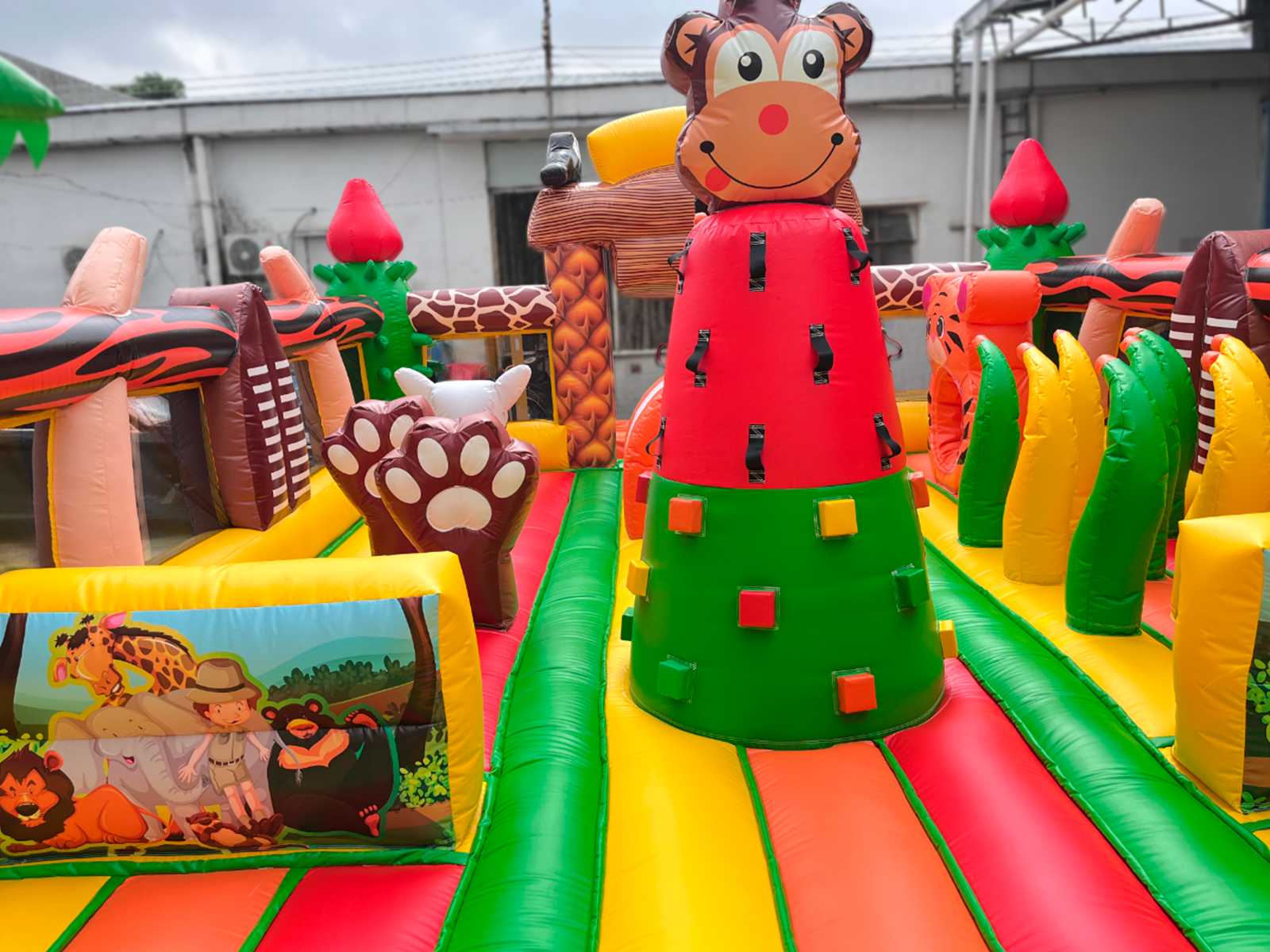 Надувной батут «Сафари Ультра» — это впечатляющий аттракцион размером 14x6x7.5 метров, предназначенный для активных игр, прыжков, преодоления препятствий и скатывания с горки. Визуально он оформлен в африканской тематике: яркие цвета, животные, как жирафы, львы и птицы, тропическая растительность и эффектные декоративные фигуры создают ощущение настоящего сафари. Внутри расположены надувные арки, столбики, горка, скалодром, а также свободное пространство для активных игр.