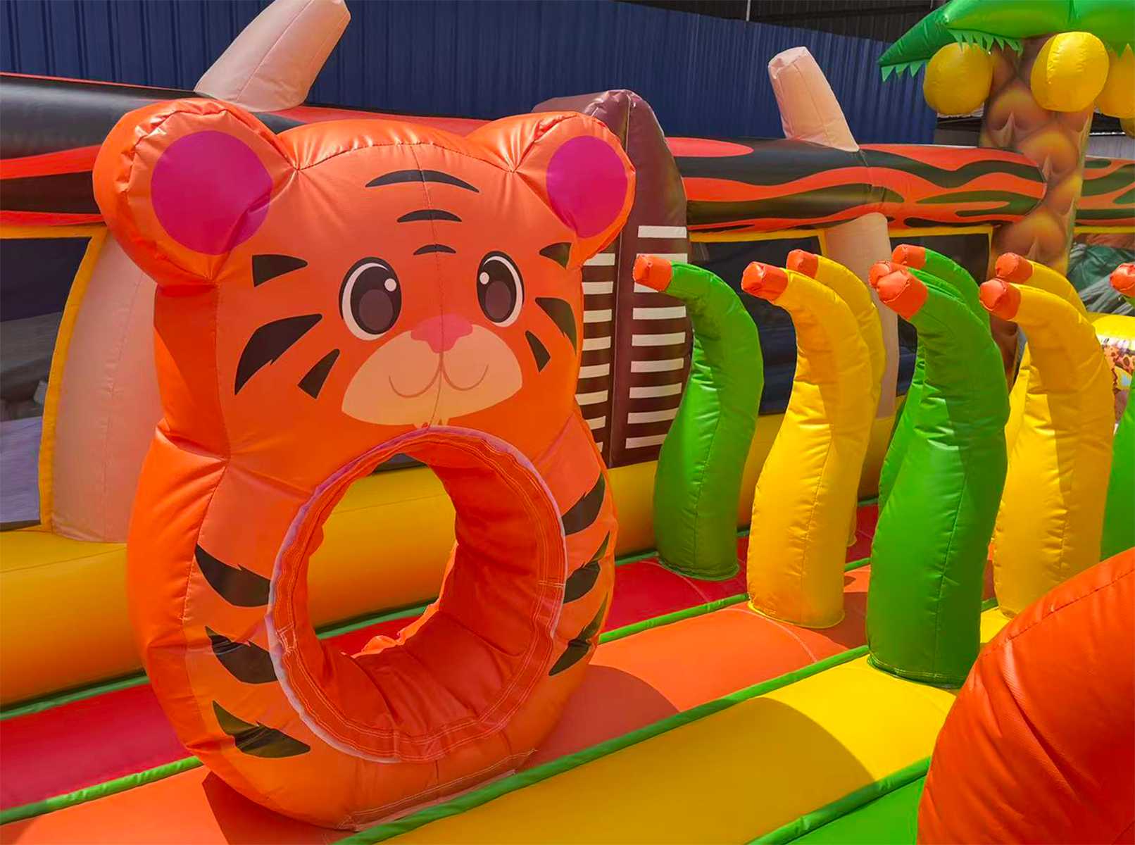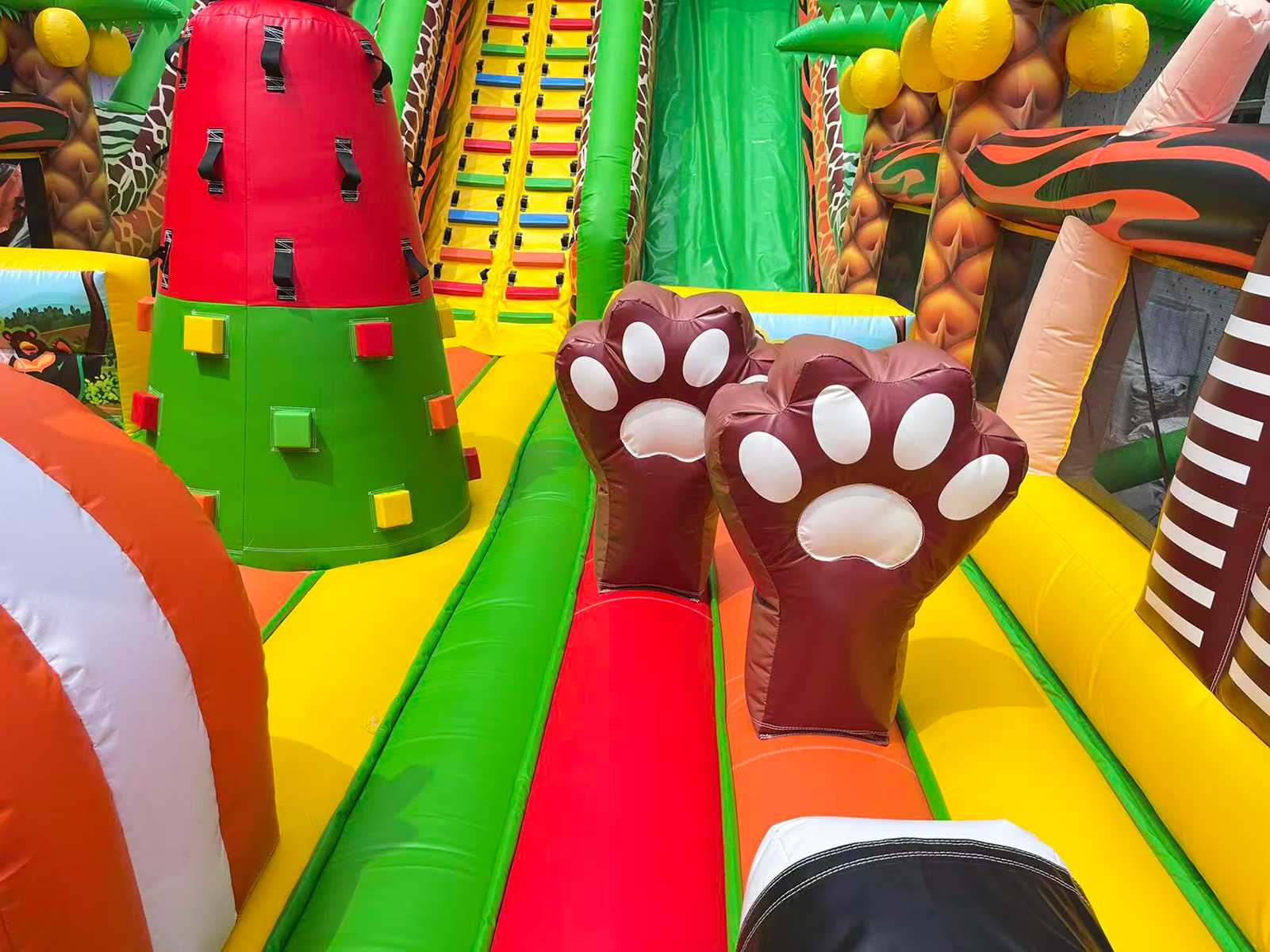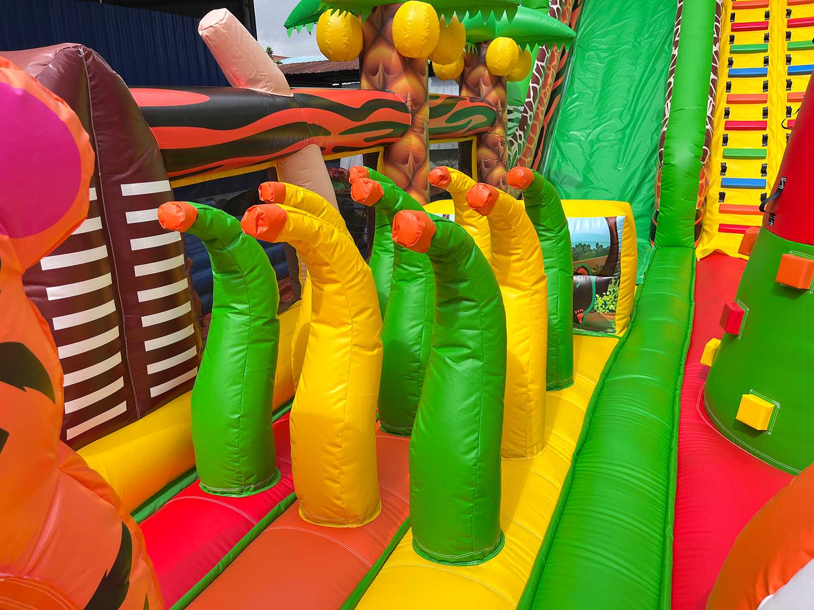 Надувной батут «Сафари Ультра» — это впечатляющий аттракцион размером 14x6x7.5 метров, предназначенный для активных игр, прыжков, преодоления препятствий и скатывания с горки. Визуально он оформлен в африканской тематике: яркие цвета, животные, как жирафы, львы и птицы, тропическая растительность и эффектные декоративные фигуры создают ощущение настоящего сафари. Внутри расположены надувные арки, столбики, горка, скалодром, а также свободное пространство для активных игр.