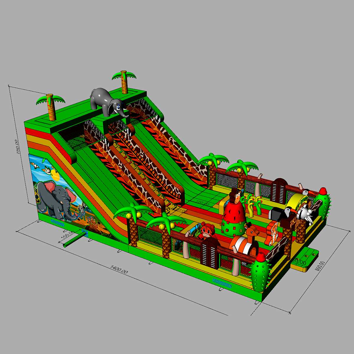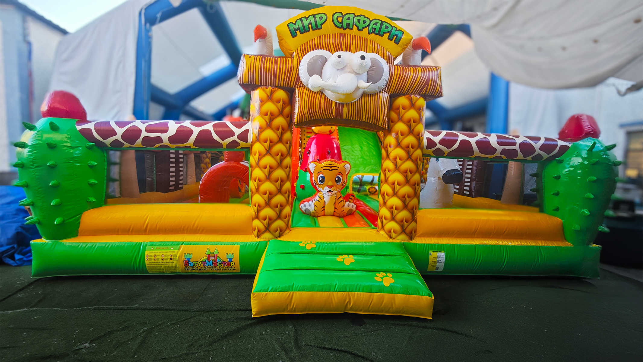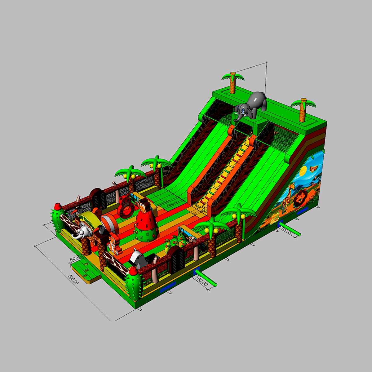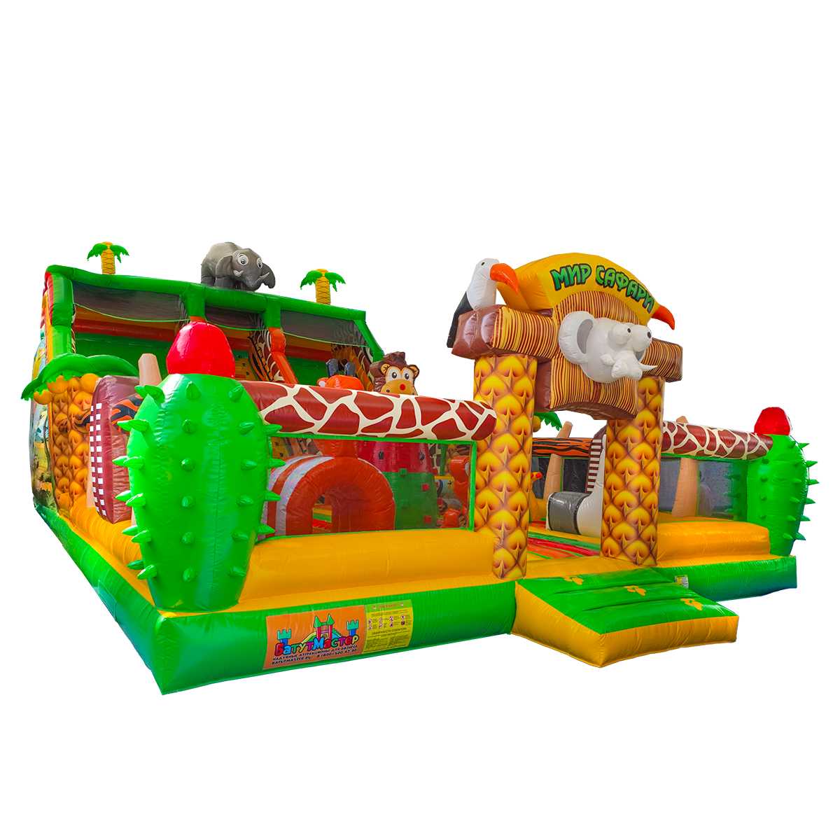 Коммерческий надувной батут «Сафари Ультра» — это настоящий мини-парк в формате одного аттракциона. Его оформление вдохновлено африканскими джунглями, в дизайне использованы яркие цвета — жёлтый, красный, зелёный и оранжевый. Здесь дети могут встретить надувных обезьян и слонов, пробираться сквозь арки, прыгать между столбиками и проходить препятствия в виде надувной «растительности». Атмосфера захватывает с первых секунд и погружает в мир приключений, где каждый ребёнок чувствует себя первооткрывателем.