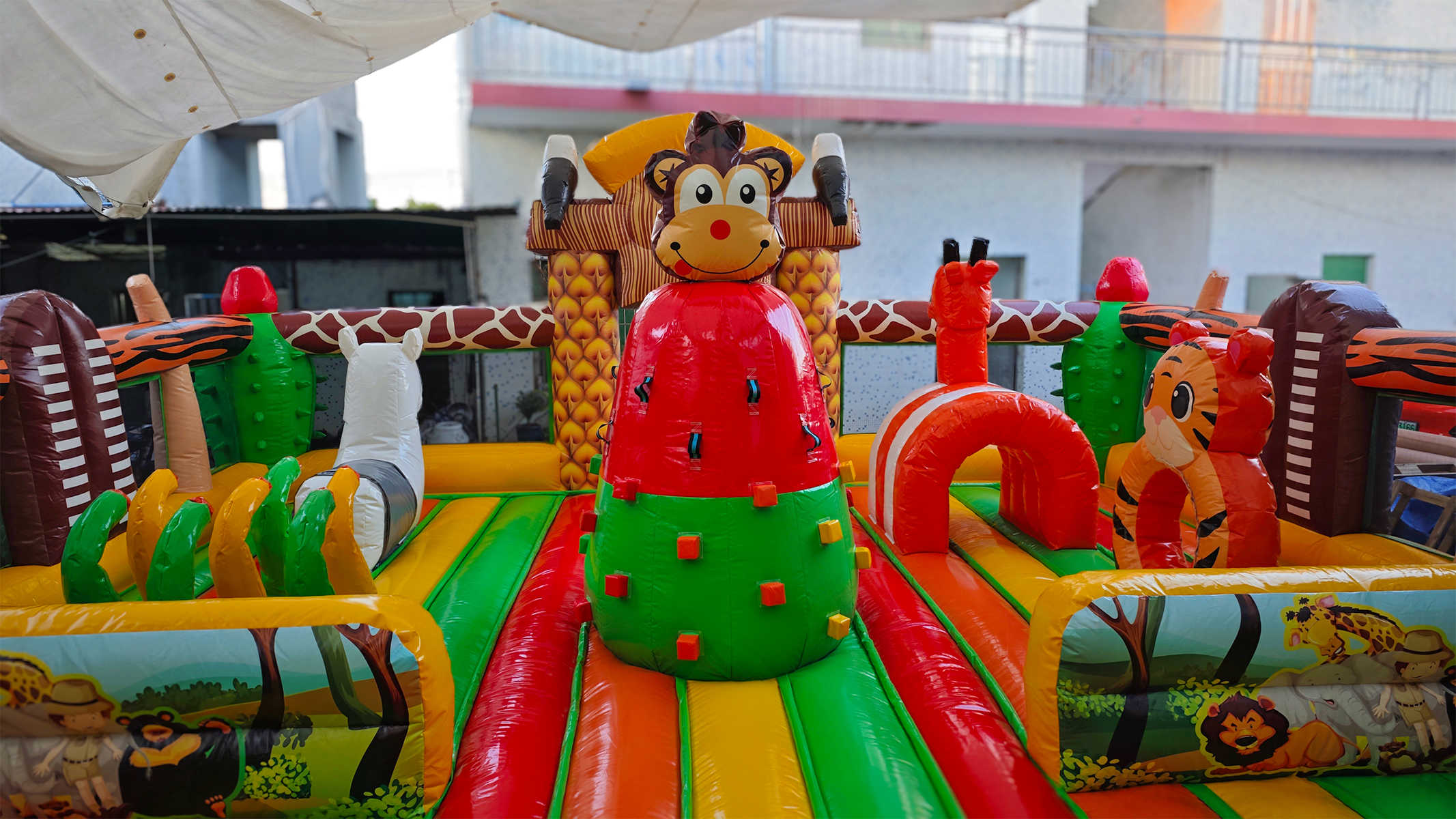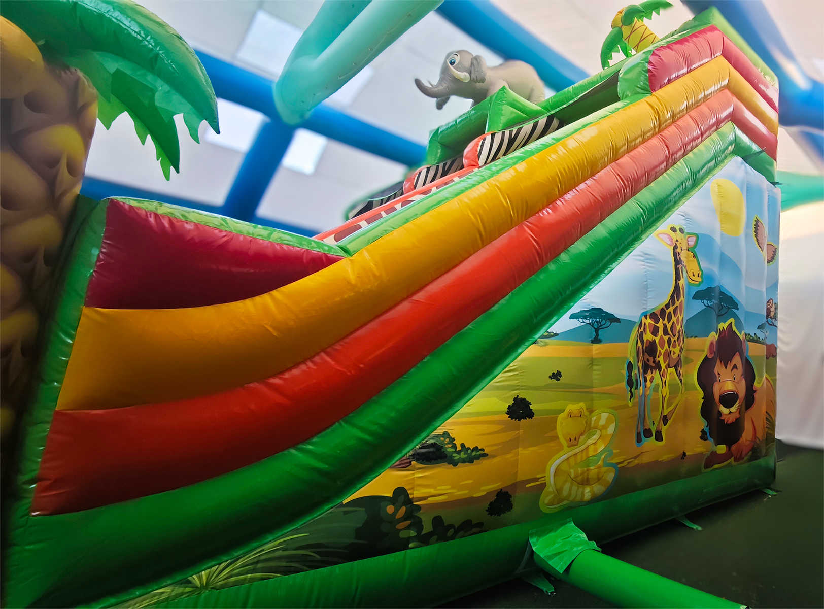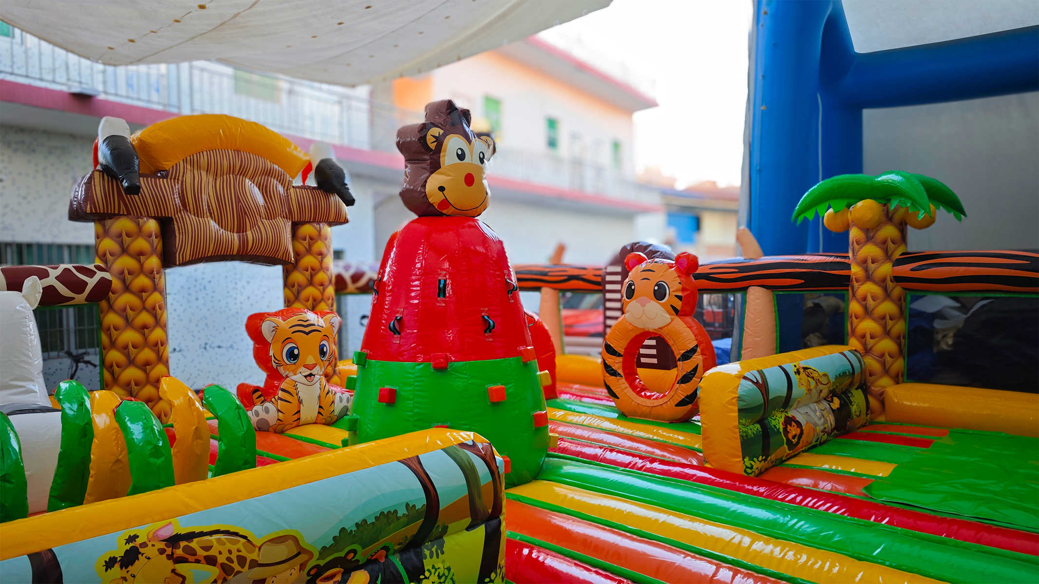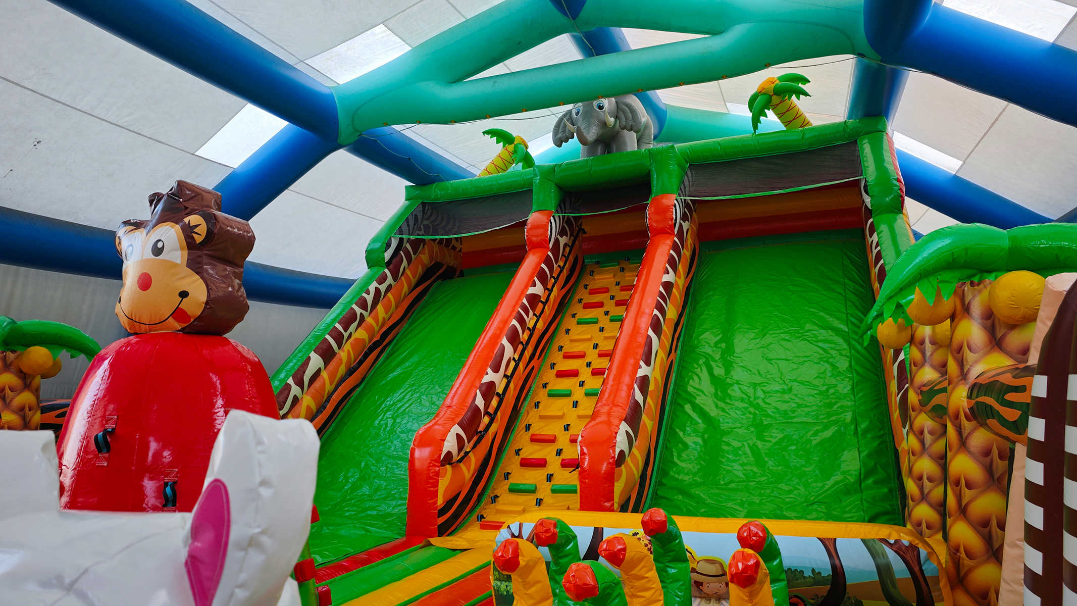 Коммерческий надувной батут «Сафари Ультра» — это настоящий мини-парк в формате одного аттракциона. Его оформление вдохновлено африканскими джунглями, в дизайне использованы яркие цвета — жёлтый, красный, зелёный и оранжевый. Здесь дети могут встретить надувных обезьян и слонов, пробираться сквозь арки, прыгать между столбиками и проходить препятствия в виде надувной «растительности». Атмосфера захватывает с первых секунд и погружает в мир приключений, где каждый ребёнок чувствует себя первооткрывателем.