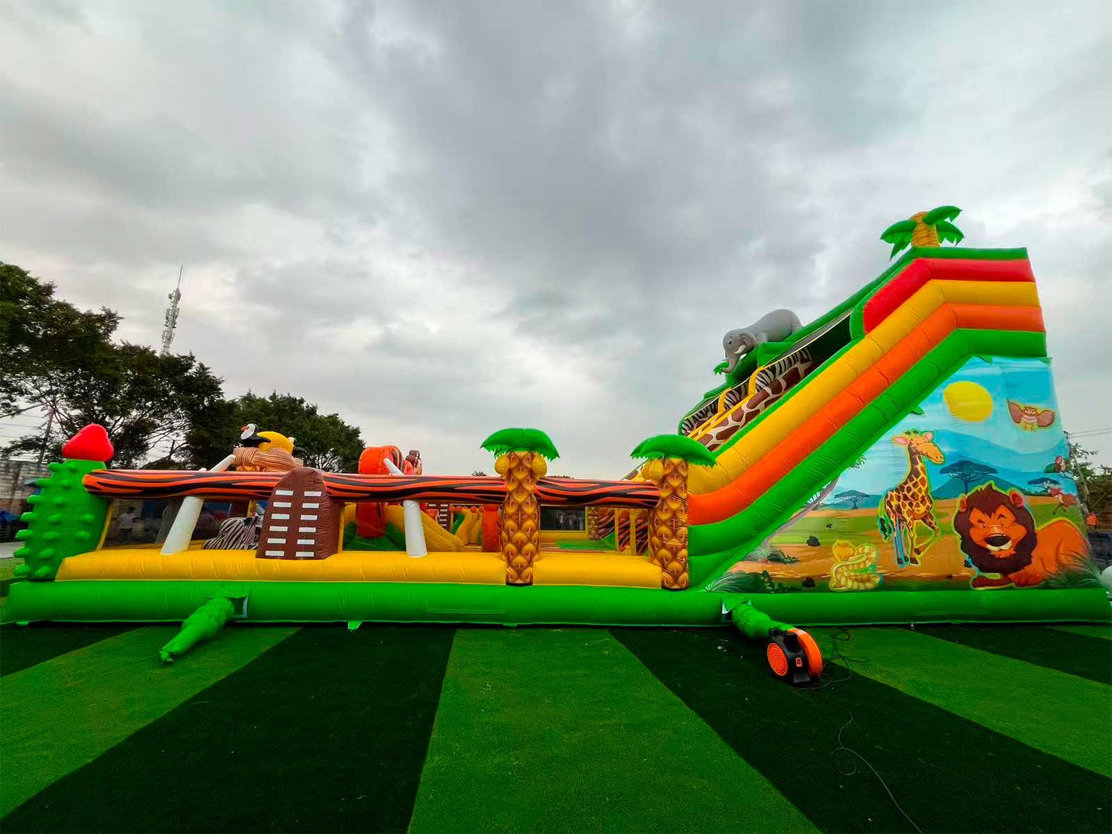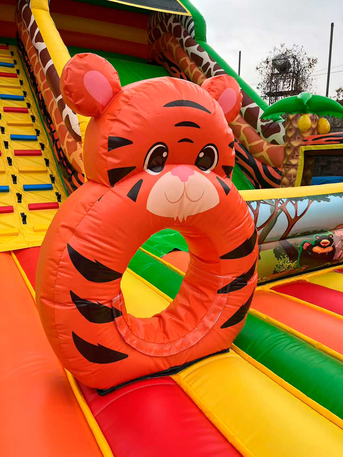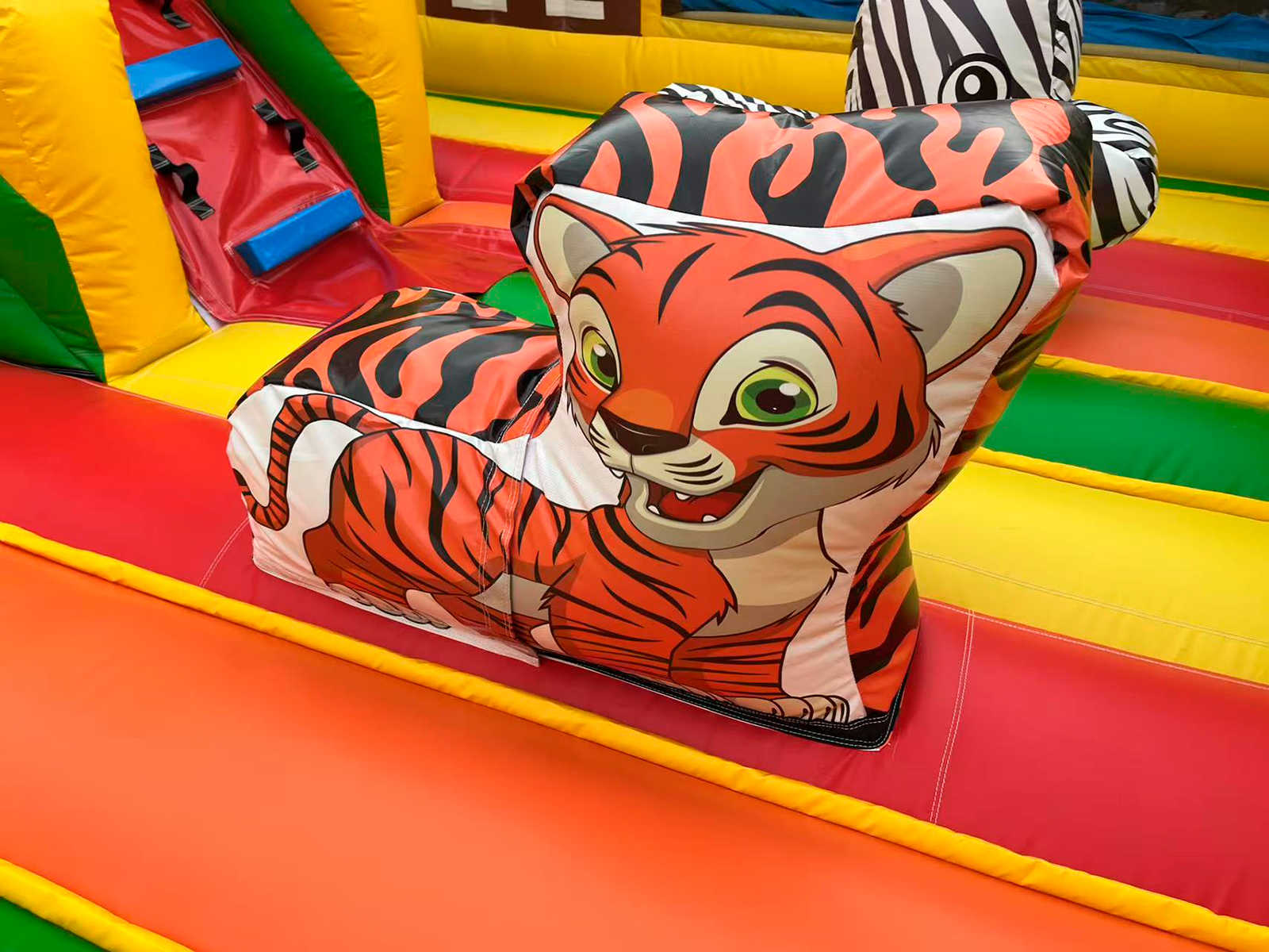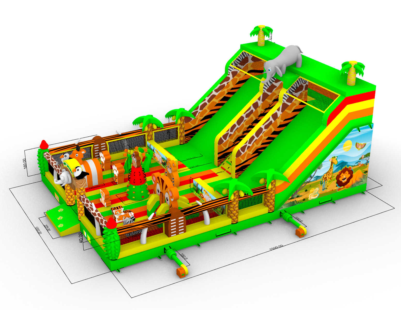 Надувной батут «Сафари Ультра» — это яркий, насыщенный деталями коммерческий аттракцион, в котором каждый ребёнок почувствует себя героем африканских джунглей. Огромная игровая зона 15x10x7.5 м включает в себя множество элементов: высокий скалодром, две горки со стартовой высотой горки 3,5 м, место для прыжков и бега, а также декоративные и игровые фигуры — львов, попугаев, тигров, слонов и пальмы. Всё это создаёт эффект присутствия в настоящем сафари! 🐘🦜🌞