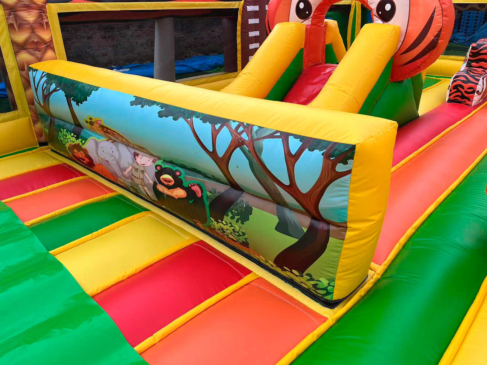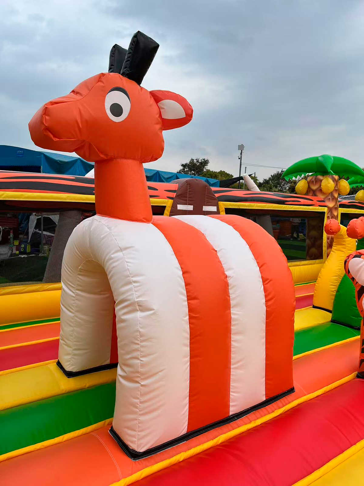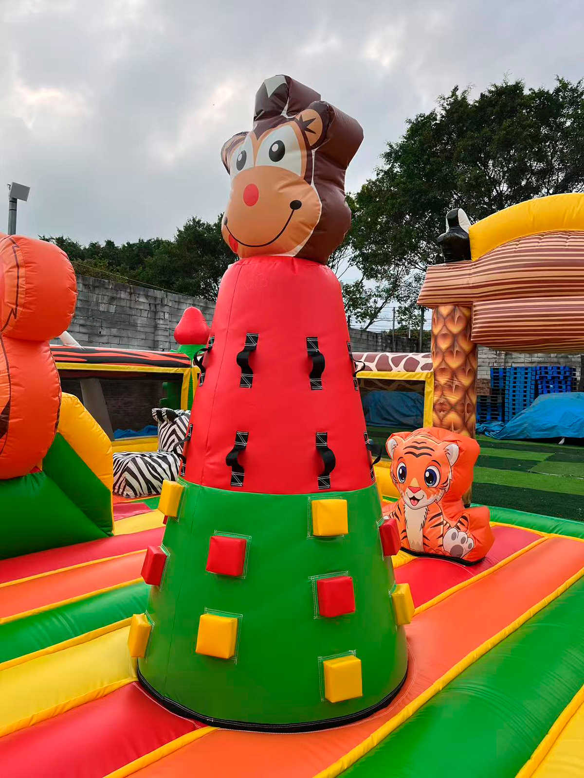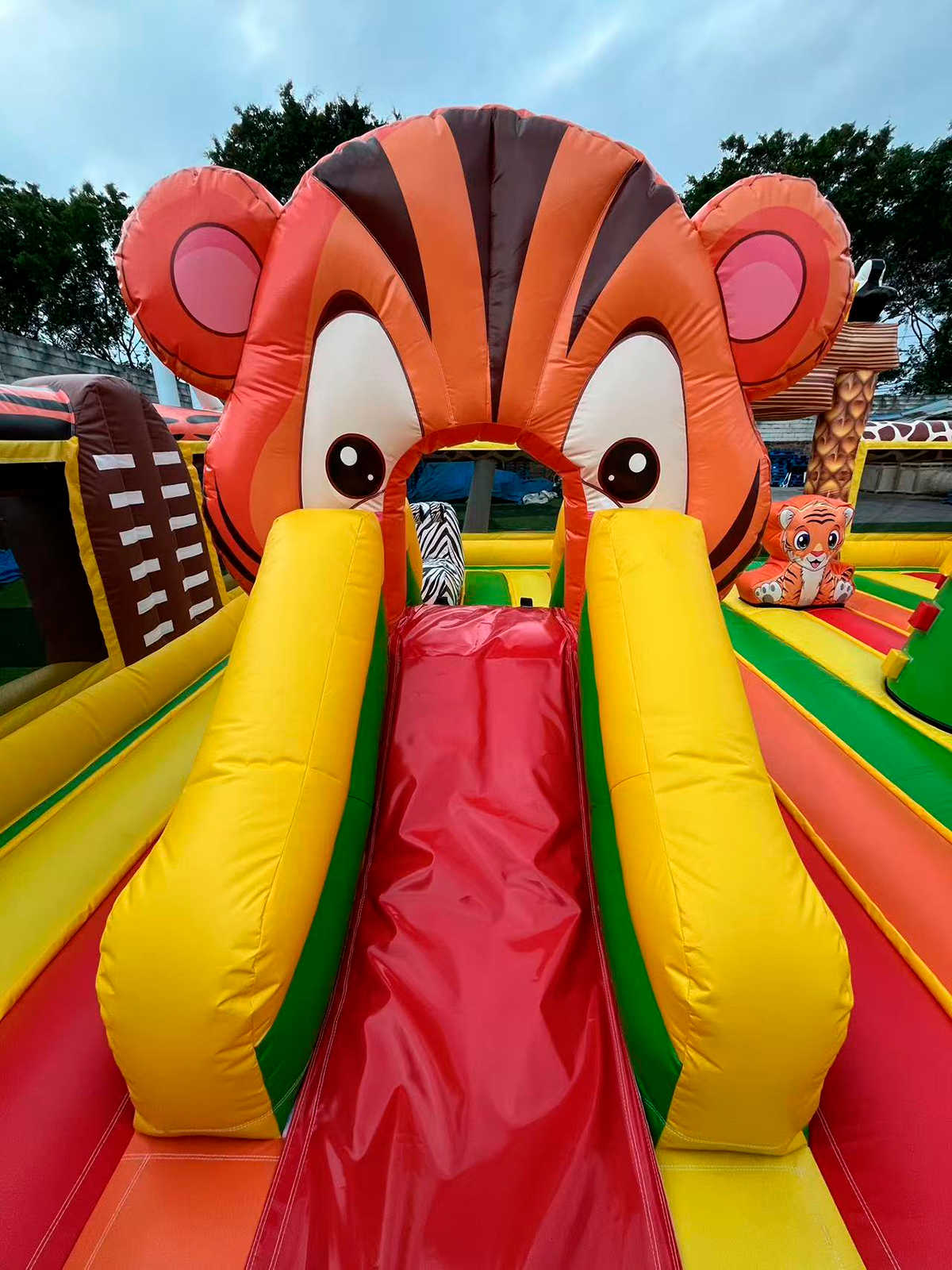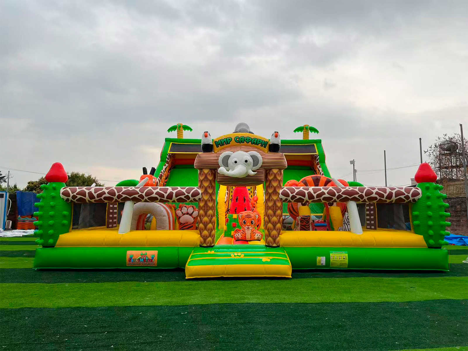 Надувной батут «Сафари Ультра» — это яркий, насыщенный деталями коммерческий аттракцион, в котором каждый ребёнок почувствует себя героем африканских джунглей. Огромная игровая зона 15x10x7.5 м включает в себя множество элементов: высокий скалодром, две горки со стартовой высотой горки 3,5 м, место для прыжков и бега, а также декоративные и игровые фигуры — львов, попугаев, тигров, слонов и пальмы. Всё это создаёт эффект присутствия в настоящем сафари! 🐘🦜🌞