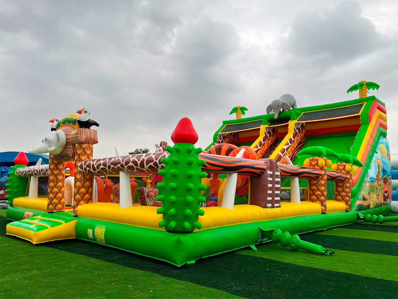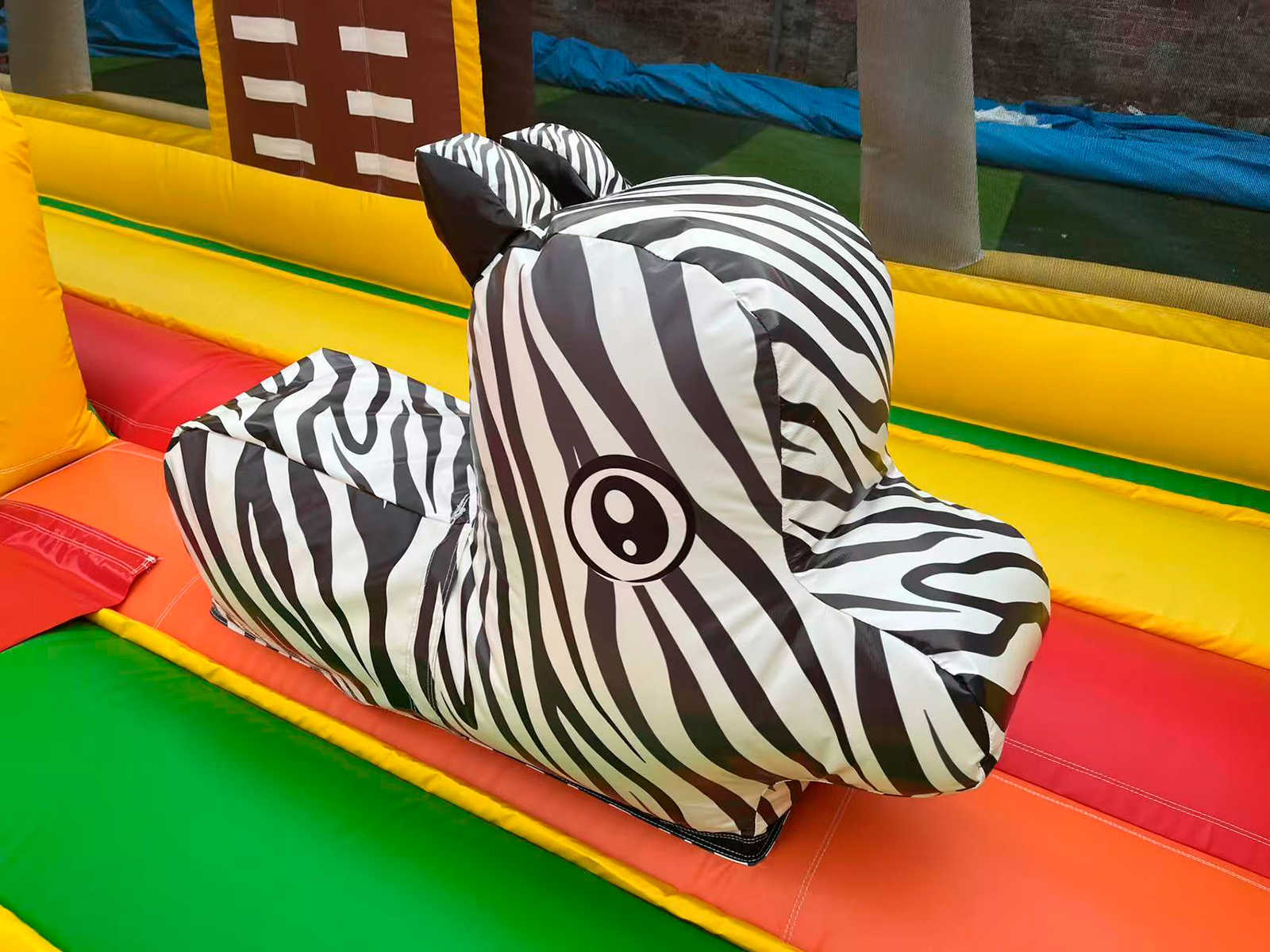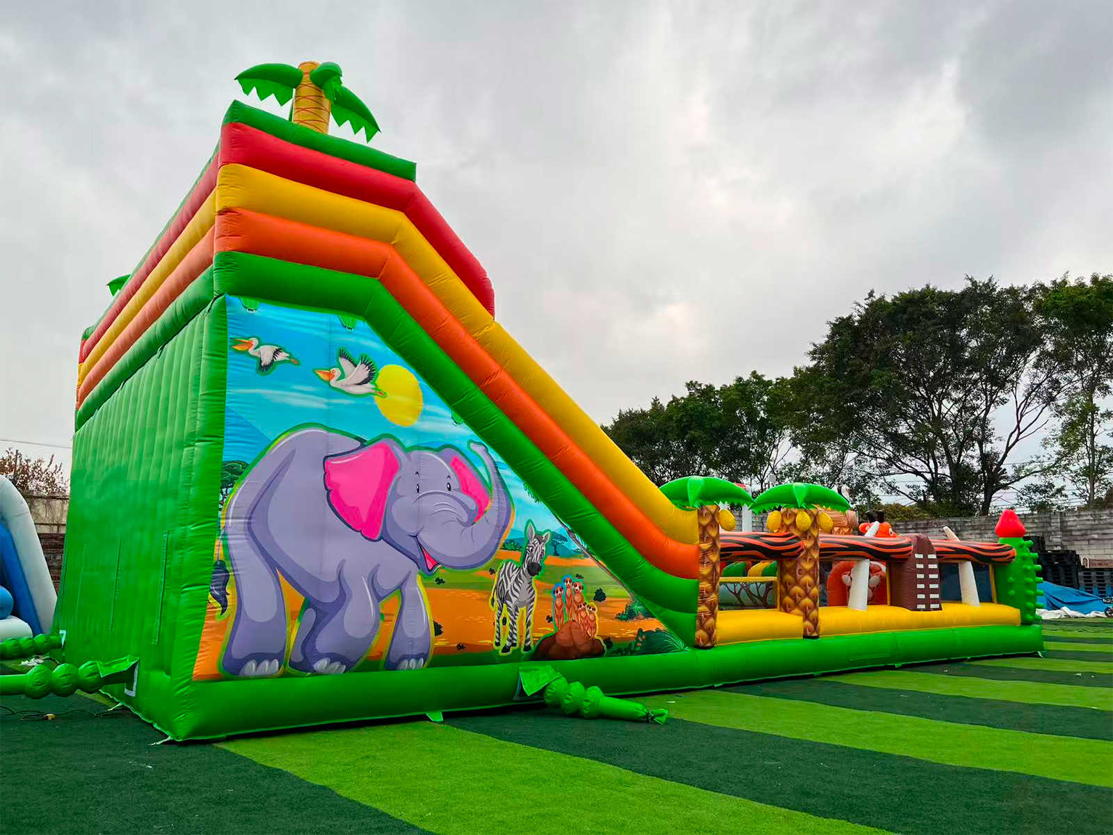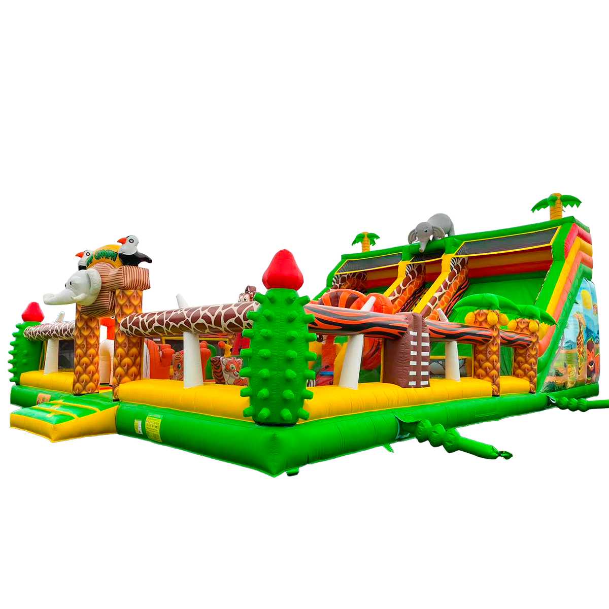 Надувной батут «Сафари Ультра» — это яркий, насыщенный деталями коммерческий аттракцион, в котором каждый ребёнок почувствует себя героем африканских джунглей. Огромная игровая зона 15x10x7.5 м включает в себя множество элементов: высокий скалодром, две горки со стартовой высотой горки 3,5 м, место для прыжков и бега, а также декоративные и игровые фигуры — львов, попугаев, тигров, слонов и пальмы. Всё это создаёт эффект присутствия в настоящем сафари! 🐘🦜🌞