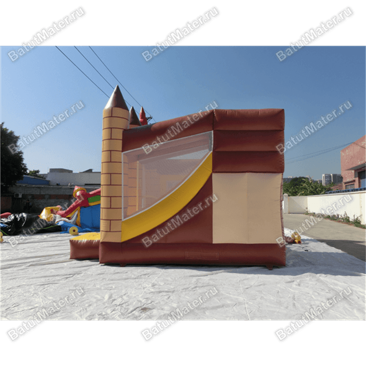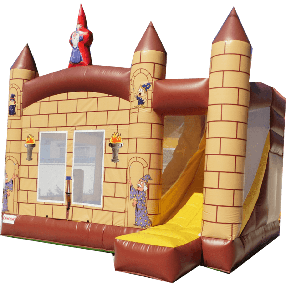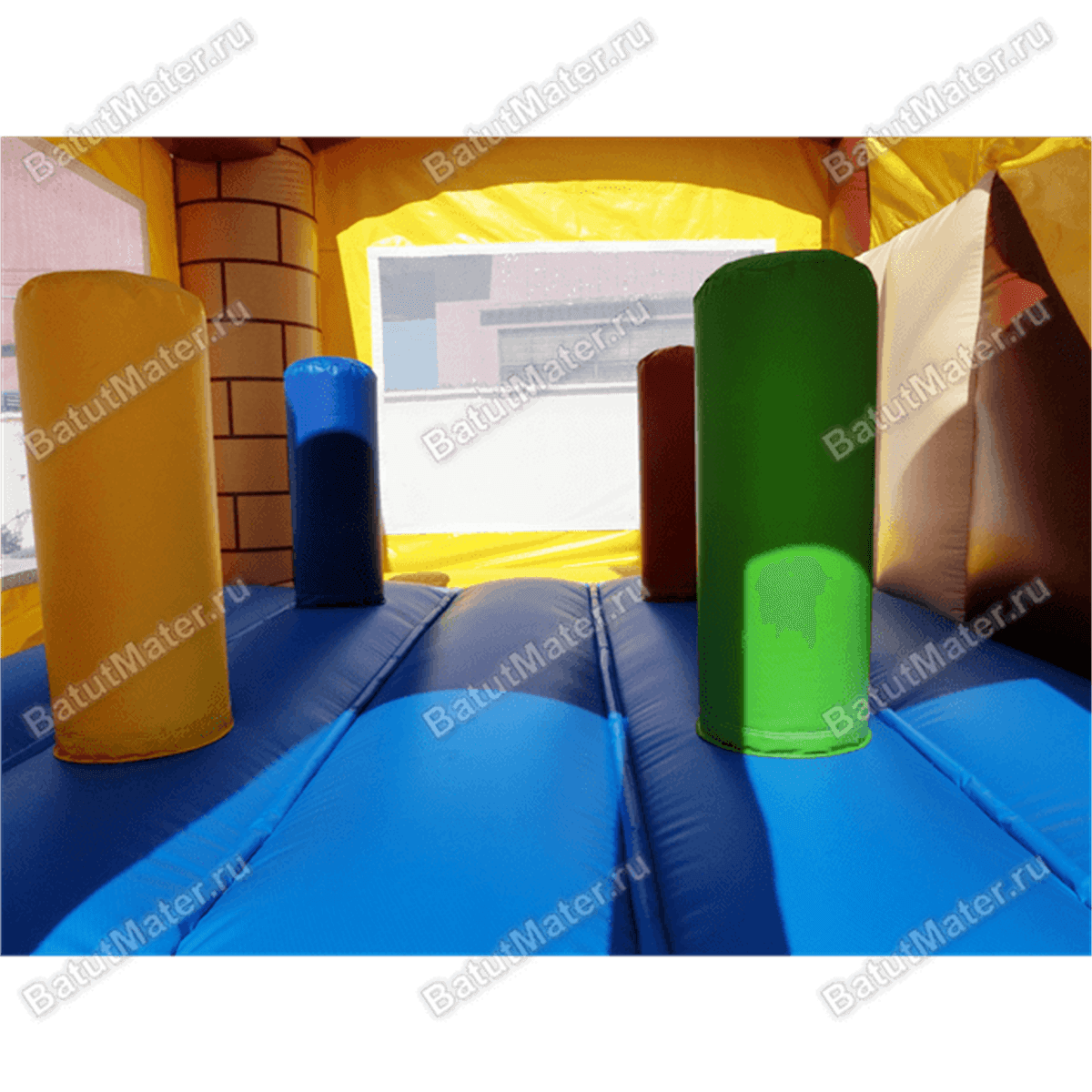 Сам аттракцион состоит из 2 частей: домик и безопасная горка, скатываясь с которой, проезжаешь мимо арки с башнями. Остроконечные башни в виде конуса еще раз напоминают, что это почти настоящая крепость, этому способствуют также небольшие окошки и нарисованные факелы. Внутри игровой площадки расположены разноцветные игровые столбы, позволяющие резвиться еще веселее и радостнее.