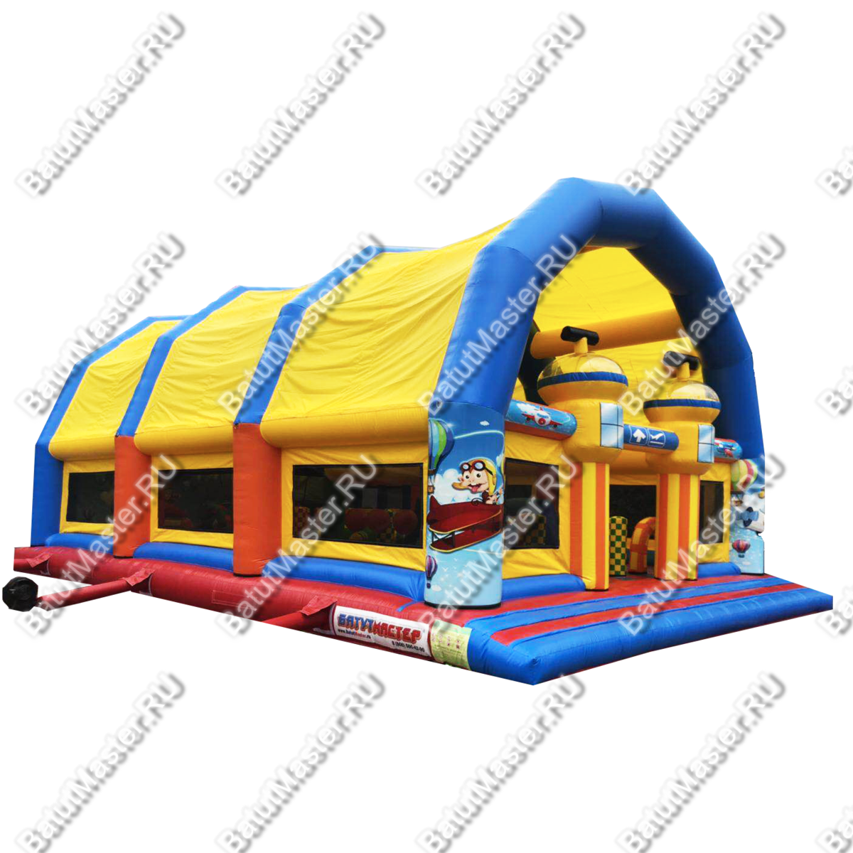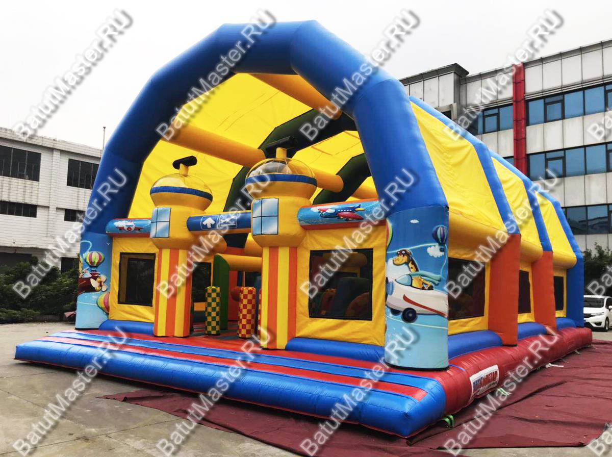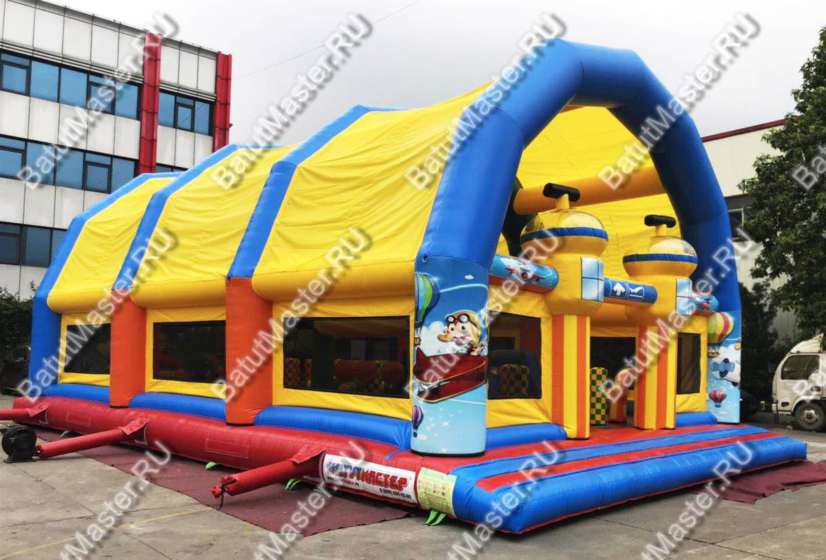Надувной развлекательный центр «Сказочный комплекс» представлен в виде крытого павильона с открытой передней стеной в качестве входа внутрь. Внутренняя игровая зона разделена на две половины, с каждой стороны имеются различные спортивные снаряды. Отличием данной модели считается горка внутри батута, попасть на нее можно посредством надувных ступеней. Среди надувных дополнений стоит отметить скалодром, округлые башенки с пологим внутренним отсеком, пружинистые мини-батуты, многоярусные пирамиды и вертикальные, а также горизонтальные столбики.