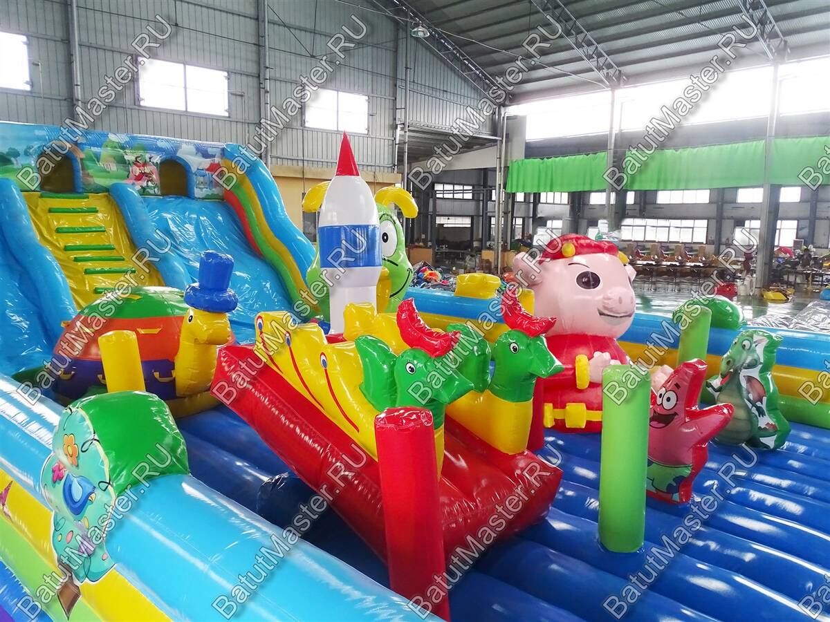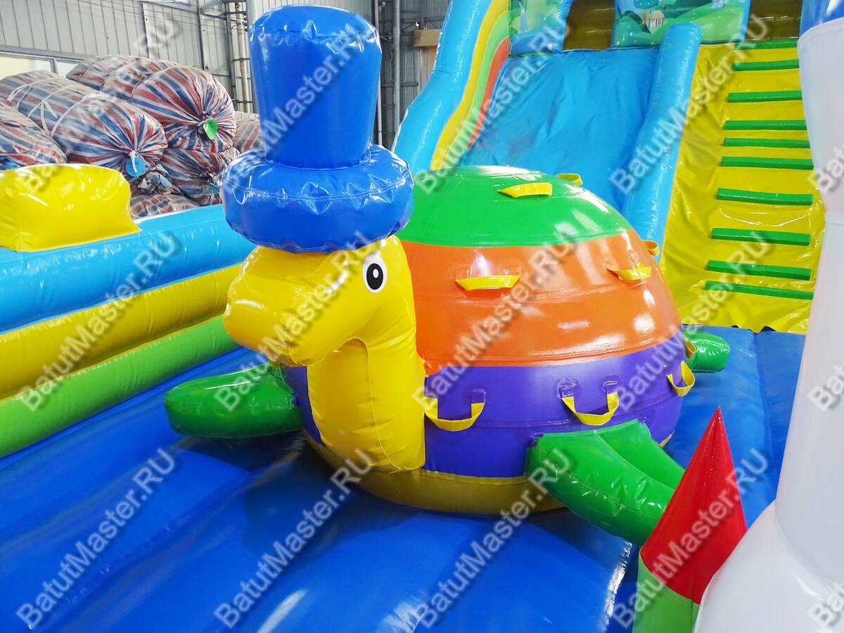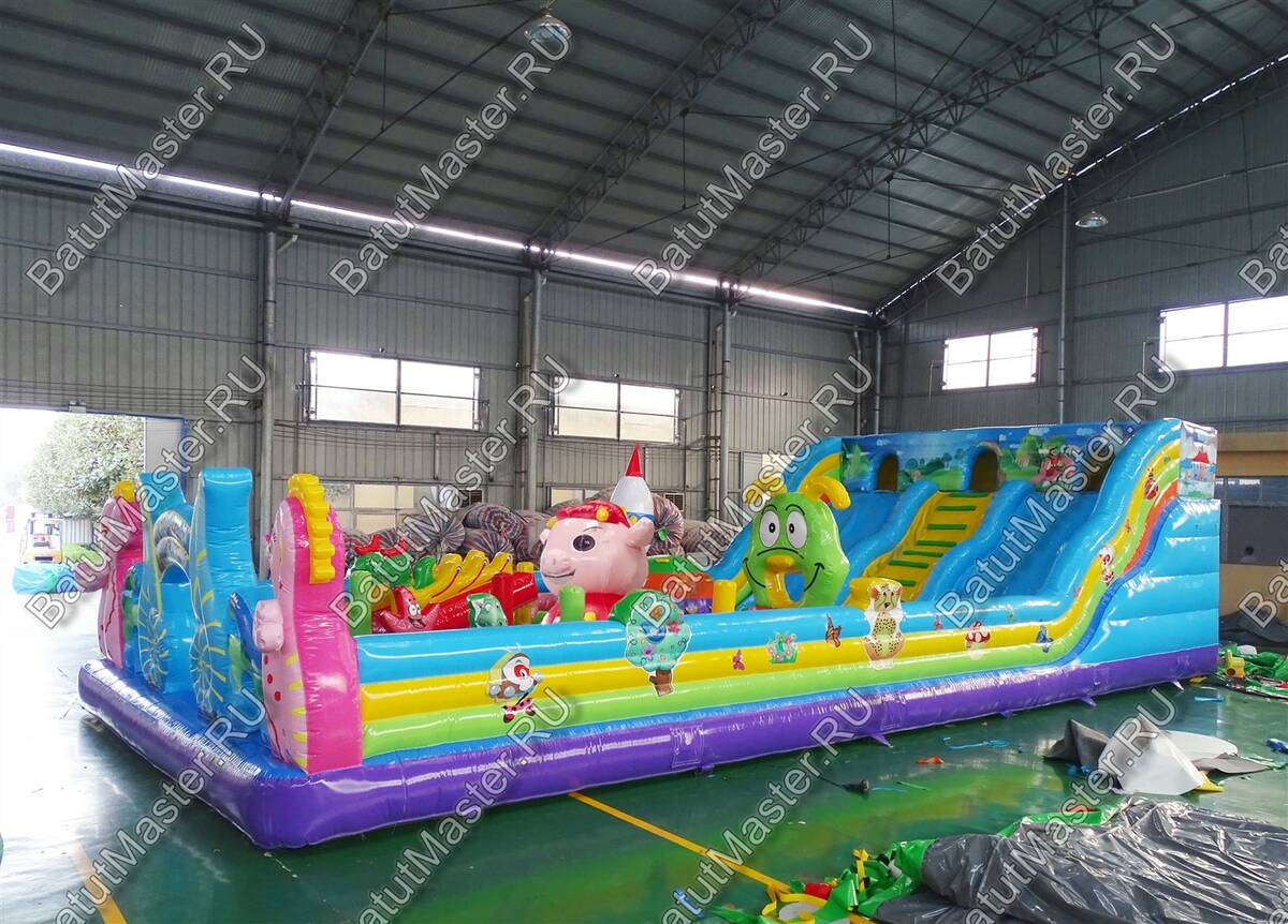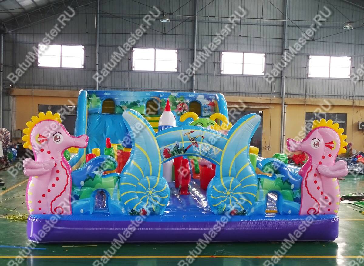 Мальчишек и девчонок с радостью встречает сказочный мир! Средний по габаритам надувной батут оснащен яркими и тематичными модулями. Черепашки, морские коньки, улитки и многое другое делают комплекс невероятно ярким и современным. Здесь достаточно места для того, чтобы дети смогли придумать подвижные игры. Стоит отметить большую зону для прыжков, что так любят дети. Они непременно оценят данную модель игрового комплекса, так как здесь все придумано для того, чтобы можно было бесконечно лазать, прыгать и спускаться. Две горки и один широкий подъем дают возможность забираться на нее большой командой. Над горками есть небольшие домики, где дети смогут играть в прятки. Повсюду надувные элементы в виде морских обитателей и растений. Каждая деталь здесь яркая и притягивает взгляд. Большой клоун, стоящий в середине арены, задает тематику циркового представления. Надувной батут с различными элементами был разработан специалистами специально для маленьких детей.