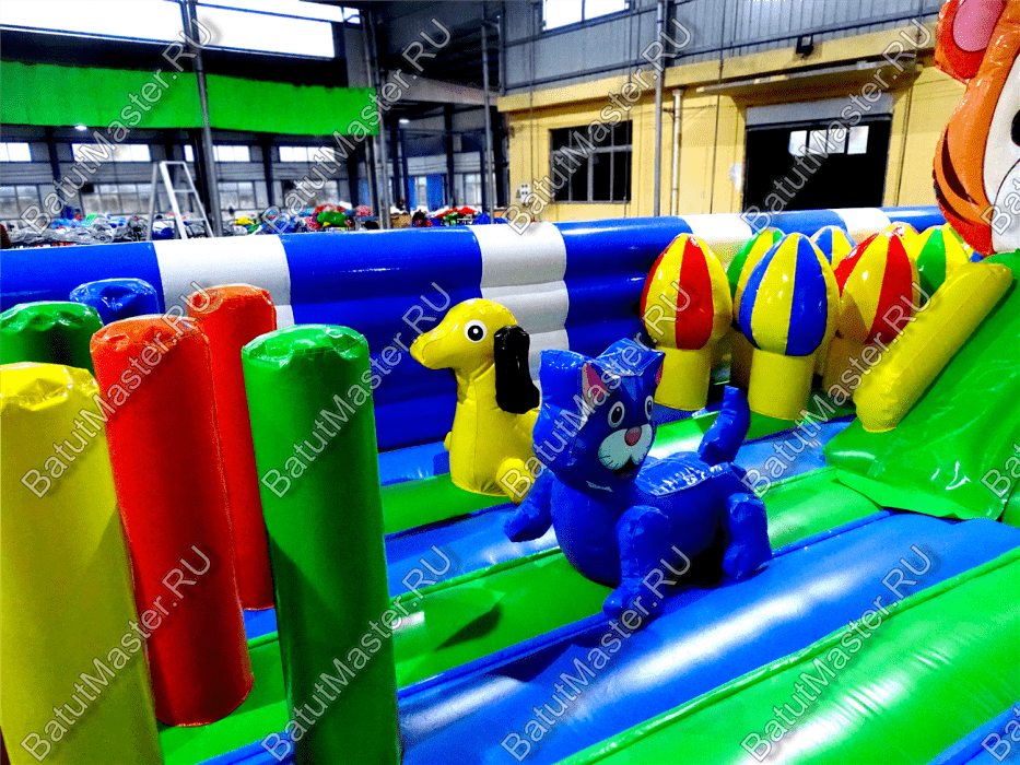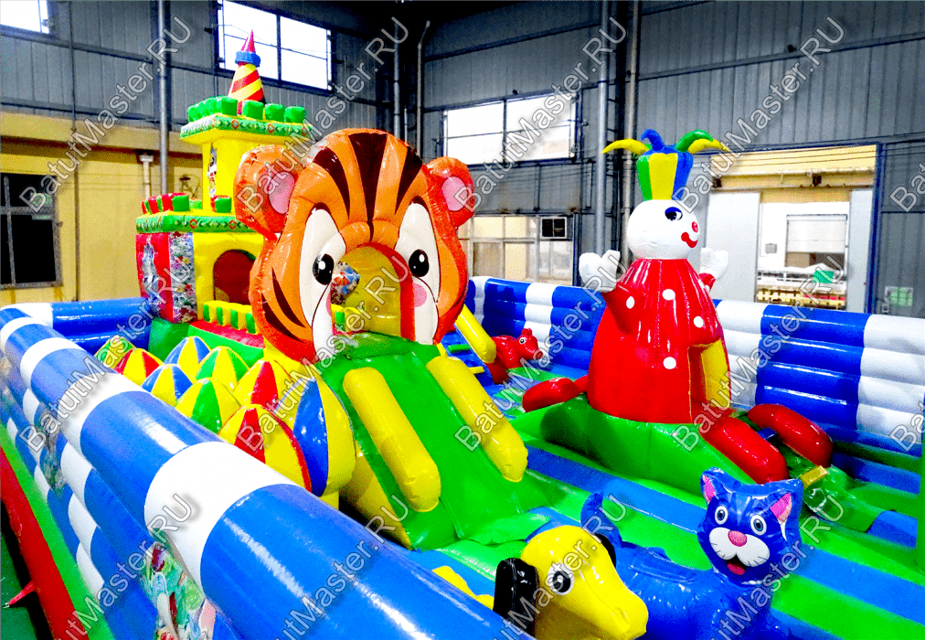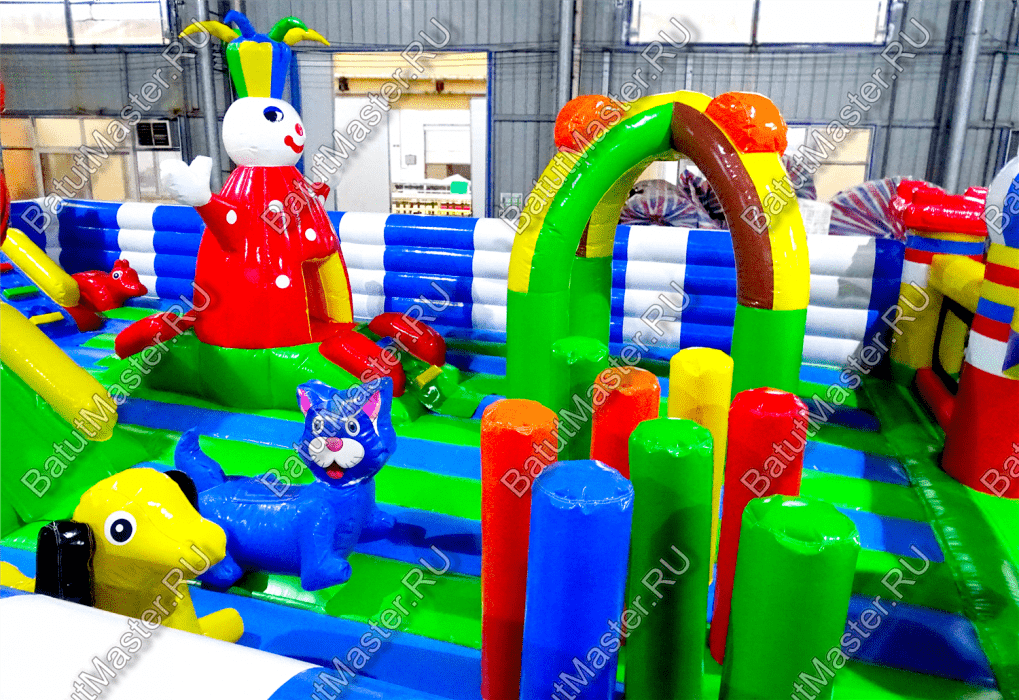 Вход внутрь сказочного двора оформлен массивными колонами из мягкого натяжного полотна. Посетители попадают с настоящее сказочное королевство с необычными развлечениями – здесь есть уникальная горка в виде мягкого кота с заходом сзади и спуском к центральной части аттракциона. Верхняя площадка крытая, малыши, как бы проходят сквозь гигантского зверька. На открытой плоскости расположены красочные игровые элементы – фигурка-клоун, полая внутри, надувной домик в виде замка, где можно спрятаться, преграды и спортивные тоннели, вертикальные столбы и тематические сказочные детали.