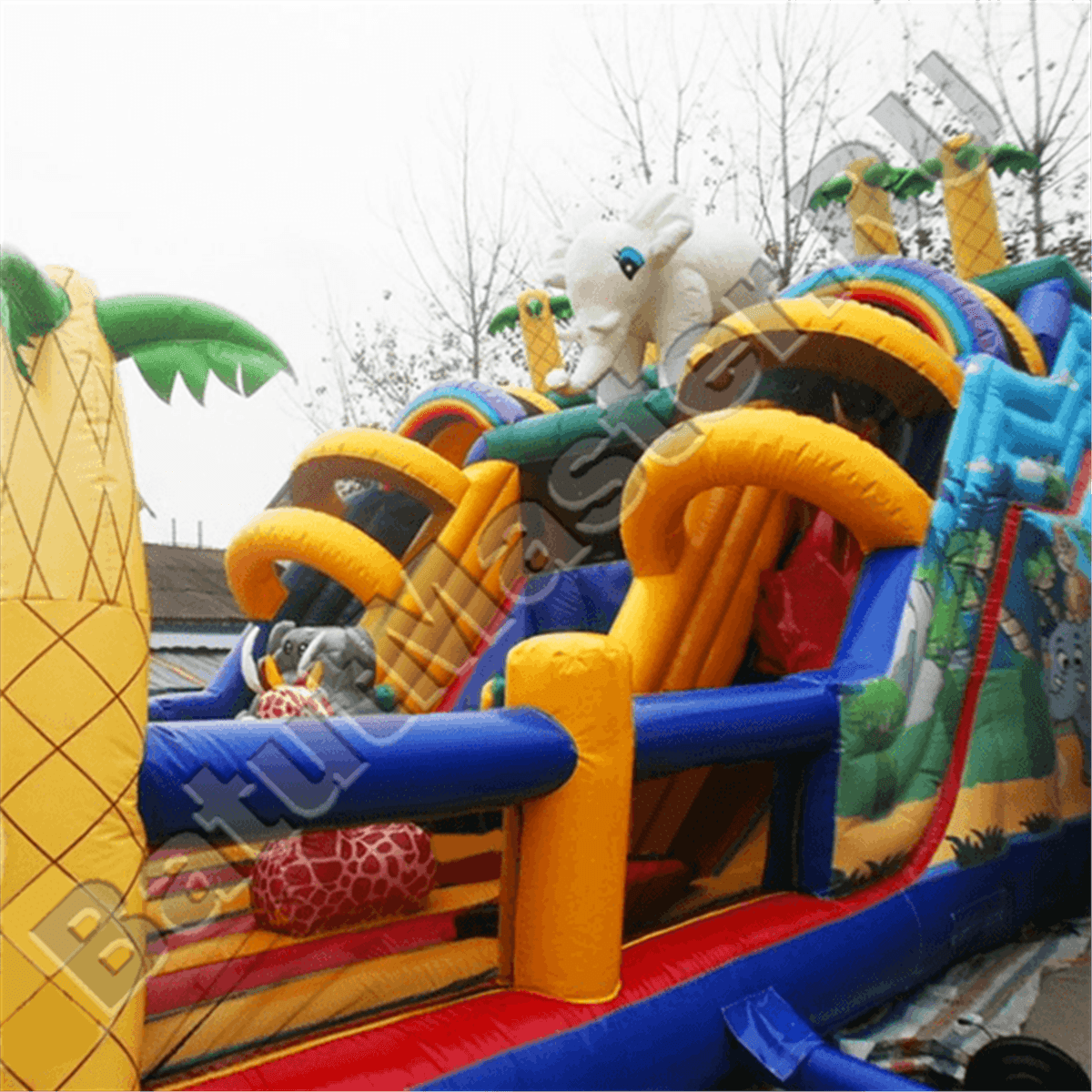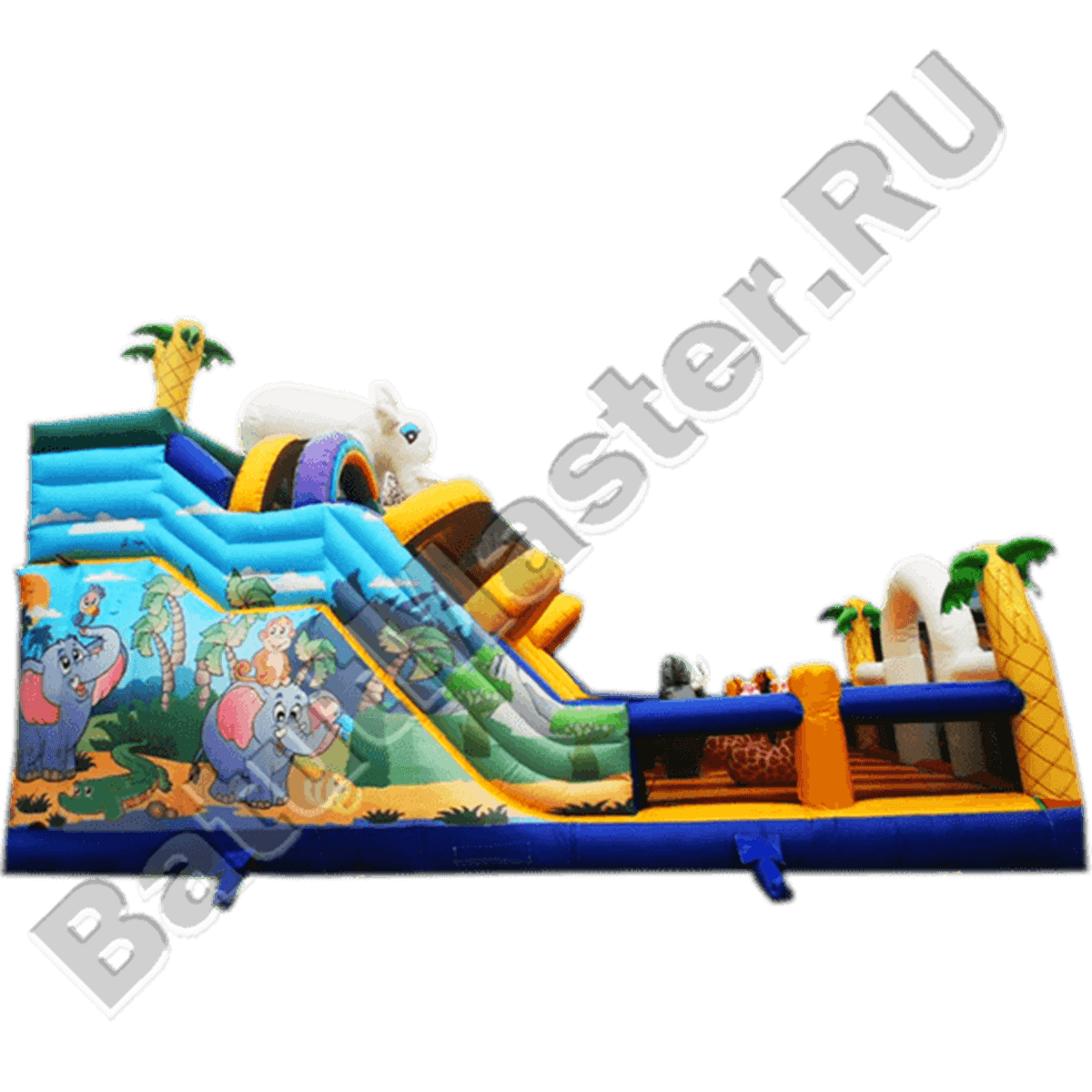 С середины батута начинается высокая горка, она поделена на две полосы по бокам и центрального входа наверх. Спусковые полосы имеют верхние ограничители в виде арочных дуг с прочной сеткой между ними. Крышу аттракциона венчает фигурка белого слоника, которого видно издалека.