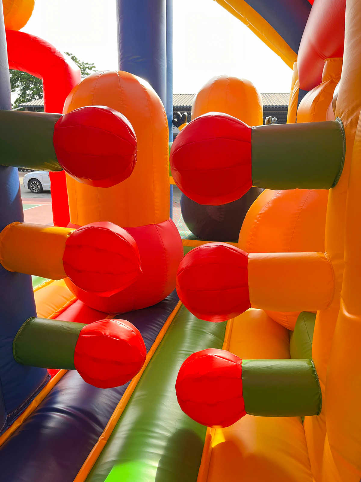 Безопасность — приоритет №1. Батут выполнен из армированного ПВХ высокой плотности (690 г/м²), устойчив к механическим повреждениям и рассчитан на нагрузку до 1200 кг. Все элементы мягкие и упругие, что минимизирует риск травм.