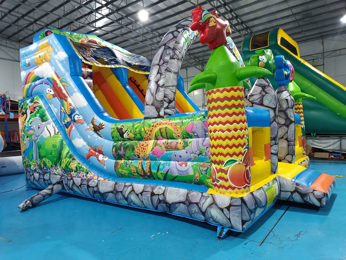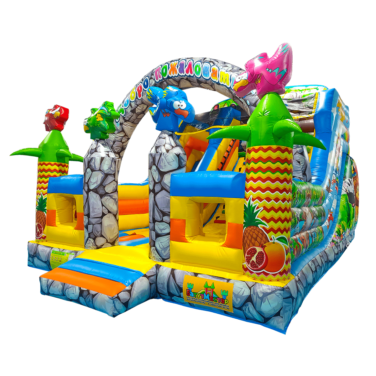 Верхняя часть стартовой площадки оборудована сеткой, а на самую заднюю стенку нанесены изображения животных из мультиков. Фасадная часть (колонны) вверху украшена фигурами надувных пальм и птиц. Нижняя основная платформа имеет окрас натуральных камней. Но самые яркие элементы в этом аттракционе – внешние стороны, изображающие животных из известных мультфильмов.