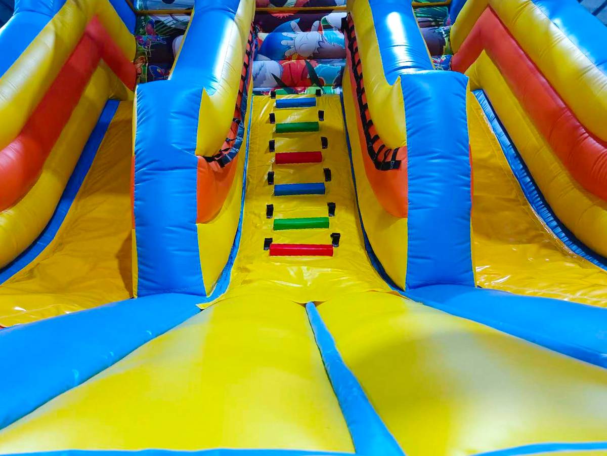 Начинается надувной батут с небольшой подушки безопасности, которая исполняет роль входа. Боковые стороны фасадной стенки – оконные проемы из прозрачной пленки, зафиксированные между высокими столбами. Именно здесь ребенок переступает порог батута и попадает в первую зону игр и прыжков.