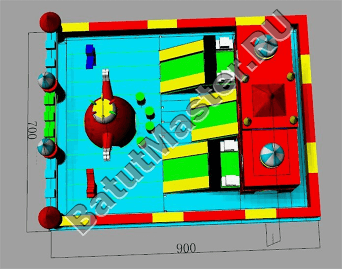 Внешний борт батута – зеленый, а чуть выше него начинается сама платформа, по которой необходимо будет прыгать, скакать и кувыркаться. Она выполнена в синей расцветке. С трех сторон площадка обнесена надувным забором в виде мягких бревен красного цвета с белыми горошинками и желтыми перпендикулярными полосами.