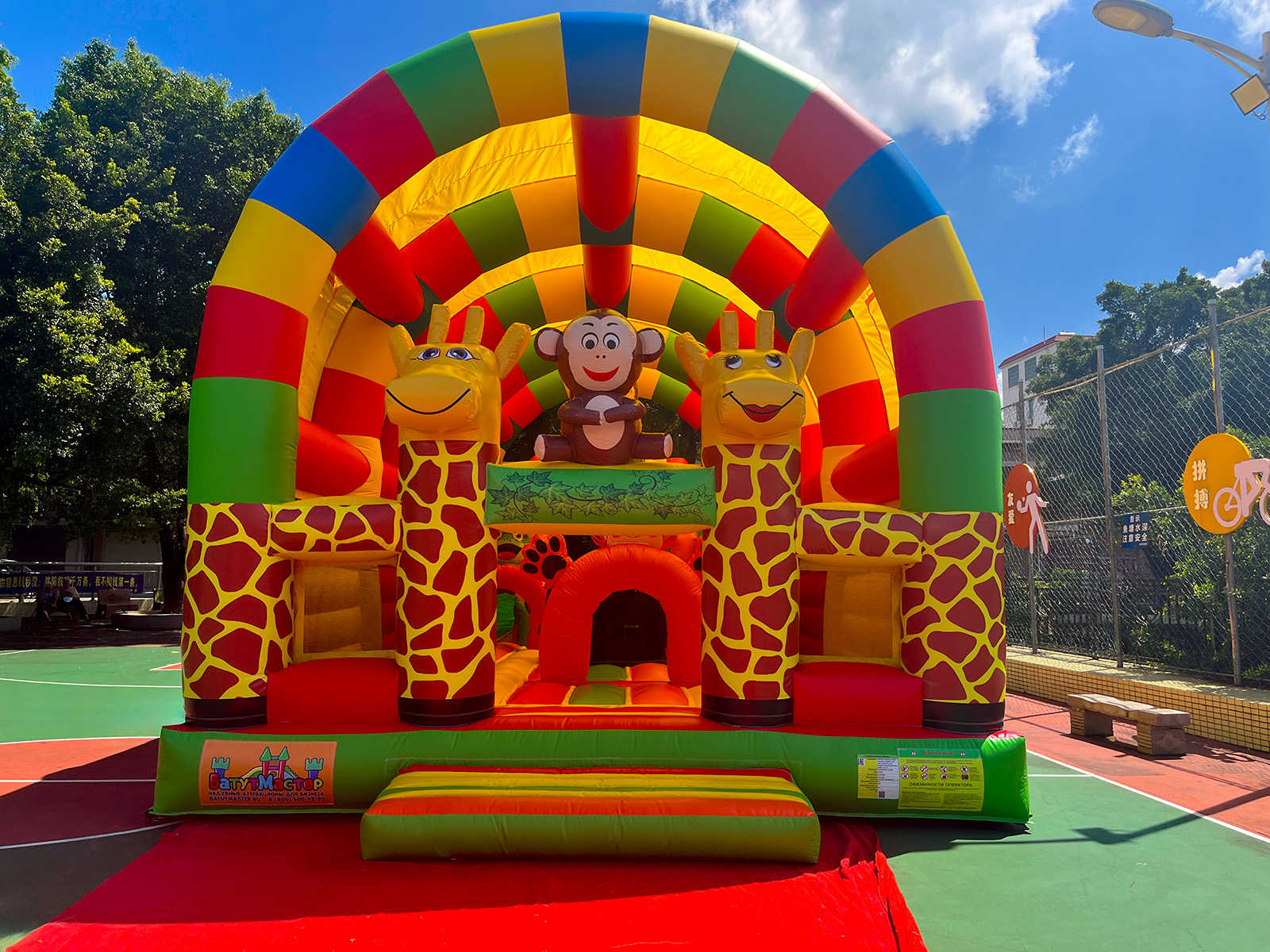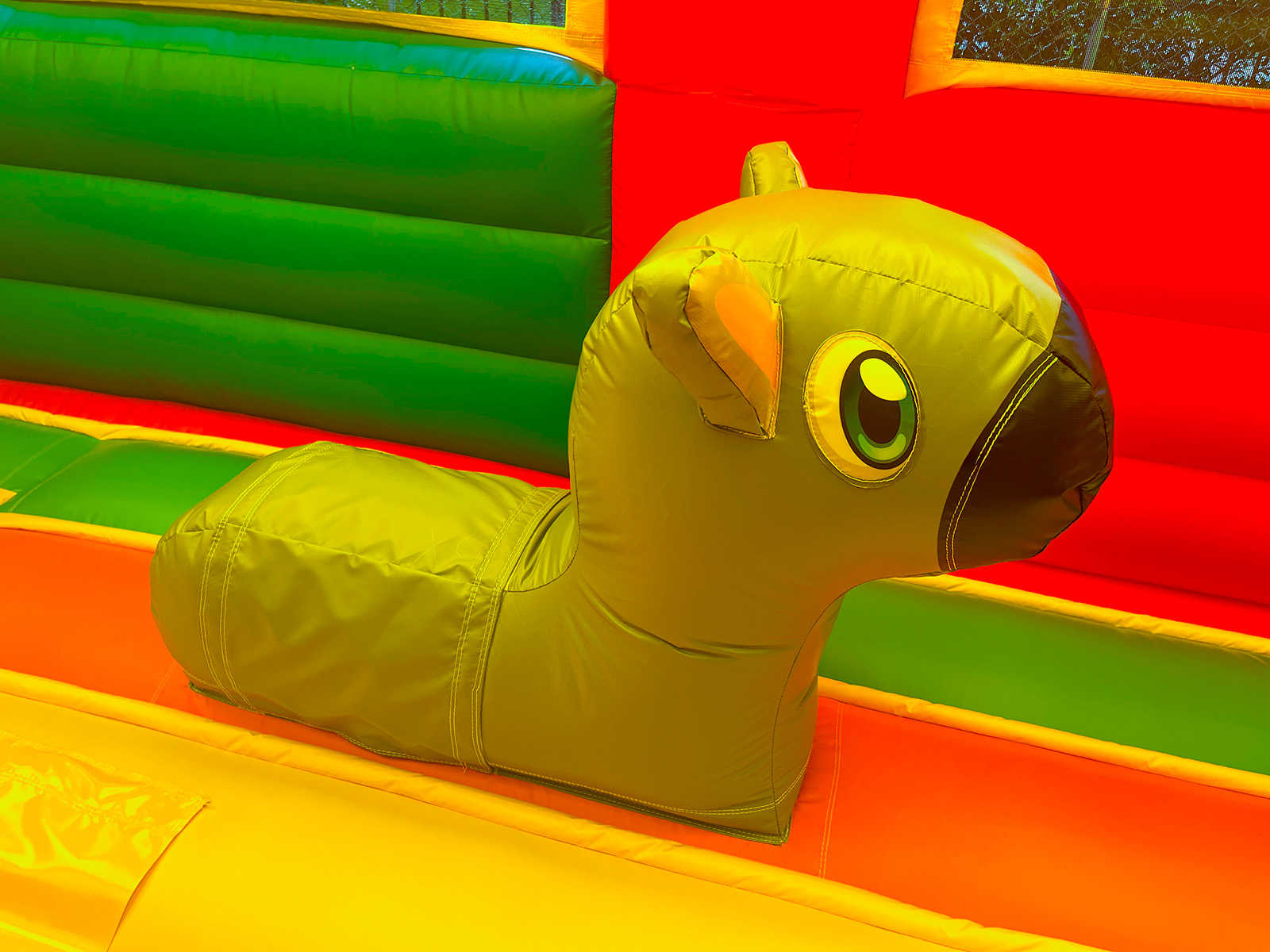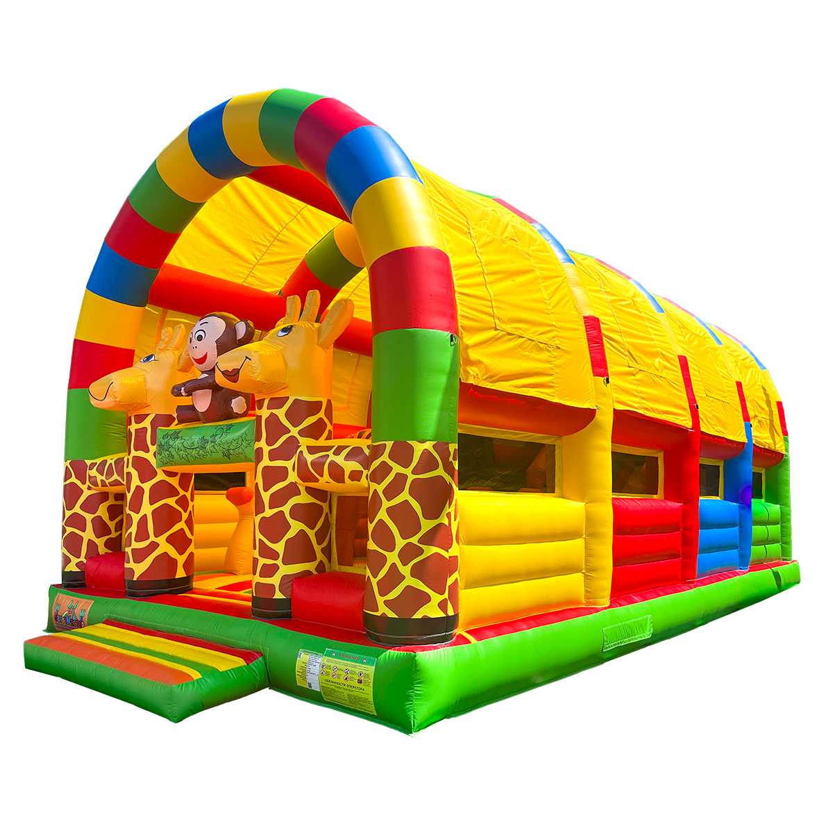 Конструкция идеально продумана как для размещения на открытом воздухе, так и в крытых залах. Аттракцион выполнен в яркой джунглевой тематике: жирафы, лягушки, пони, обезьянки и другие животные в объёмных фигурах превращают батут в сказочную зону приключений.