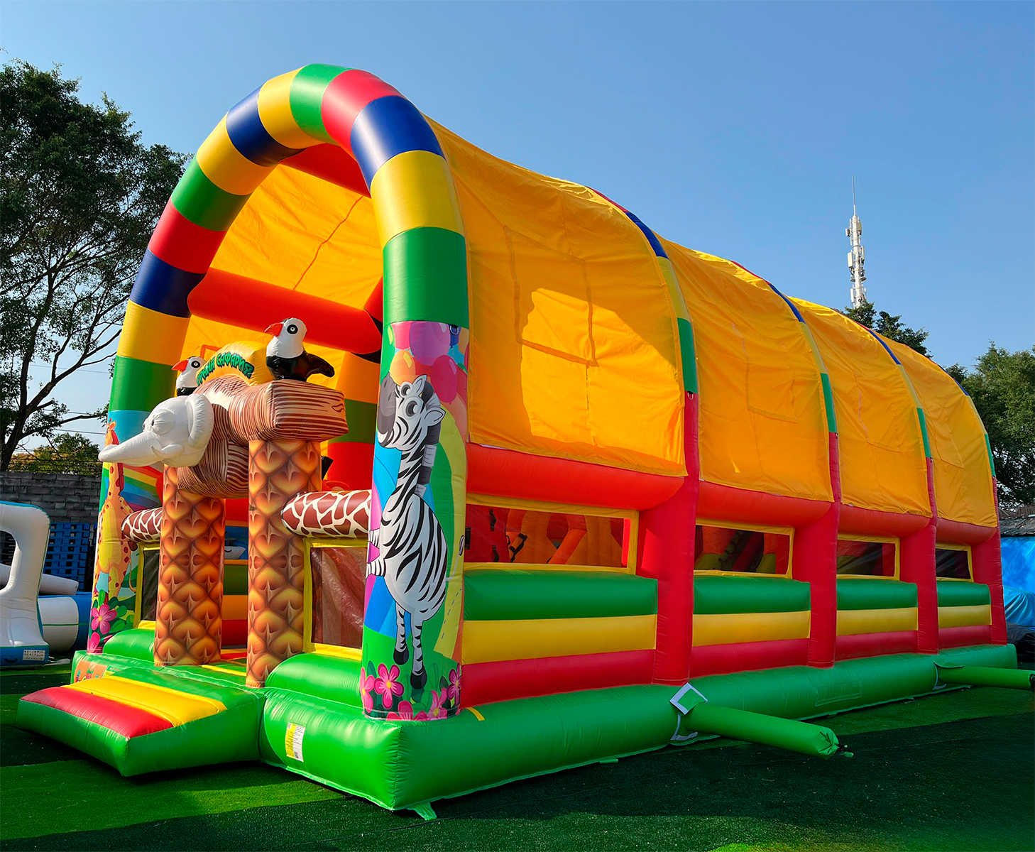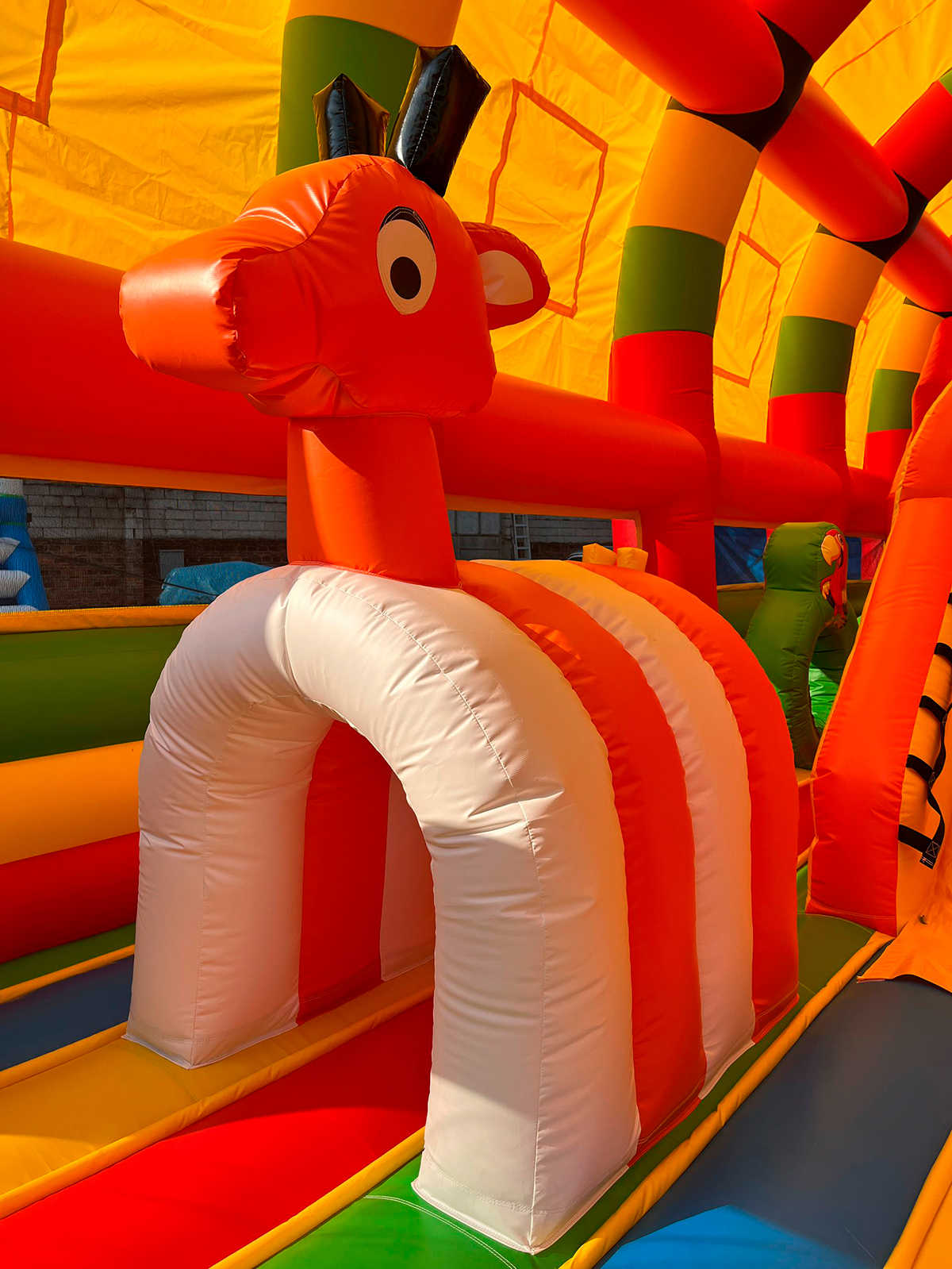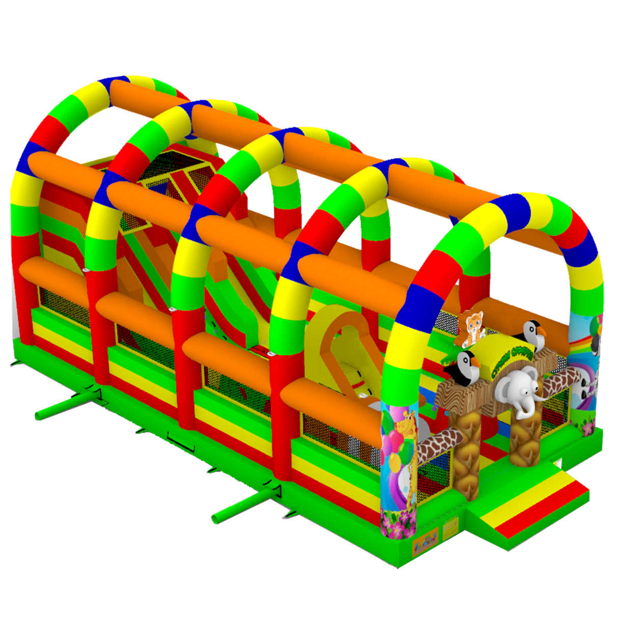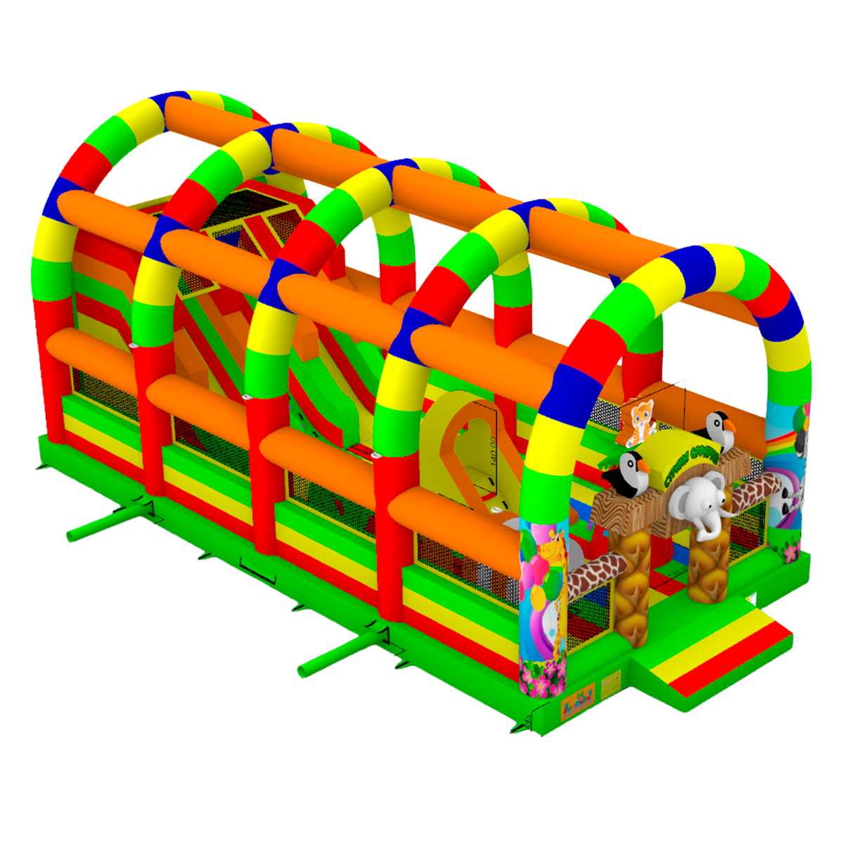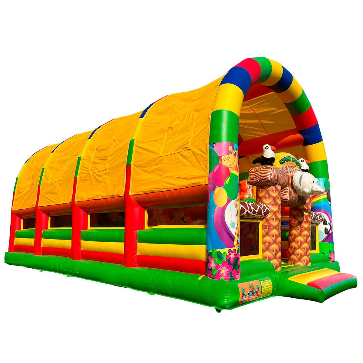 Надувной батут «Страна Сафария 2» — это уникальный аттракцион размером 12x6x6 м, созданный для коммерческого использования. Он выполнен из прочного армированного ПВХ и рассчитан на интенсивные нагрузки. Яркое оформление в стиле сафари и джунглей с милыми надувными фигурками животных делает батут центром притяжения детей и взрослых на праздниках, фестивалях, в парках, лагерях, торговых и выставочных центрах. Благодаря двум горкам, скалодрому и множеству игровых элементов, дети погружаются в активное и увлекательное приключение, которое не надоест часами!
