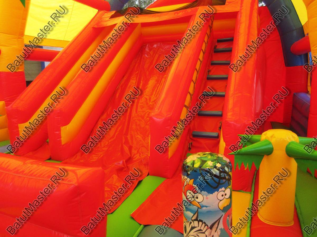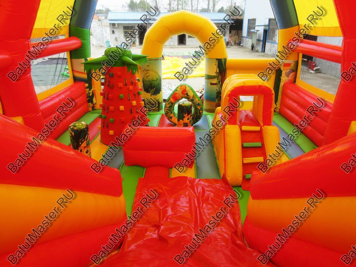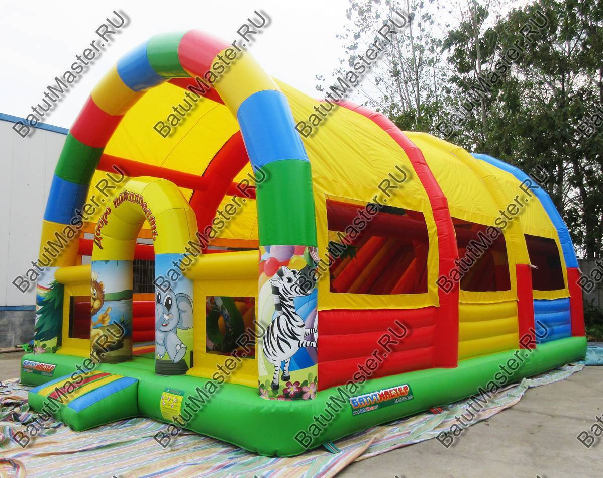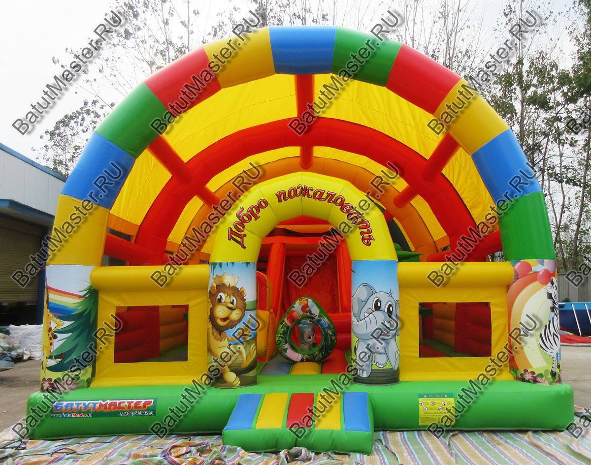 Надувной батут коммерческий для бизнеса детям захочется разглядеть посильнее и подойти как можно ближе. Снаружи он яркий и красочный, а внутри есть горка с подъемом, мягкие модули, на которые можно забираться. На входе юных игроков встречают рисунки, где изображены забавные львы, слоники, жирафы. Здесь есть не только большая горка, но и спуск для самых маленьких, кольцо с изображением попугаев. Надувной батут коммерческий для бизнеса развивает и обучает одновременно.