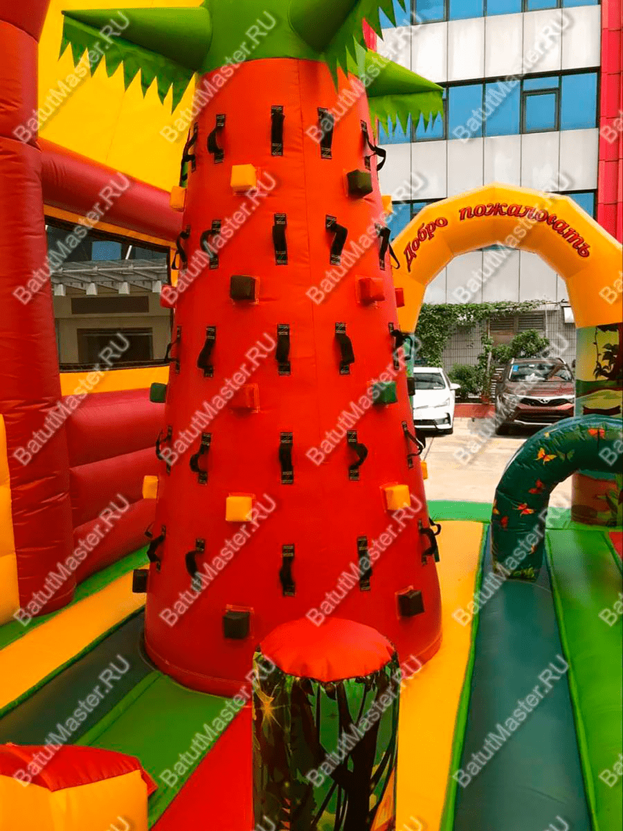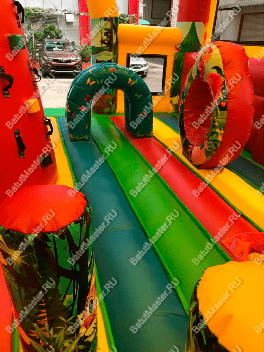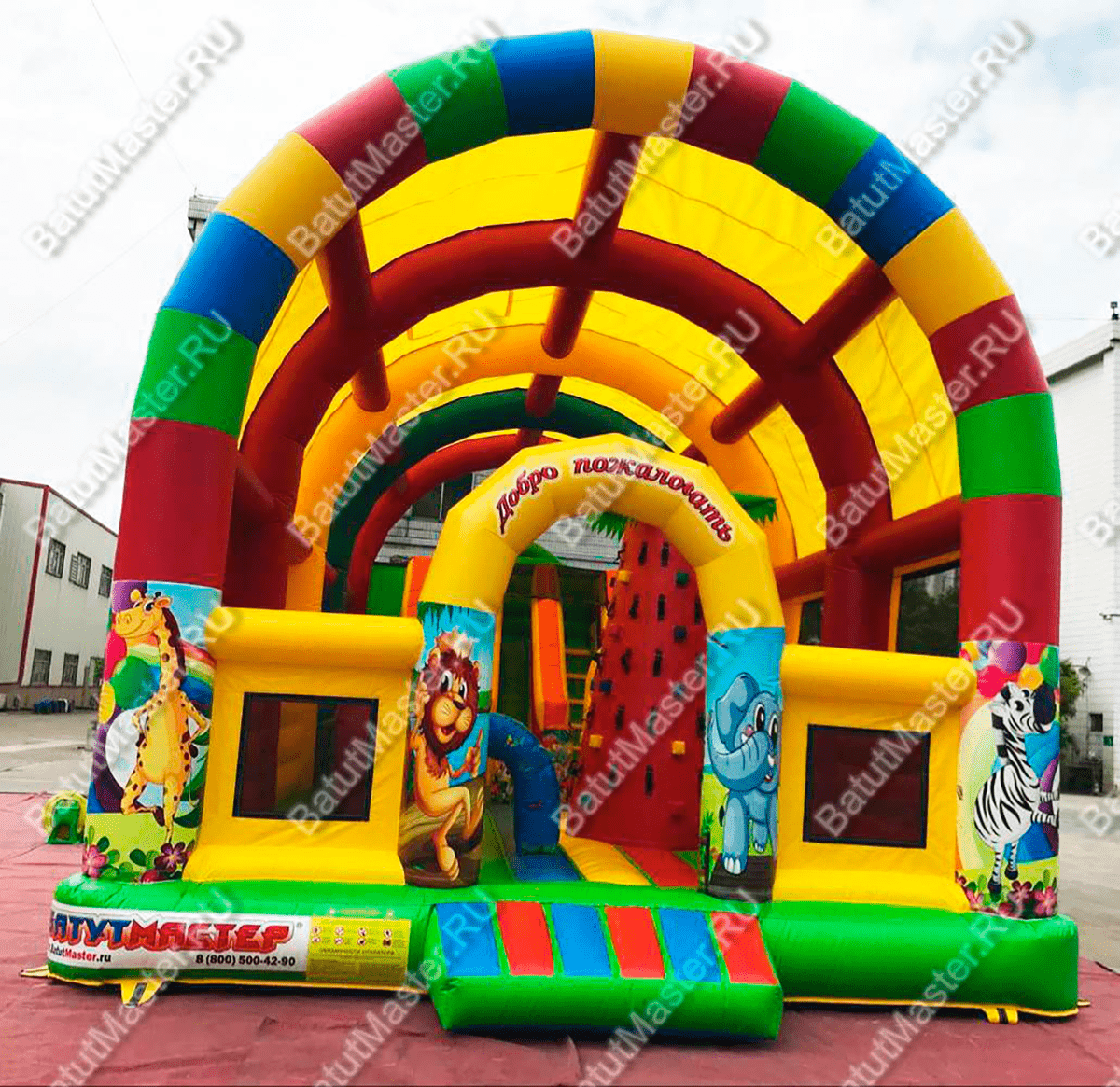 Огромный, с большим количеством различных элементов коммерческий надувной батут «Страна Сафария» поразит любое детское воображение. Этот батут универсален, ведь он будет интересен как малышам, так и детям постарше.