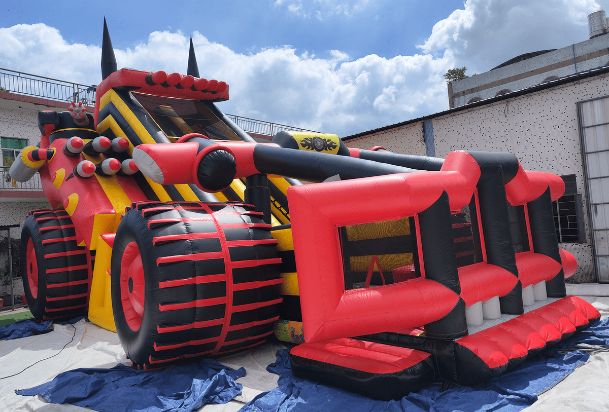 «Супер Бульдозер MAX» — это надувной батут-аттракцион, который сочетает в себе мощный дизайн, крупные размеры и продуманную функциональность. Он создан для того, чтобы выделяться, собирать очереди и приносить прибыль. Размер 15x8x9 м позволяет одновременно развлекать до 34 детей, обеспечивая высокую рентабельность. С первого взгляда батут напоминает фантастический боевой автомобиль с мощными колесами, шипами и декоративными ракетами, что делает его особенно привлекательным для мальчишек и подростков.