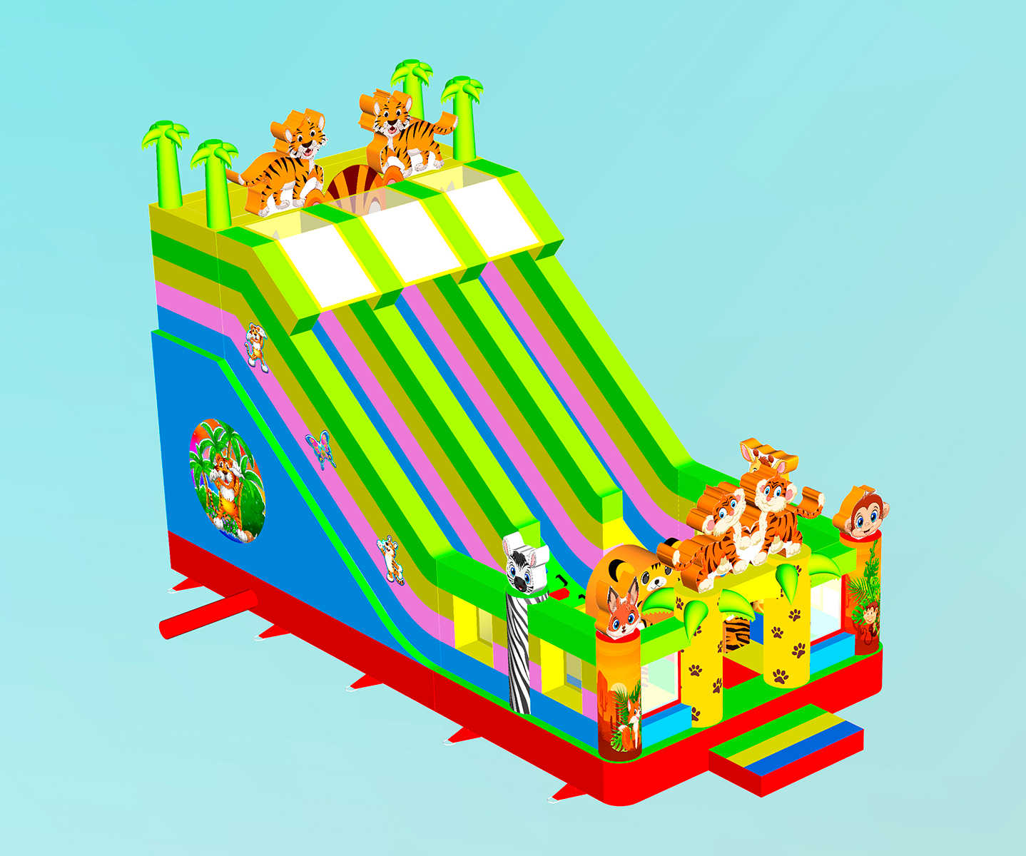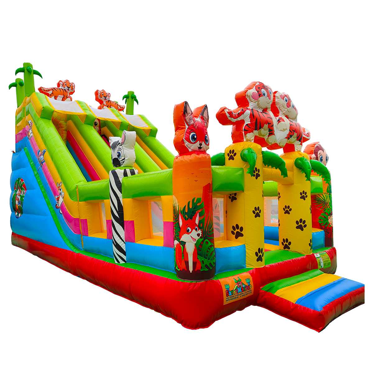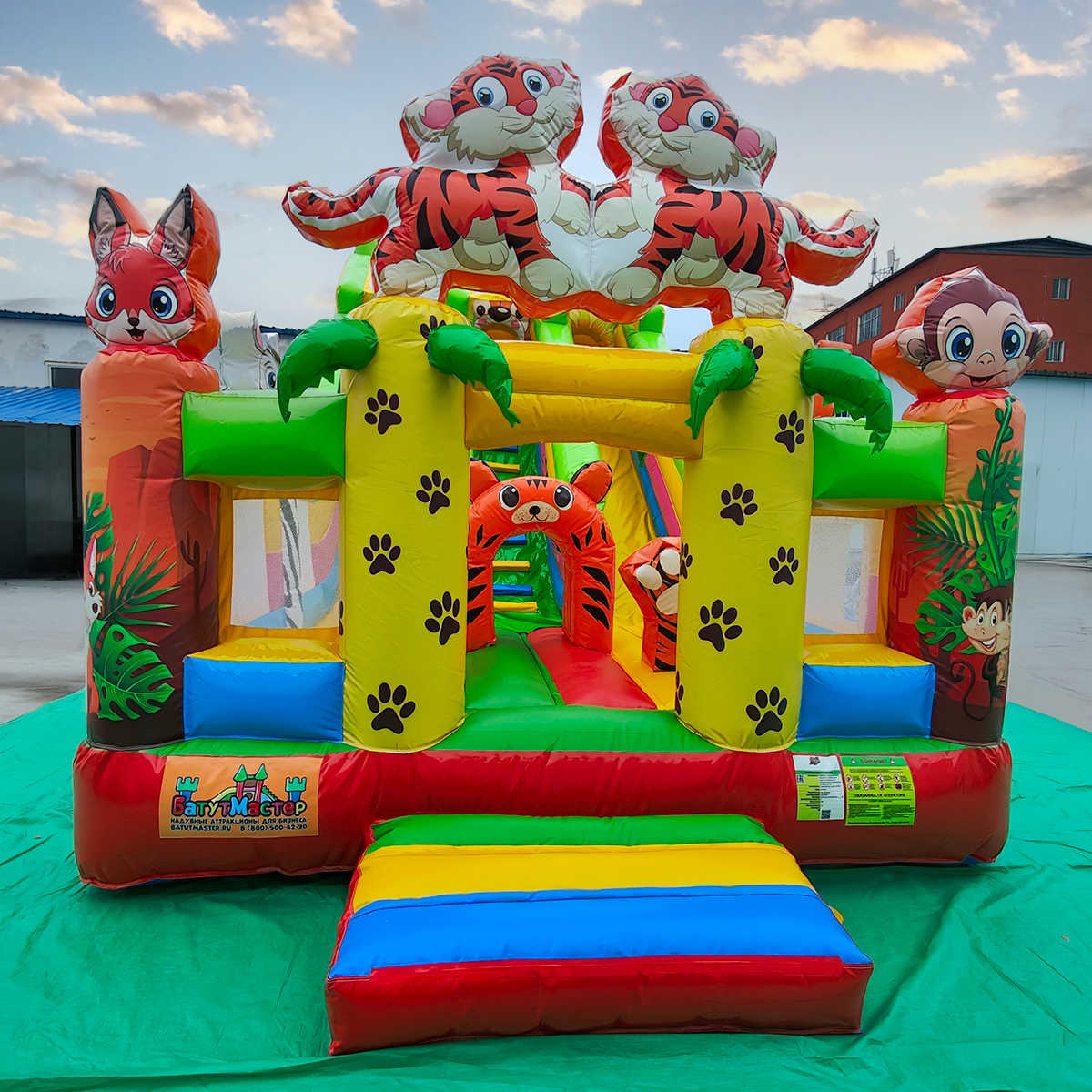 Коммерческий надувной батут «Тигриная страна 4» 8x4x5 м — это масштабный и эффектный аттракцион, который превращает любое пространство в детский рай. Сочетая в себе горку, площадку для прыжков, арки, мягкие препятствия и декоративные фигуры, он сразу же становится центром внимания на любом мероприятии. Красочные изображения тигров, лисичек и зебр создают атмосферу джунглей, которая завораживает детей. Батут рассчитан на 9 детей одновременно и идеально подходит для коммерческого использования.