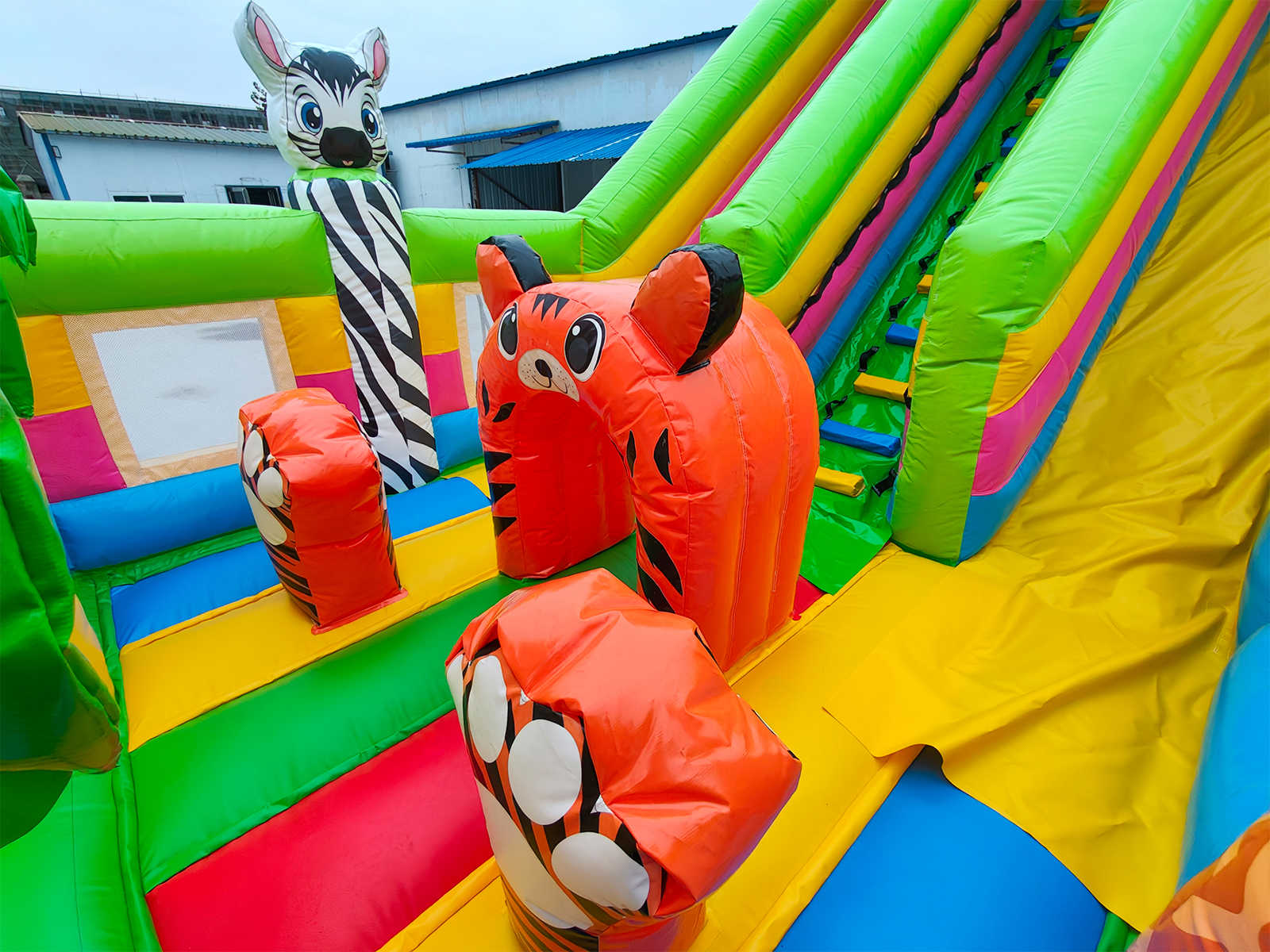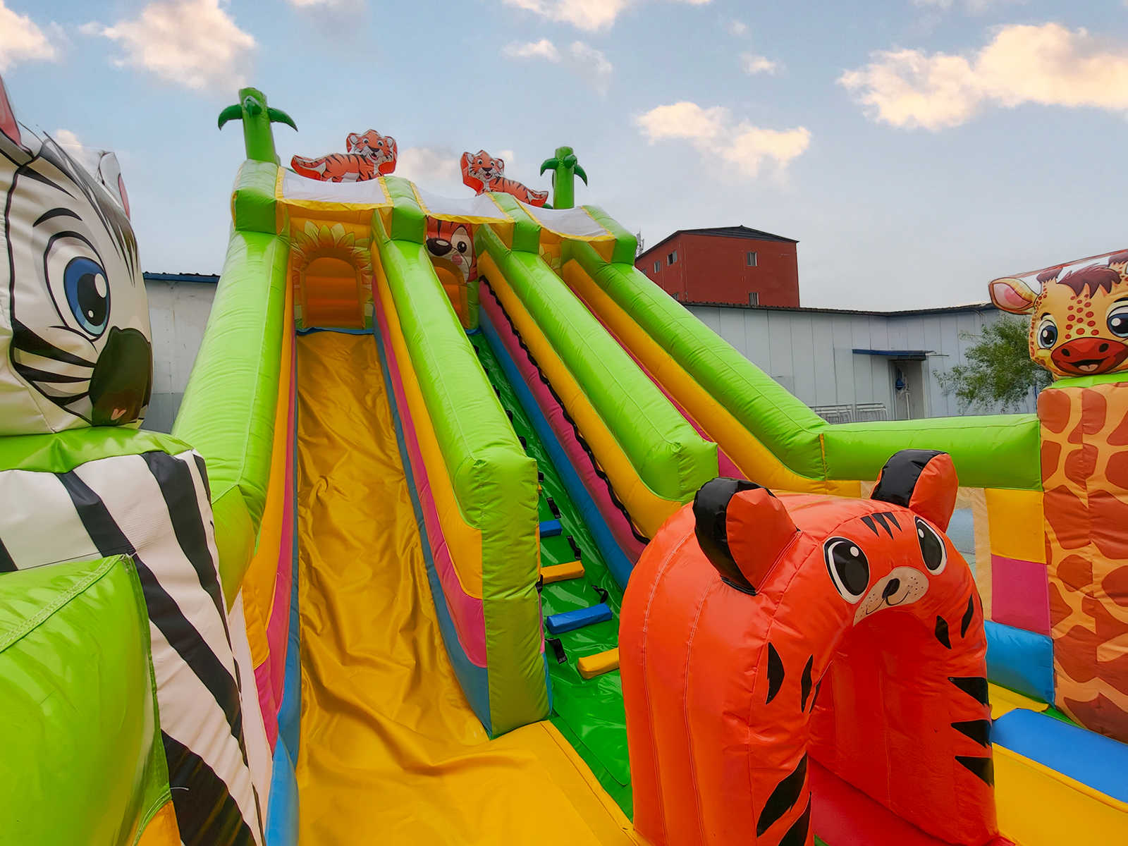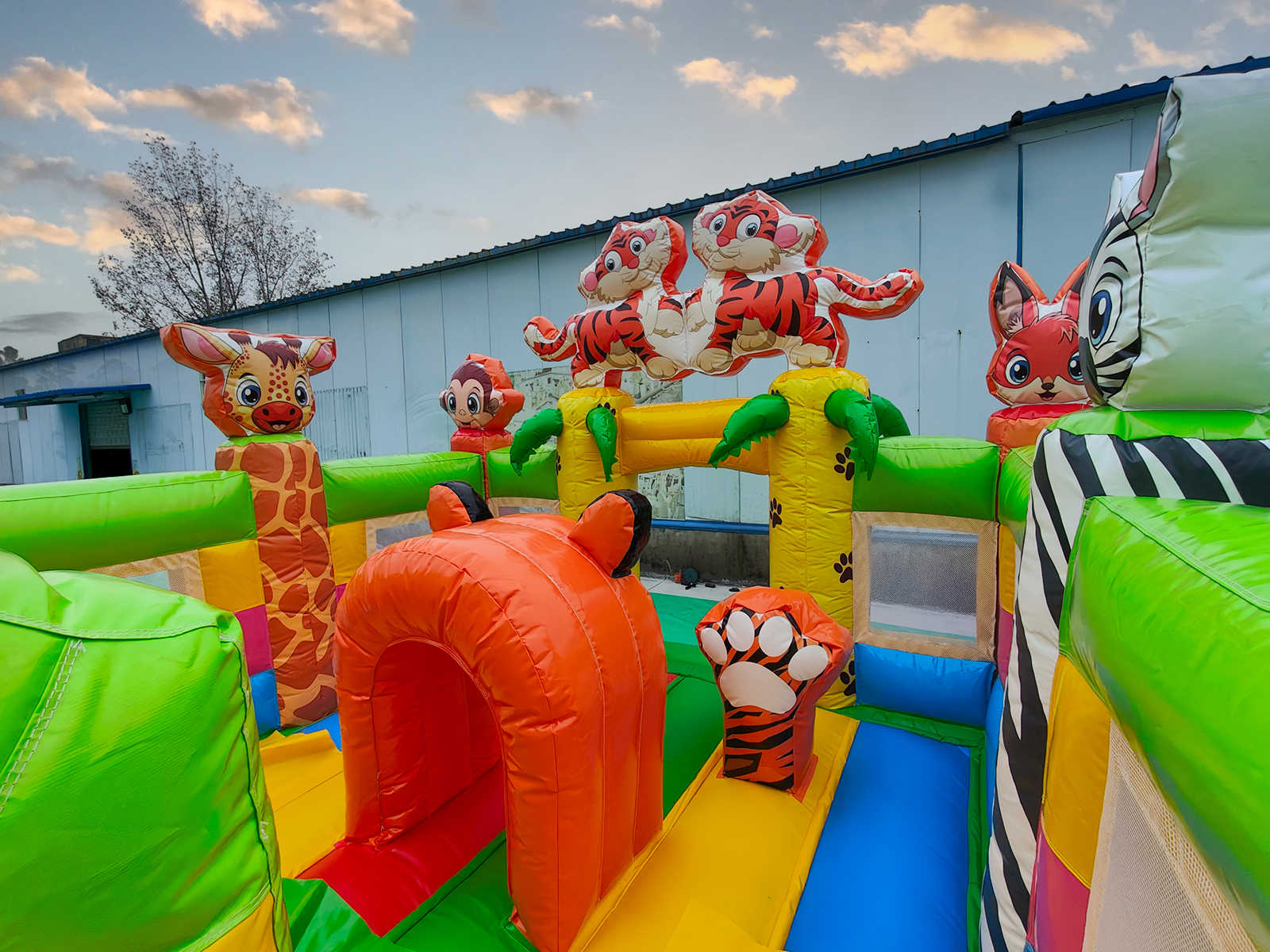 Коммерческий надувной батут «Тигриная страна 4» 8x4x5 м — это масштабный и эффектный аттракцион, который превращает любое пространство в детский рай. Сочетая в себе горку, площадку для прыжков, арки, мягкие препятствия и декоративные фигуры, он сразу же становится центром внимания на любом мероприятии. Красочные изображения тигров, лисичек и зебр создают атмосферу джунглей, которая завораживает детей. Батут рассчитан на 9 детей одновременно и идеально подходит для коммерческого использования.