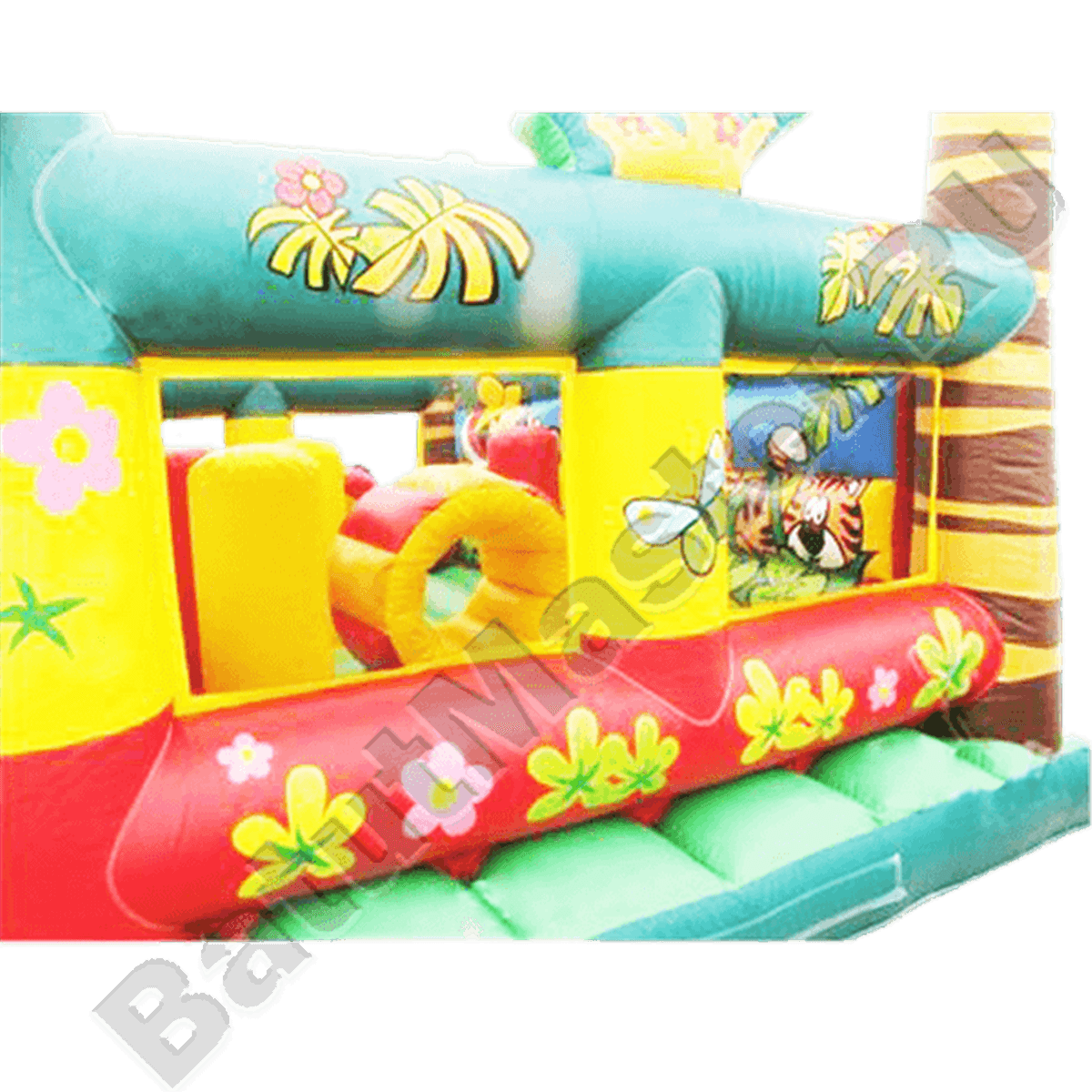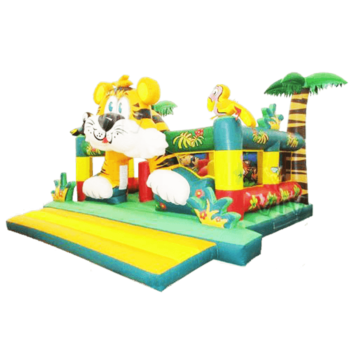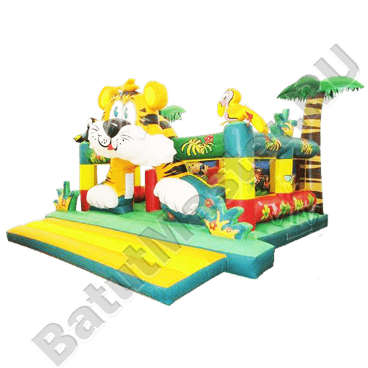 Оформление в стиле джунглей привлекает к себе внимание, переднюю стену венчает надувная фигурка тигра, между передними лапами которого образован вход внутрь игровой площадки. По углам батута установлены надувные пальмы, соединенные друг с другом горизонтальными плотными перепонками и сетчатым материалом.Красивые цвета и персонажи из джунглей выделяют эту модель среди остальных.