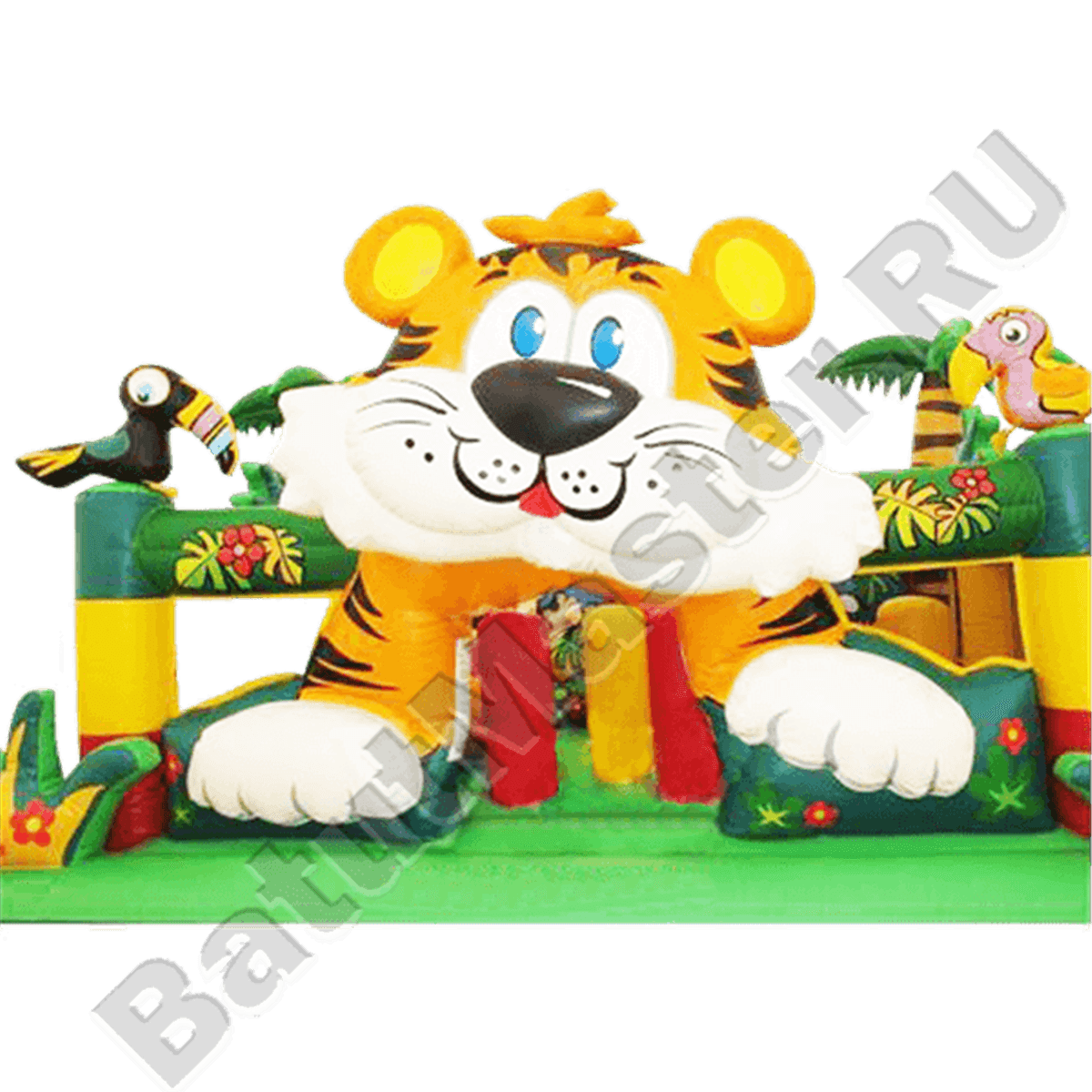 Надувной батут для маленьких любителей зверей. Большой и милый тигрёнок издалека привлечет детей! Надувной аттракцион состоит и игровой площадки в виде джунглей. Игровая площадка имеет защитные стенки, а внутри неё расположена полоса препятствий, на которой детям очень весело резвиться. Перед батутом есть широкая ступень безопасности.