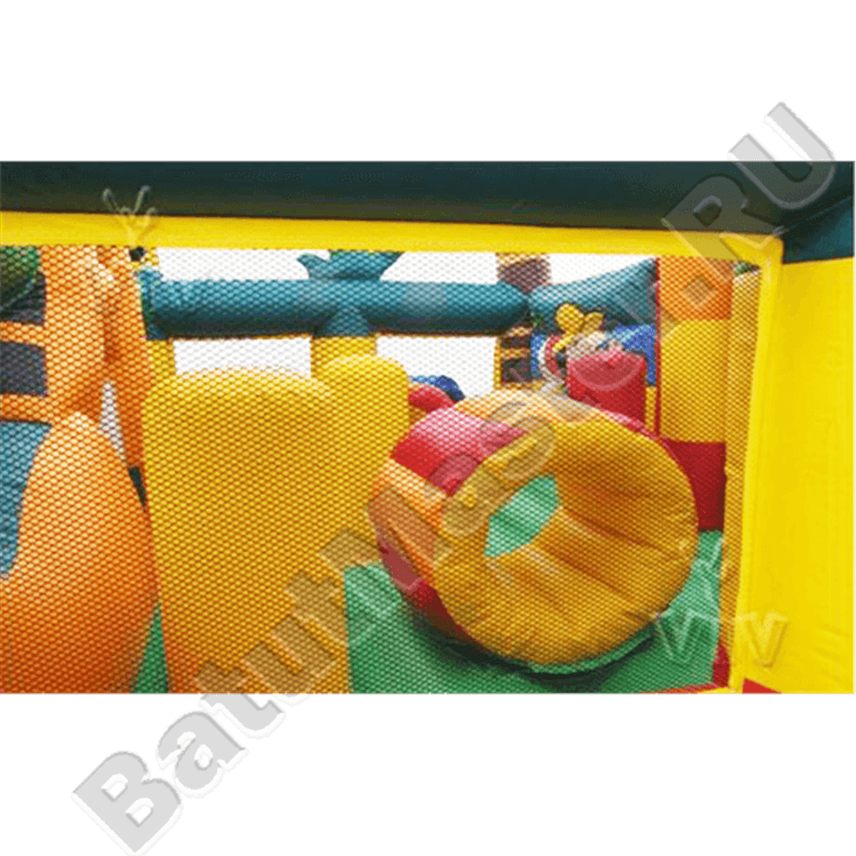 Впереди входа предусмотрен защитный порожек, препятствующий выпадению деток из батута. По периметру внутренней зоны расположены самые разные игровые снаряды – это цилиндры для перекатывания, вертикальные столбы-лабиринты, прыгательные фигурки и трамплины.