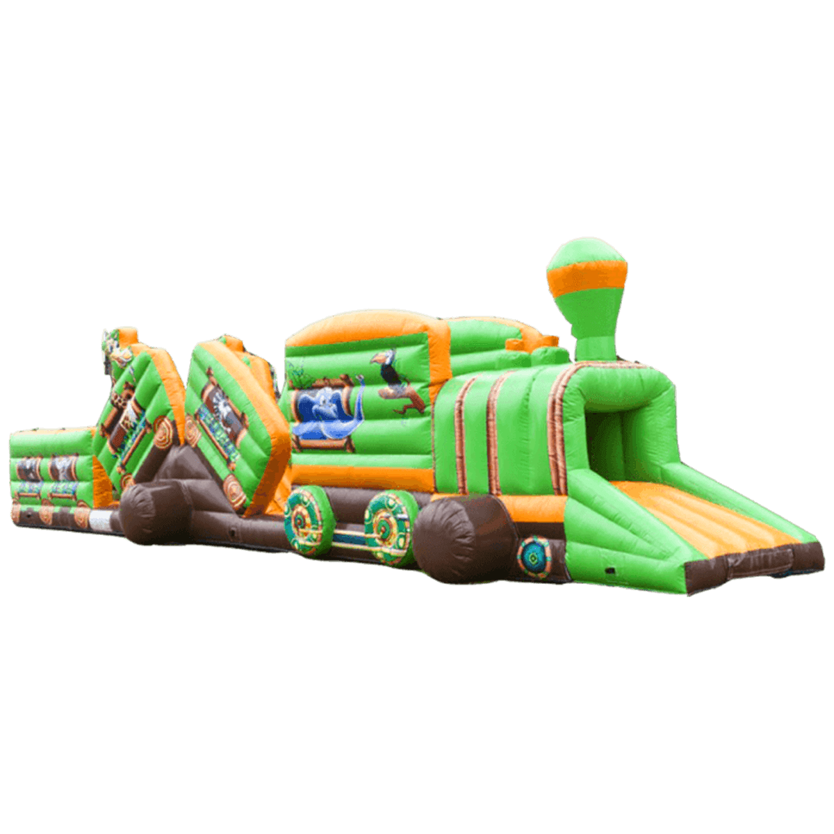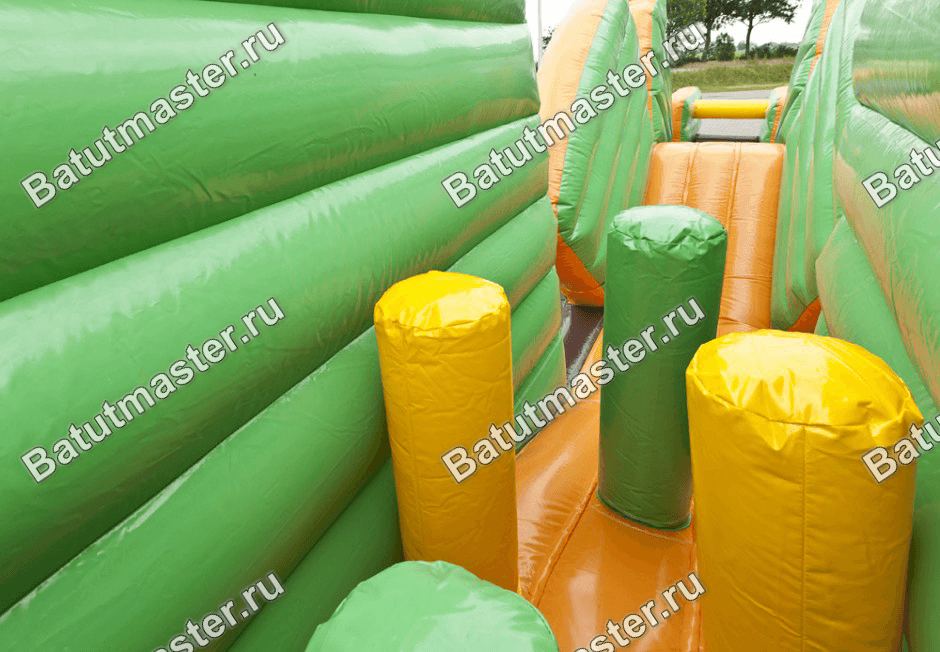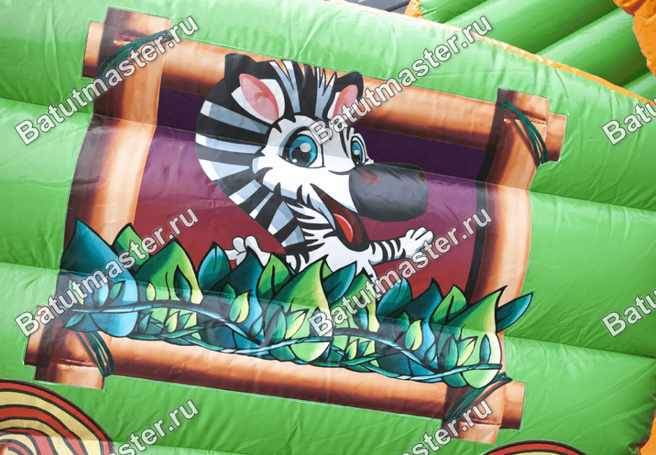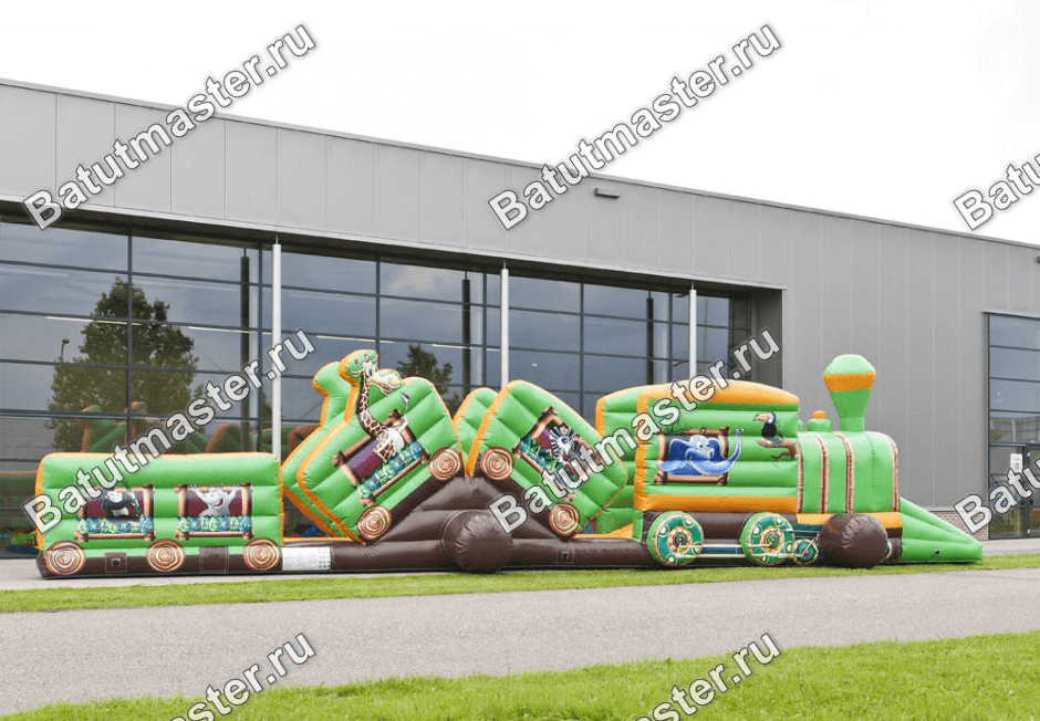 Батут-тоннель в виде огромного зелено-оранжевого паровоза с нарисованными окошками и изображенными внутри них южными животными. Слон, зебра, жираф и другие звери будто отправились в дальнее путешествие, и их соседями по месту в вагоне может стать любой желающий. Для каждого пассажира-животного выделен отдельный вагон, поэтому места хватит всем. Уличный батут сверху полностью открытый, поэтому внутри конструкции света предостаточно.