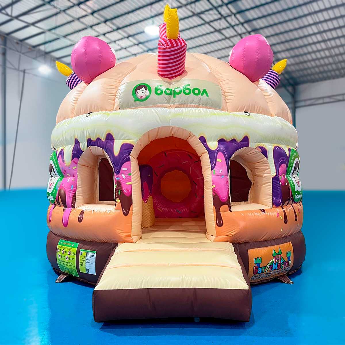Надувной батут «Торт» выполнен в оригинальной форме торта, украшенного шоколадной глазурью, розовой посыпкой и декоративными свечами. Размеры батута составляют 4 метра в длину, 4 метра в ширину и 3,5 метра в высоту. Внутри — просторная игровая зона, включающая надувные декоративные свечи и сладкий пончик.