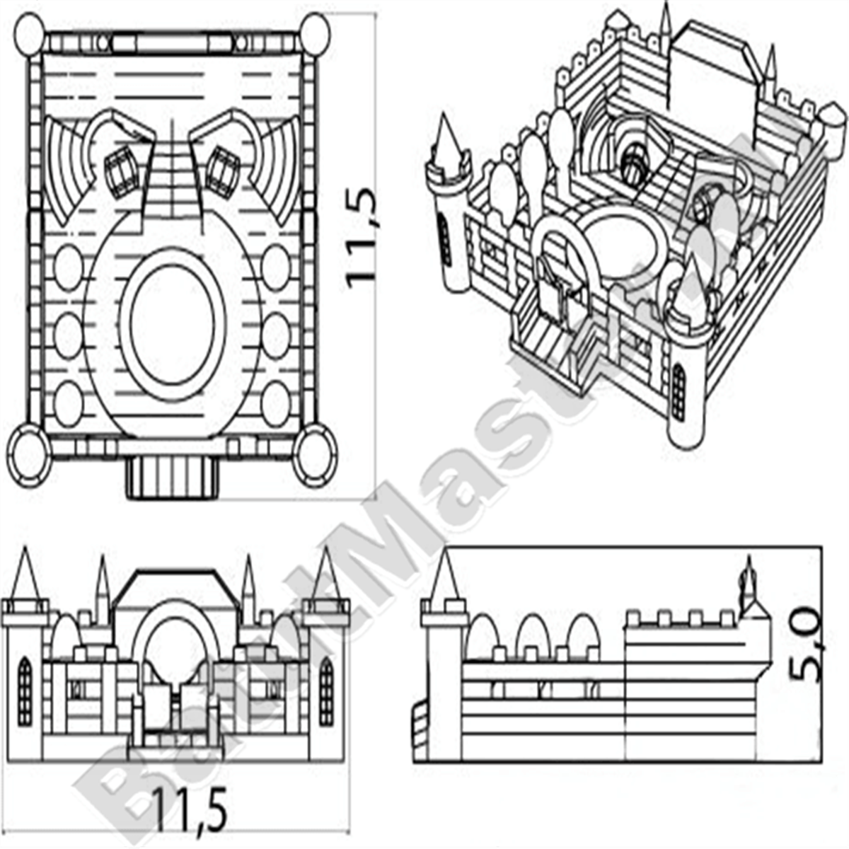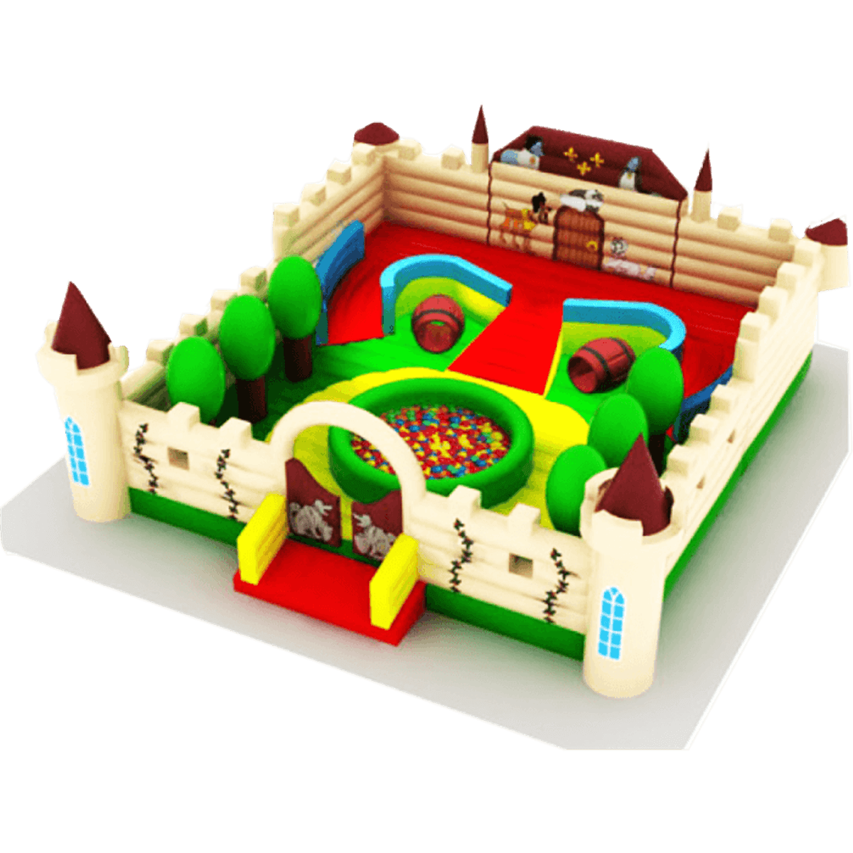 Спортивный комплекс «Три мушкетера» выполнен в виде тренировочной базы настоящих рыцарей, в нем много свободного пространства. По всему периметру игровой зоны имеется высокая стена, оформленная в виде кирпичной кладки. В углах расположены надувные деревья, которые можно использовать в качестве боксерской груши.