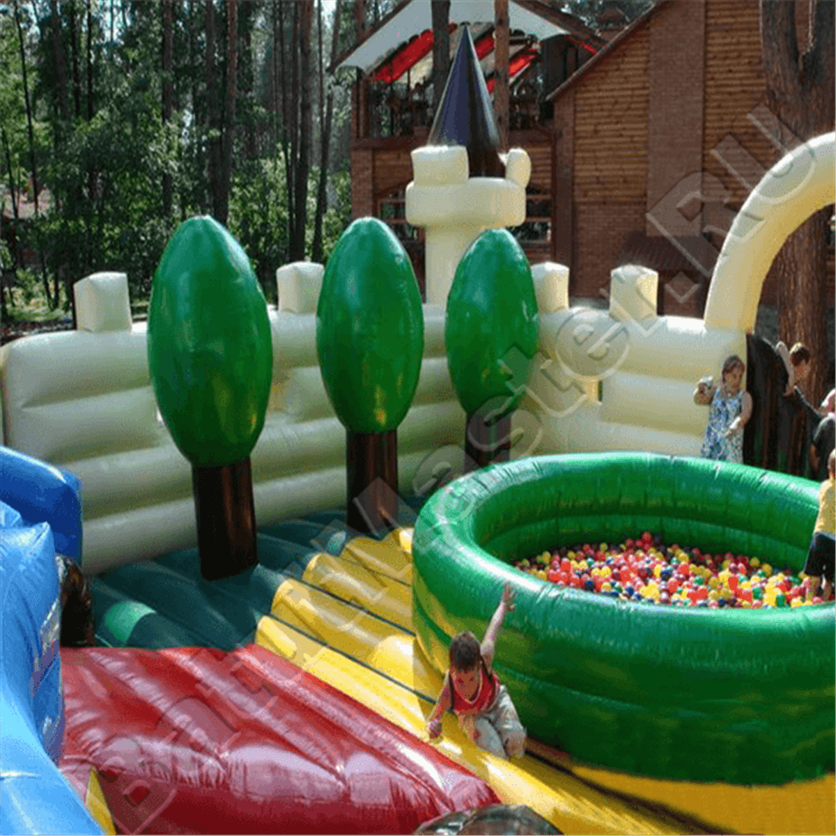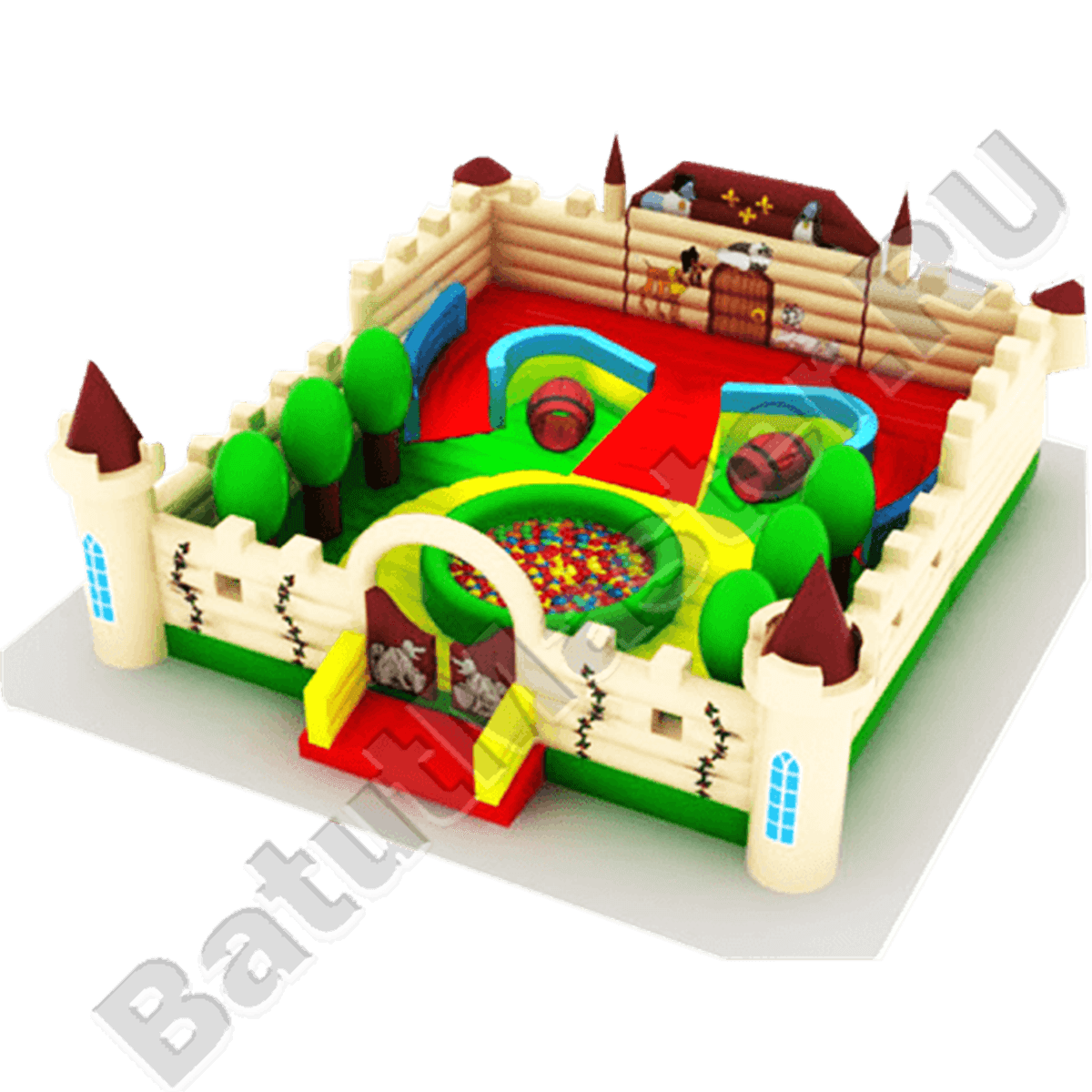 Вход внутрь расположен по центру, его ограждают надувные створки дверей, впереди имеется надувной порожек для безопасности посетителей. Центральная часть батута отведена для сухого бассейна, где можно прыгать и играть. Сзади на немного наклоненной поверхности установлены спортивные снаряды для лазания и прыгания, впереди имеется большая надувная площадка без дополнительных элементов. Задняя зона батута также свободна, что позволяет разным группам детей прыгать на мягком полотне, не мешая друг другу.
