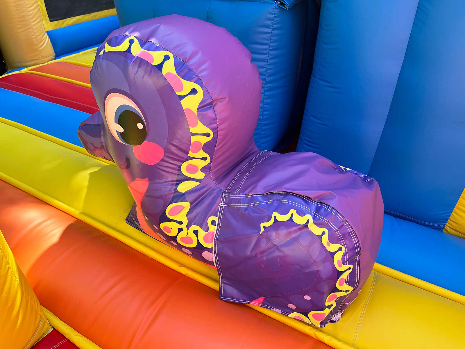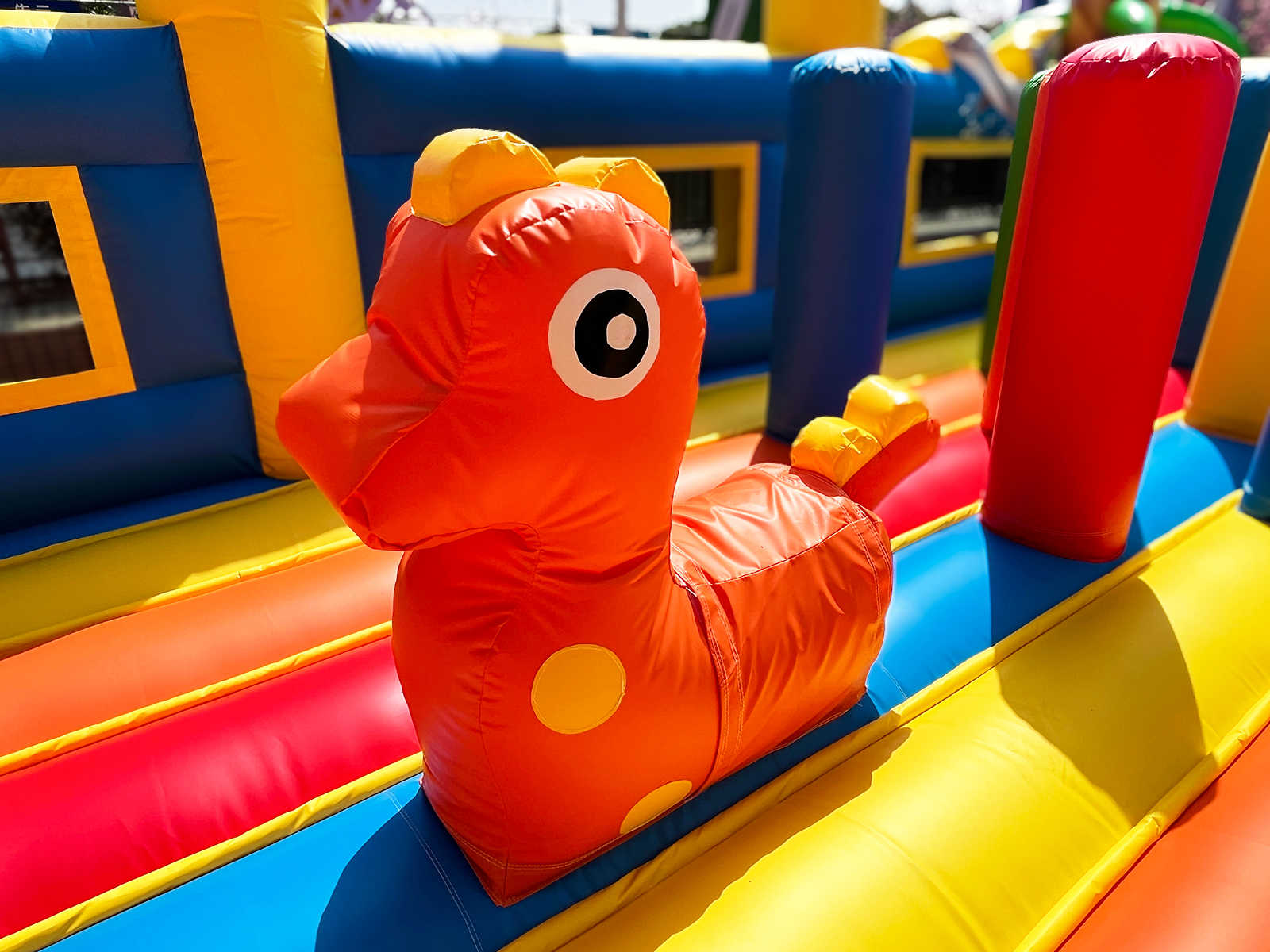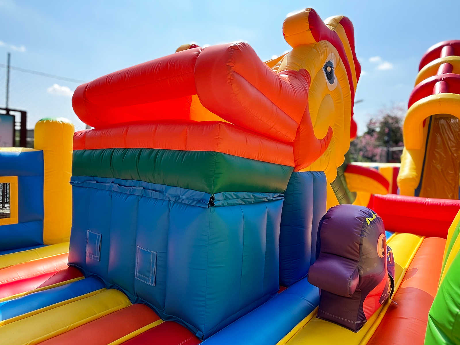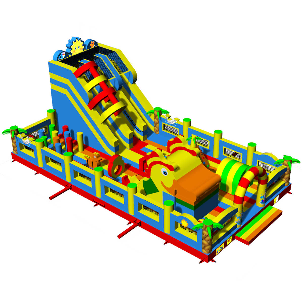 Одновременно в аттракционе могут находиться до 34 детей. Каждый элемент здесь продуман для активной игры: мягкие преграды, яркий тоннель, надувные зверушки, арки, столбики, скалодром и огромная горка, с которой спуск — настоящее приключение. Это целый мир, в котором ребёнок может прыгать, лазить, бегать и просто веселиться без остановки.