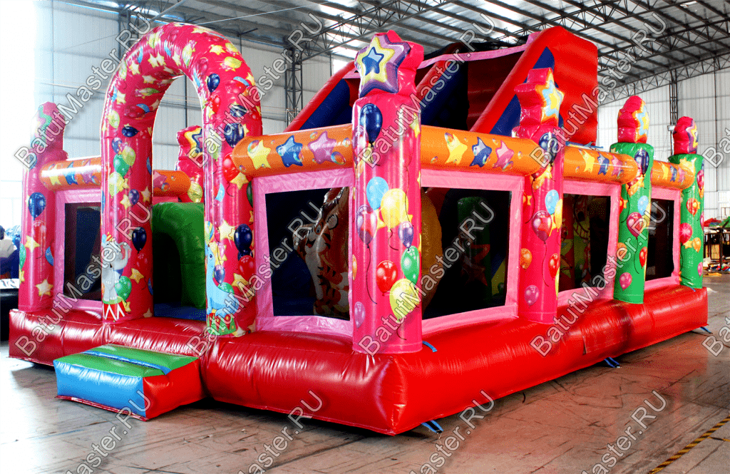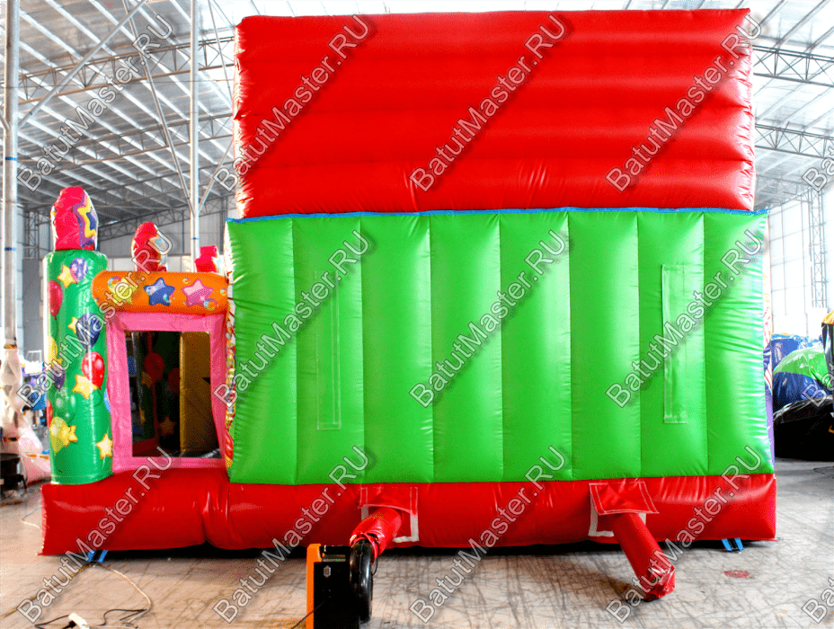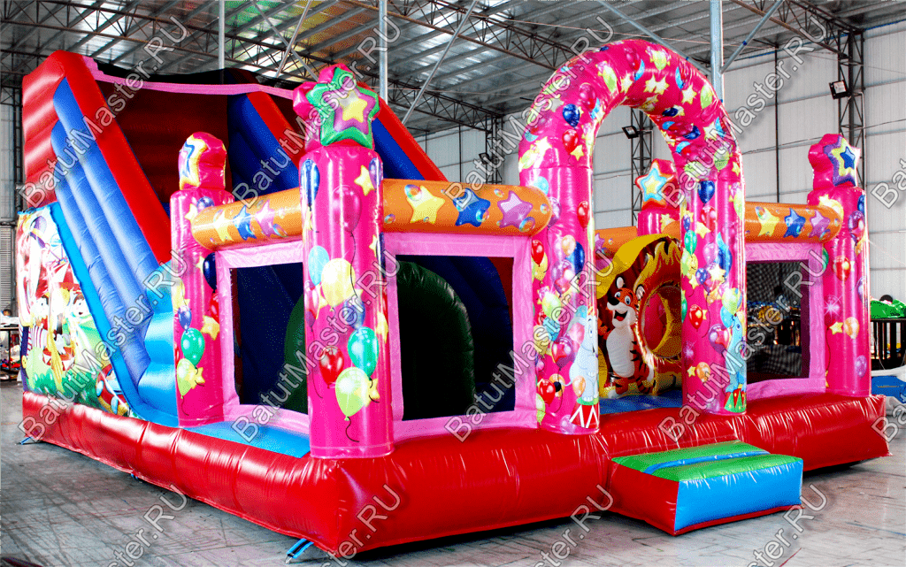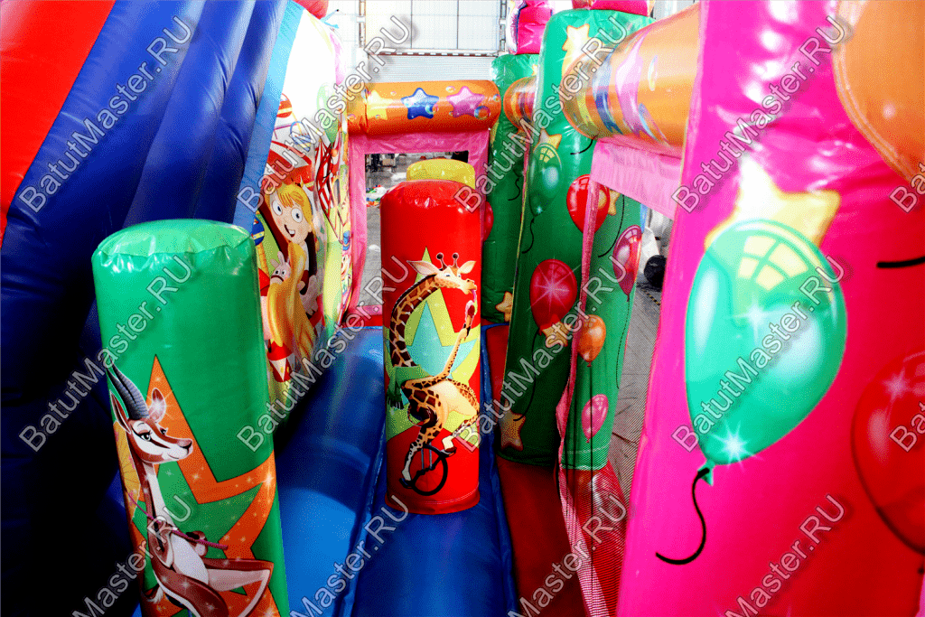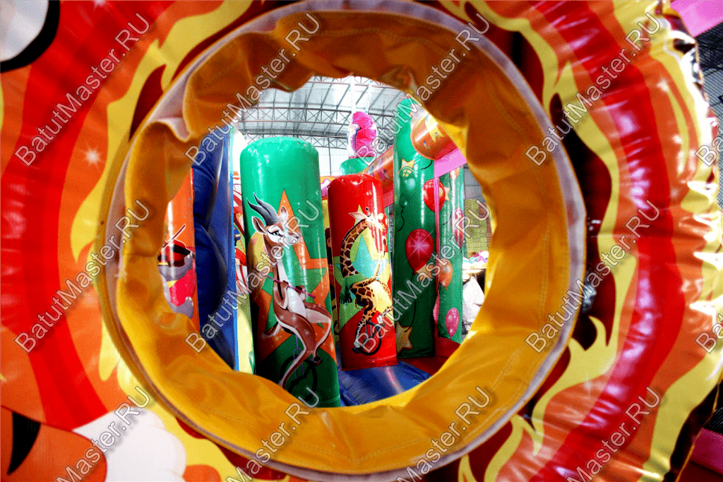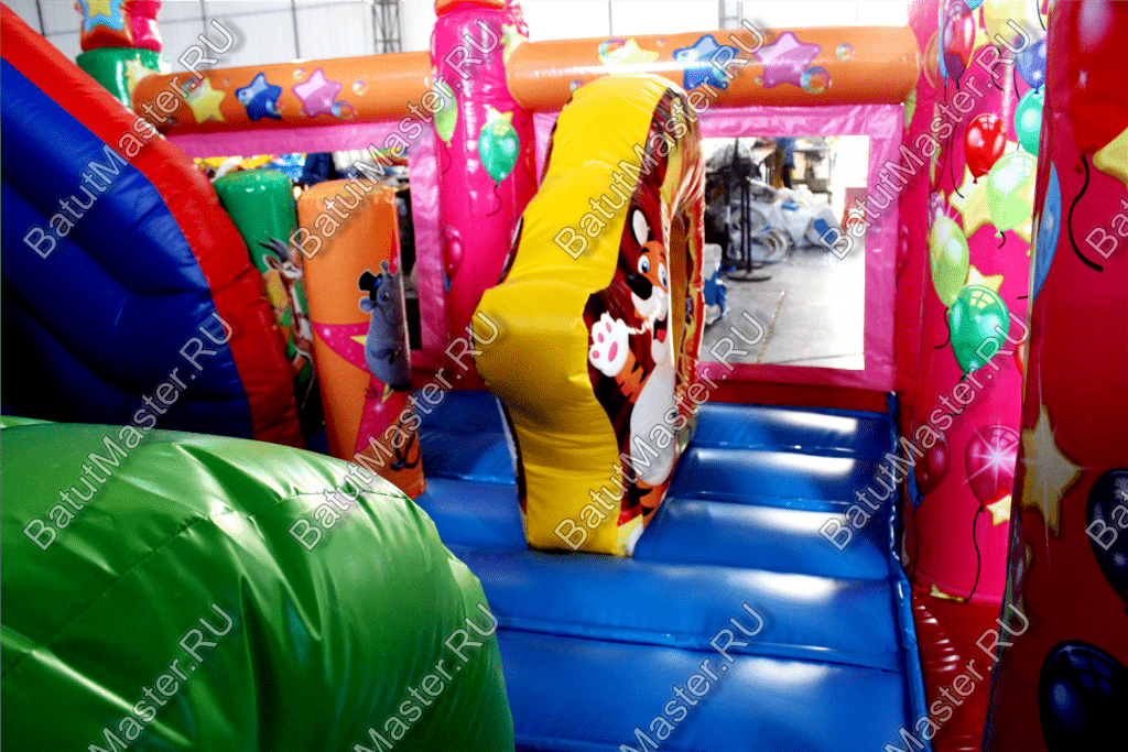 Внутри батута ребята встретят множество развлечений на любой вкус. Тут есть игровые фигуры и груши, с которыми можно весело играть. Одна из надувных фигур выполнена в виде тигра с горящим обручем, сквозь который можно пролезть. Также имеется и просторное место для активных игр и прыжков. Конечно, есть тут и горка с удобной боковой лесенкой.